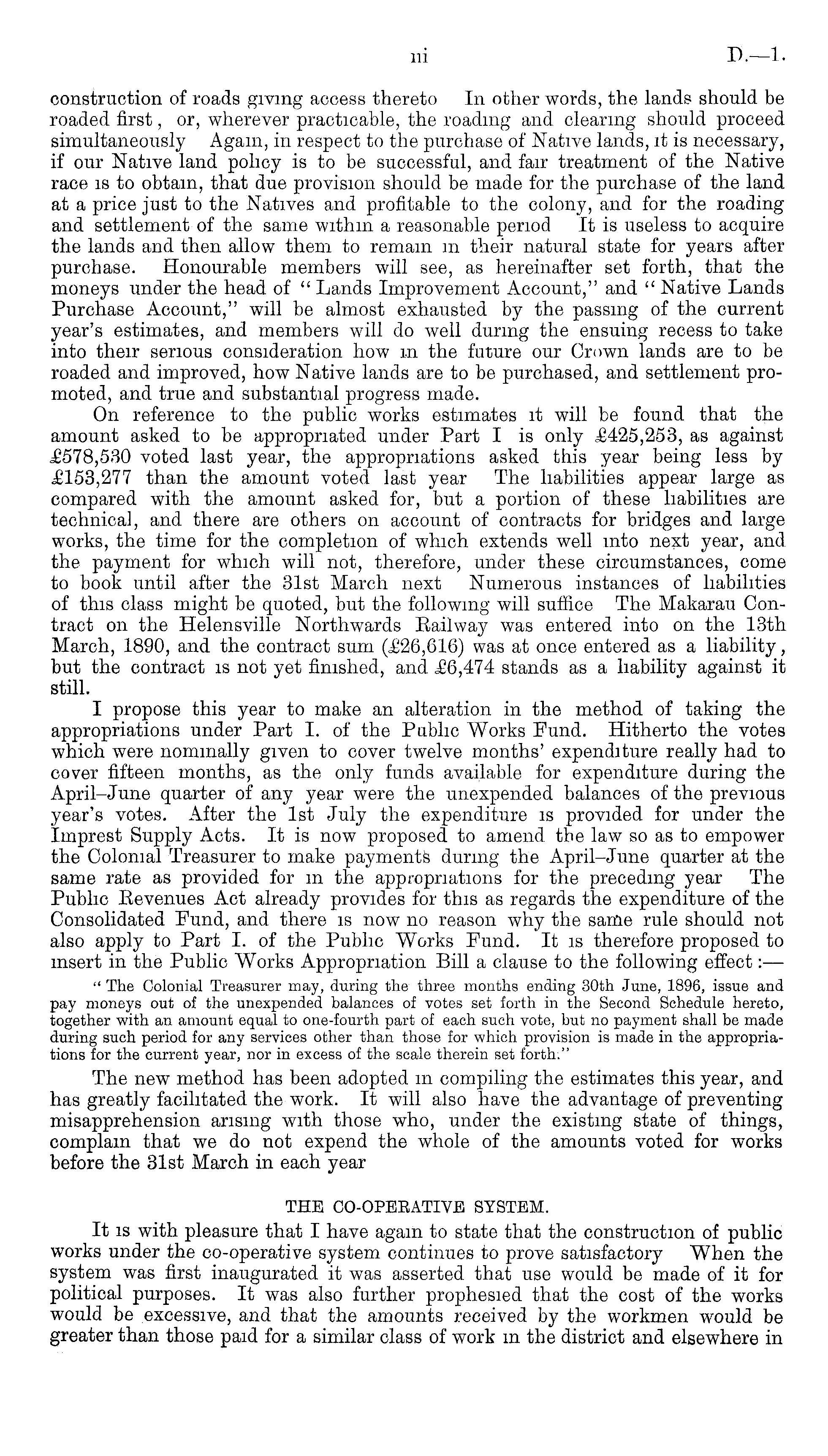 construction of roads giving access thereto In other words, the lands should be roaded first, or, wherever practicable, the roadmg and clearing should proceed simultaneously Again, in respect to the purchase of Native lands, it is necessary, if our Native land policy is to be successful, and fair treatment of the Native race is to obtain, that due provision should be made for the purchase of the land at a price just to the Natives and profitable to the colony, and for the roading and settlement of the same withm a reasonable period It is useless to acquire the lands and then allow them to remain m their natural state for years after purchase. Honourable members will see, as hereinafter set forth, that the moneys under the head of " Lands Improvement Account," and " Native Lands Purchase Account," will be almost exhausted by the passing of the current year's estimates, and members will do well during the ensuing recess to take into their serious consideration how in the future our Crown lands are to be roaded and improved, how Native lands are to be purchased, and settlement promoted, and true and substantial progress made. On reference to the public works estimates it will be found that the amount asked to be appropriated under Part I is only £425,253, as against £578,530 voted last year, the appropriations asked this year being less by £153,277 than the amount voted last year The liabilities appear large as compared with the amount asked for, but a portion of these liabilities are technical, and there are others on account of contracts for bridges and large works, the time for the completion of which extends well into next year, and the payment for which will not, therefore, under these circumstances, come to book until after the 31st March next Numerous instances of liabilities of this class might be quoted, but the following will suffice The Makarau Contract on the Helensville Northwards Eailway was entered into on the 13th March, 1890, and the contract sum (£26,616) was at once entered as a liability, but the contract is not yet finished, and £6,474 stands as a liability against it still. I propose this year to make an alteration in the method of taking the appropriations under Part I. of the Public Works Fund. Hitherto the votes which were nominally given to cover twelve months' expenditure really had to cover fifteen months, as the only funds available for expenditure during the April-June quarter of any year were the unexpended balances of the previous year's votes. After the Ist July the expenditure is provided for under the Imprest Supply Acts. It is now proposed to amend the law so as to empower the Colonial Treasurer to make payments during the April-June quarter at the same rate as provided for m the appropriations for the preceding year The Public Eevenues Act already provides for this as regards the expenditure of the Consolidated Fund, and there is now no reason why the same rule should not also apply to Part I. of the Public Works Fund. It is therefore proposed to insert in the Public Works Appropriation Bill a clause to the following effect: — " The Colonial Treasurer may, during the three months ending 30th June, 1896, issue and pay moneys out of the unexpended balances of votes set forth in the Second Schedule hereto, together with an amount equal to one-fourth part of each such vote, but no payment shall be made during such period for any services other than those for which provision is made in the appropriations for the current year, nor in excess of the scale therein set forth;" The new method has been adopted m compiling- the estimates this year, and has greatly facilitated the work. It will also have the advantage of preventing misapprehension arising with those who, under the existing state of things, complain that we do not expend the whole of the amounts voted for works before the 31st March in each year THE CO-OPERATIVE SYSTEM. It is with pleasure that I have again to state that the construction of public works under the co-operative system continues to prove satisfactory When the system was first inaugurated it was asserted that use would be made of it for political purposes. It was also further prophesied that the cost of the works would be excessive, and that the amounts received by the workmen would be greater than those paid for a similar class of work m the district and elsewhere in