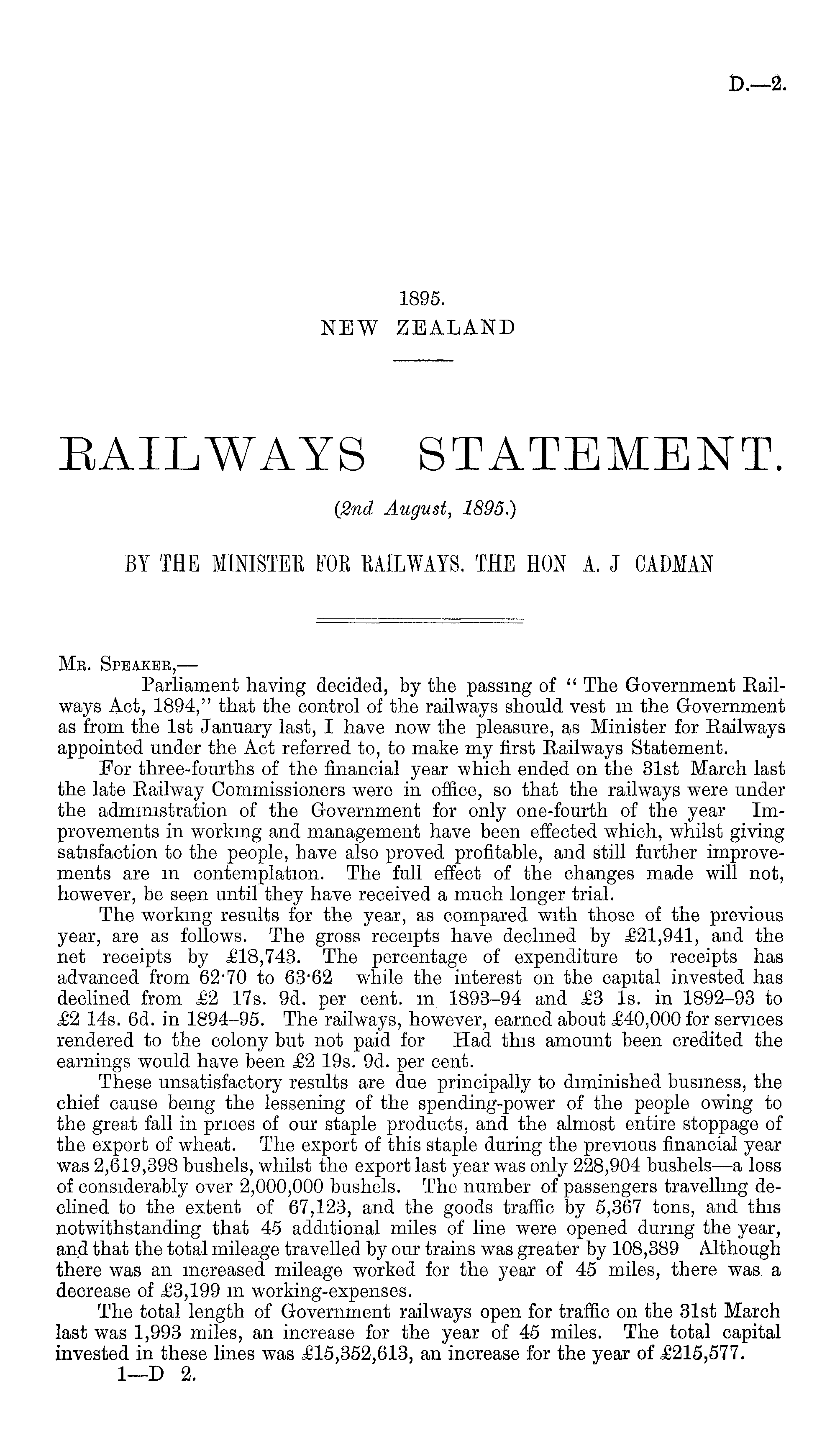 Me. Speakeb,— Parliament having decided, by the passing of " The Government Kailways Act, 1894," that the control of the railways should vest m the Government as from the Ist January last, I have now the pleasure, as Minister for Kailways appointed under the Act referred to, to make my first Railways Statement. For three-fourths of the financial year which ended on the 31st March last the late Railway Commissioners were in office, so that the railways were under the administration of the Government for only one-fourth of the year Improvements in working and management have been effected which, whilst giving satisfaction to the people, have also proved profitable, and still further improvements are m contemplation. The full effect of the changes made will not, however, be seen until they have received a much longer trial. The working results for the year, as compared with those of the previous year, are as follows. The gross receipts have declined by £21,941, and the net receipts by £18,743. The percentage of expenditure to receipts has advanced from 6270 to 63 # 62 while the interest on the capital invested has declined from £2 17s. 9d. per cent, in 1893-94 and £3 Is. in 1892-93 to £2 14s. 6d. in 1894-95. The railways, however, earned about £40,000 for services rendered to the colony but not paid for Had this amount been credited the earnings would have been £2 19s. 9d. per cent. These unsatisfactory results are due principally to diminished business, the chief cause being the lessening of the spending-power of the people owing to the great fall in prices of our staple products, and the almost entire stoppage of the export of wheat. The export of this staple during the previous financial year was 2,619,398 bushels, whilst the export last year was only 228,904 bushels —a loss of considerably over 2,000,000 bushels. The number of passengers travelling declined to the extent of 67,123, and the goods traffic by 5,367 tons, and this notwithstanding that 45 additional miles of line were opened during the year, and that the total mileage travelled by our trains was greater by 108,389 Although there was an increased mileage worked for the year of 45 miles, there was a decrease of £3,199 m working-expenses. The total length of Government railways open for traffic on the 31st March last was 1,993 miles, an increase for the year of 45 miles. The total capital invested in these lines was £15,352,613, an increase for the year of £215,577.