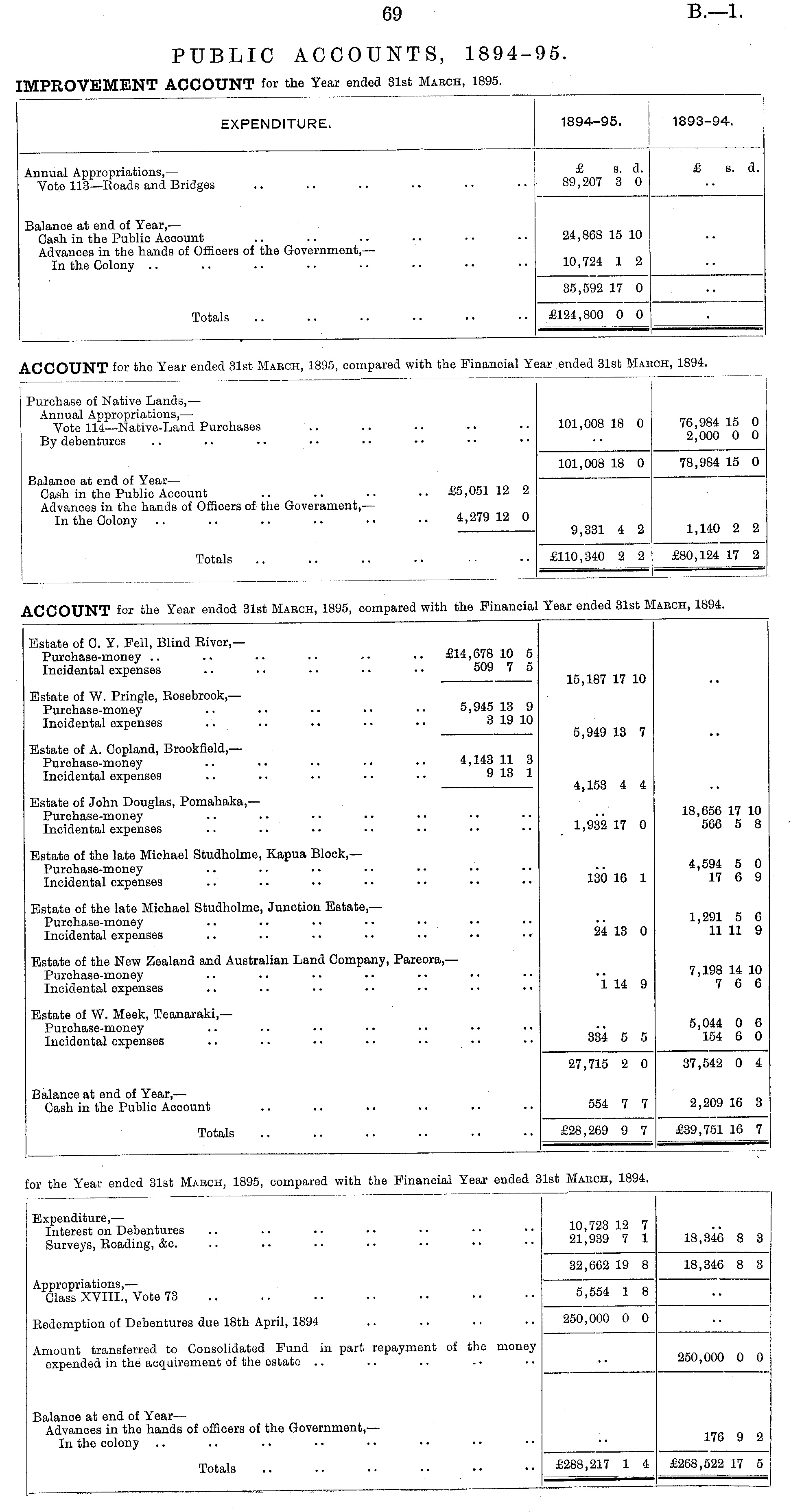 EXPENDITURE. i 1894-95. 1893-94. Annual Appropriations, — Vote 113—Eoads and Bridges £ s. d. 89,207 3 0 £ s. d. Balance at end of Year, — Cash in the Public Account Advances in the hands of Officers of the Government,— In the Colony 24,868 15 10 10,724 1 2 Totals 35,592 17 0 £124,800 0 0 ACCOUNT f° r the Year ended 31st Maech, 1895, compared with the Financial Yi sar ended 31st Mα: iCH, 1894. Purchase of Native Lands, — Annual Appropriations, — Vote 114—Native-Land Purchases By debentures 101,008 18 0 76,984 15 0 2,000 0 0 Balance at end of Year— Cash in the Public Account .. .. -• •• £5,05112 2 Advances in the hands of Officers of the Goverament, — IntheColony 4,279 12 0 101,008 18 0 78,984 15 0 9,331 4 2 1,140 2 2 Totals £80,124 17 2 £110,340 2 2 ACCOUNT for the Year ended 31st March, 1895, compared with the Financial Year ended 31st abch, 1894. Estate of C. Y. Pell, Blind River,— Purchase-money .. .. .. •• -• .. £14,678 10 5 Incidental expenses .. .. • ■ • • ■ • 5 °9 7 5 Estate of W. Pringle, Eosebrook,— Purchase-money .. •• •• •• ■• 5,945 13 9 Incidental expenses .. .. .. • • • • 3 19 10 15,187 17 10 5,949 13 7 Estate of A. Copland, Brookfield,— Purchase-money .. •• ■• •• •• 4,143 11 3 Incidental expenses .. .. -. ■ • • • 9 13 1 4,153 4 4 Estate of John Douglas, Pomahaka, — Purchase-money Incidental expenses 1,932 17 0 18,656 17 10 566 5 8 Estate of the late Michael Studholme, Kapua Block,— Purchase-money Incidental expenses 130 16 1 4,594 5 0 17 6 9 Estate of the late Michael Studholme, Junction Estate,— Purchase-money .. .. •. ■ • Incidental expenses 24 13 0 1,291 5 6 11 11 9 Estate of the New Zealand and Australian Land Company, Pareora,— Purchase-money Incidental expenses 'i 14 9 7,198 14 10 7 6 6 Estate of W. Meek, Teanaraki, — Purchase-money .. .. Incidental expenses 334 5 5 5,044 0 6 154 6 0 Balance at end of Year, — Cash in the Public Account 27,715 2 0 37,542 0 4 554 7 7 2,209 16 3 Totals £28,269 9 7 £39,751 16 7 :or the Year ended 31st Mabch, 1895, compared with the Financial Year ended list Maech, 1894. Expenditure, — Interest on Debentures Surveys, Roading, &c. 10,723 12 7 21,939 7 1 18,346 8 3 Appropriations, — Class XVIII., Vote 73 32,662 19 8 18,346 8 3 5,554 1 8 Eedemption of Debentures due 18th April, 1894 250,000 0 0 Amount transferred to Consolidated Fund in part repayment of the money expended in the acquirement of the estate 250,000 0 0 Balance at end of Year — Advances in the hands of officers of the Government, — In the colony 176 9 2 Totals £288,217 1 4 £268,522 17 5
