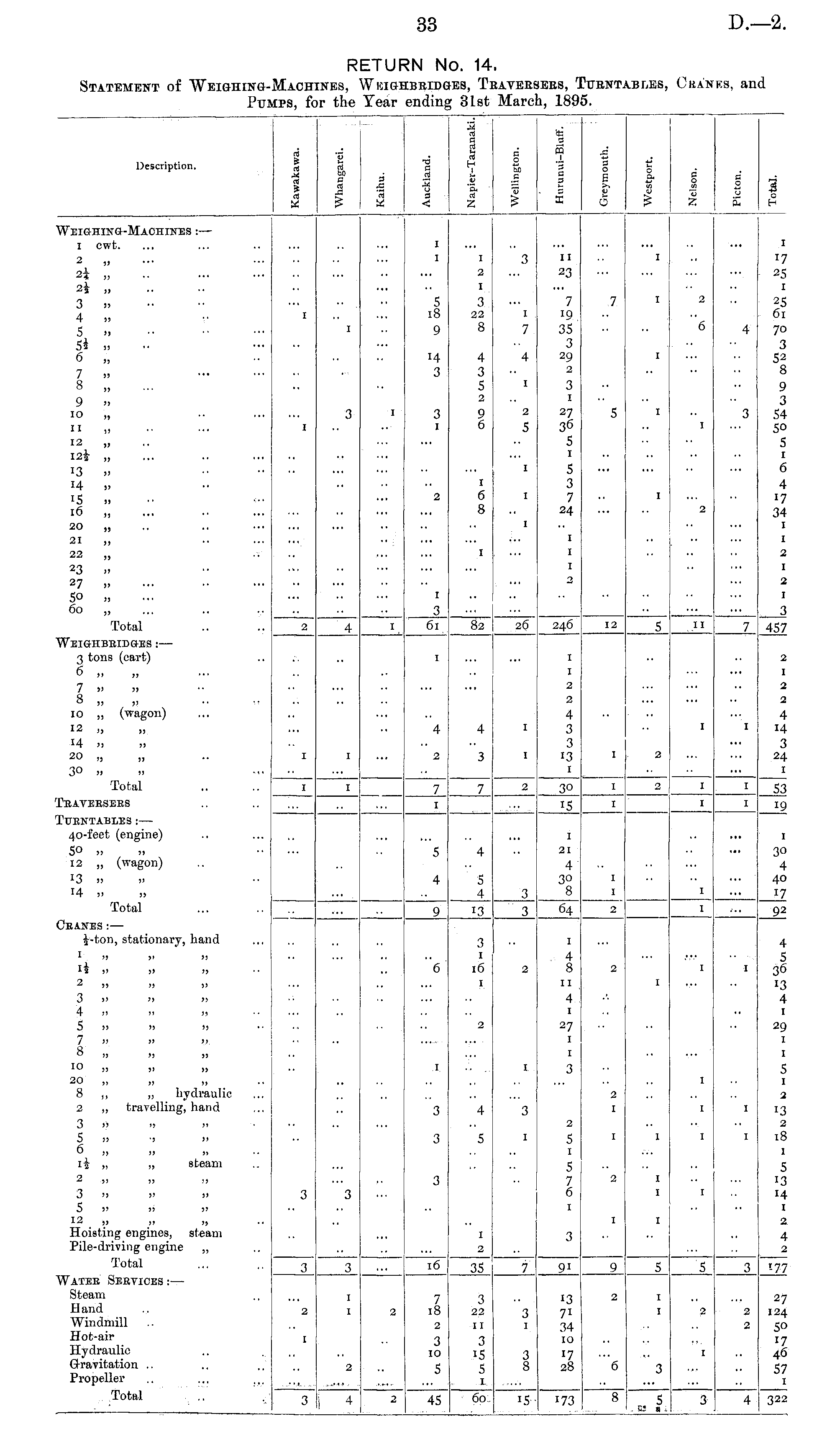RETURN No. 14. Statement of Weighing-Machines, Weighbridges, Traversers, Turntables, Cranes, and Pumps, for the Year ending 31st March, 1895.