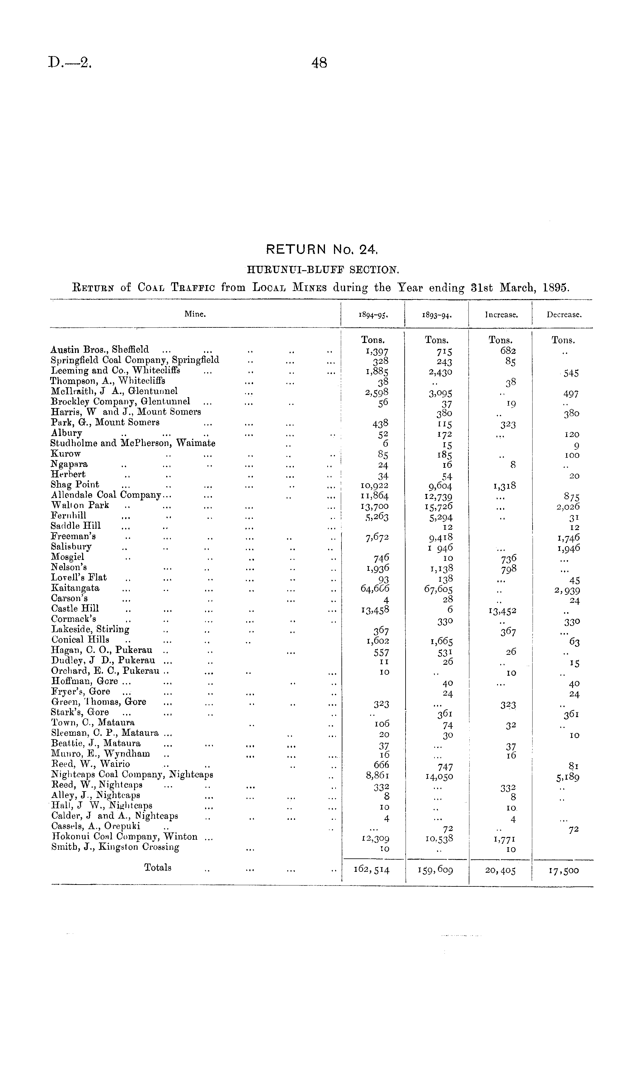 RETURN No. 24. HURUNUI-BLUFF SECTION. Return of Coal Traffic from Local Mines during the Year ending 31st March, 1895.