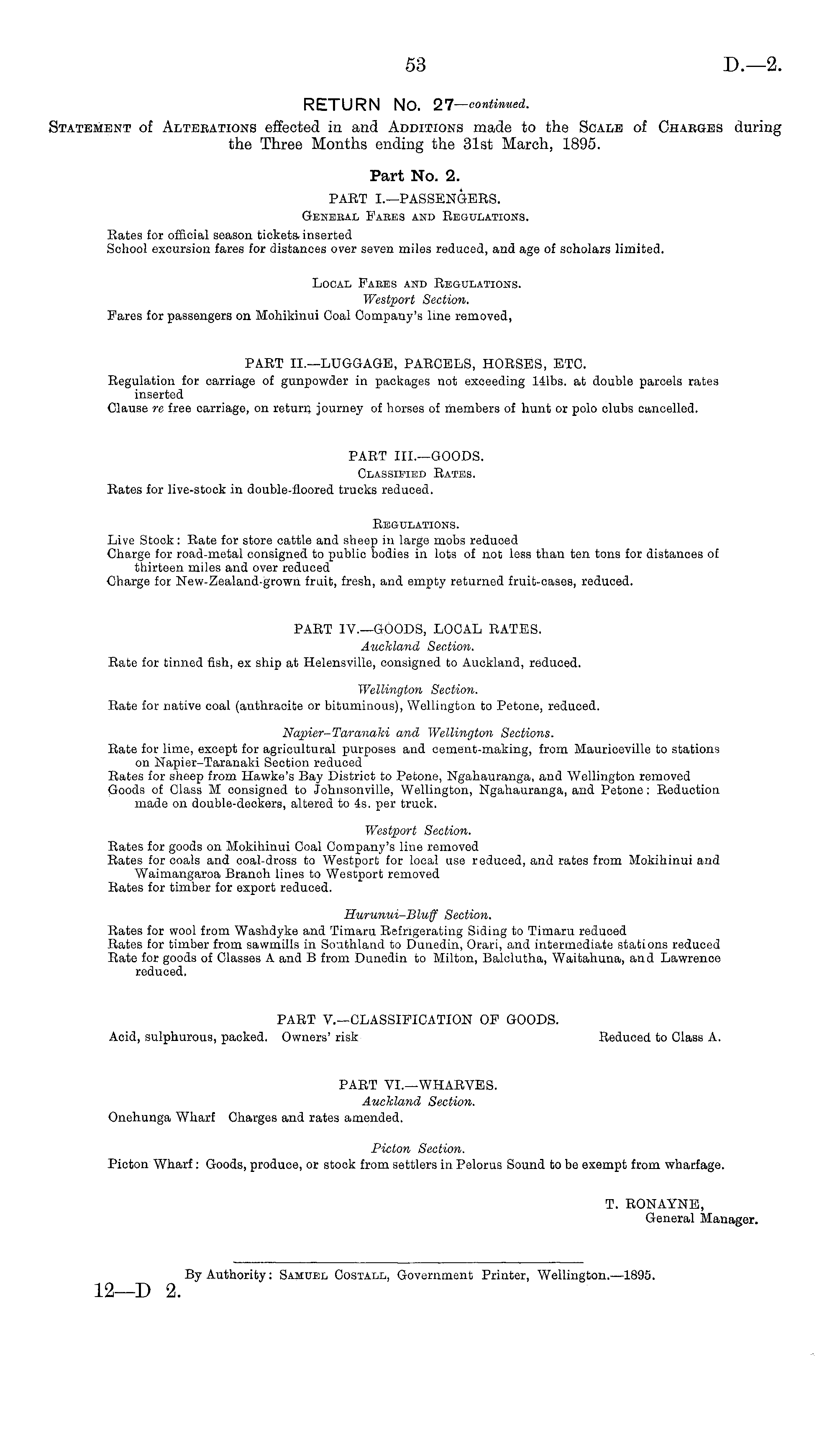 RETURN NO. 27— continued. Statement of Alterations effected in and Additions made to the Scale of Charges during the Three Months ending the 31st March, 1895. Part No. 2. PART I.—PASSENGERS. General Fares and Regulations. Rates for official season tickets, inserted School excursion fares for distances over seven miles reduced, and age of scholars limited. Local Fares and Regulations. Westport Section. I?ares for passengers on Mohikinui Coal Company's line removed, PART lI.—LUGGAGE, PARCELS, HORSES, ETC. Regulation for carriage of gunpowder in packages not exceeding 141bs. at double parcels rates inserted Clause re free carriage, on return journey of horses of members of hunt or polo clubs cancelled. PART lII.—GOODS. Classified Rates. Rates for live-stock in double-floored trucks reduced. Regulations. Live Stock: Rate for store cattle and sheep in large mobs reduced Charge for road-metal consigned to public bodies in lots of not less than ten tons for distances of thirteen miles and over reduced Charge for New-Zealand-grown fruit, fresh, and empty returned fruit-cases, reduced. PART IV.—GOODS, LOCAL RATES. Auckland Section. Rate for tinned fish, ex ship at Helensville, consigned to Auckland, reduced. Wellington Section. Rate for native coal (anthracite or bituminous), Wellington to Petone, reduced. Napier-Taranaki and Wellington Sections. Rate for lime, except for agricultural purposes and cement-making, from Mauriceville to stations on Napier-Taranaki Section reduced Rates for sheep from Hawke's Bay District to Petone, Ngahauranga, and Wellington removed Goods of Class M consigned to Johnsonville, Wellington, Ngahauranga, and Petone: Reduction made on double-deckers, altered to 4s. per truck. Westport Section. Rates for goods on Mokihinui Coal Company's line removed Rates for coals and coal-dross to Westport for local use reduced, and rates from Mokihinui and Waimangaroa Branoh lines to Westport removed Rates for timber for export reduced. Hurunui-Bluff Section. Rates for wool from Washdyke a.nd Timaru Refrigerating Siding to Timaru reduced Rates for timber from sawmills in Southland to Dunedin, Orari, and intermediate stations reduced Rate for goods of Classes A and B from Dunedin to Milton, Balclutha, Waitahuna, and Lawrence reduced. PART V.—CLASSIFICATION OF GOODS. Acid, sulphurous, packed. Owners' risk Reduced to Class A. PART VI.—WHARVES. Auckland Section. Onehunga Wharf Charges and rates amended. Picton Section. Picton Wharf : Goods, produce, or stock from settlers in Pelorus Sound to be exempt from wharfage. T. RONAYNE, General Manager. By Authority: Samuel Costall, Government Printer, Wellington.—lB9s.