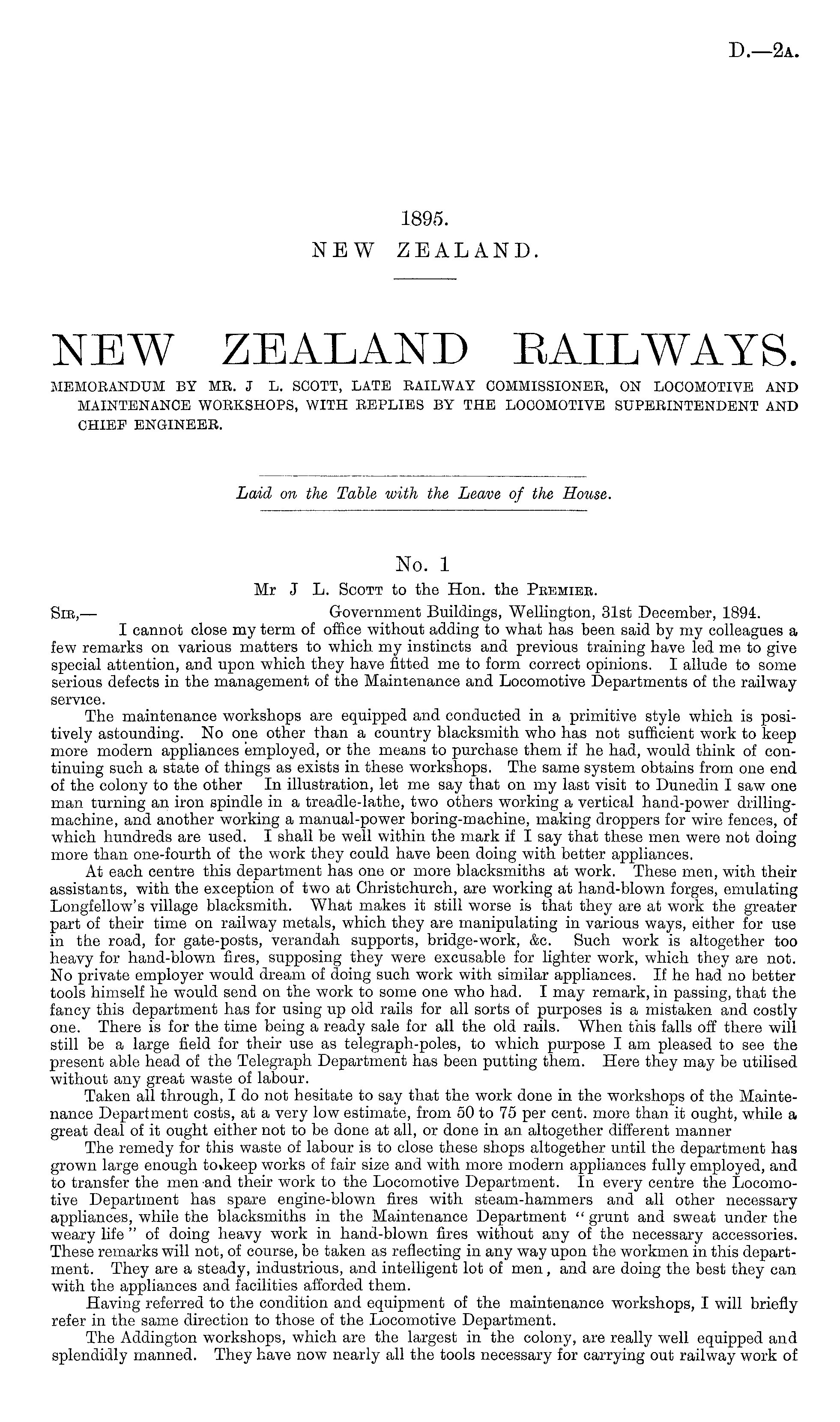 NEW ZEALAND RAILWAYS. MEMORANDUM BY MR. J.L. SCOTT, LATE RAILWAY COMMISSIONER, ON LOCOMOTIVE AND MAINTENANCE WORKSHOPS, WITH REPLIES BY THE LOCOMOTIVE SUPERINTENDENT AND CHIEF ENGINEER.