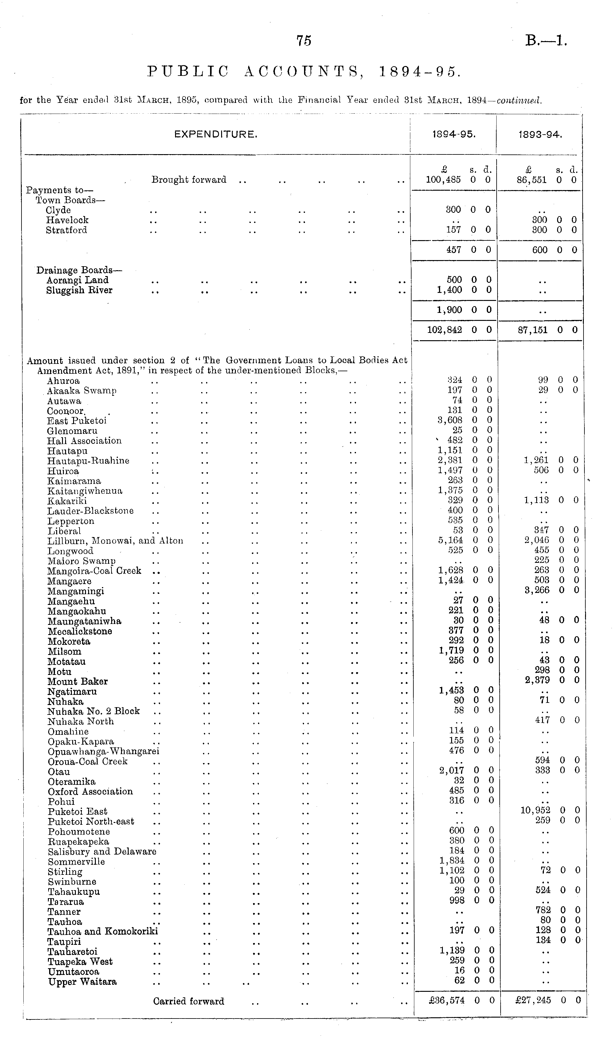 £ s. d. 100,485 0 0 £ a. d. 86,551 0 0 Brought forward 'ayments to— Town Boards — Clyde Havelock Stratford 300 0 0 157 0 0 300 0 0 300 0 0 457 0 0 600 0 0 Drainage Boards — Aorangi Land Sluggish Kiver 500 0 0 1,400 0 0 1,900 0 0 102,842 0 0 87,151 0 0 imount issued under section 2 of " The Government Loans to Local Bodies Act Amendment Act, 1891," in respect of the under-mentioned Blocks, — Ahuroa Akaaka Swamp Autawa Coortoor. East Puketoi Glenomaru Hall Association Hautapu Hautapu-Buahine Huiroa Kaimarama Kaitaugiwhenua Kakariki Lauder-Blackstone Lepperton Liberal Lillburn, Monowai, and Alton Longwood Maioro Swamp Mangoira-Ooal Greek Mangaere Mangamingi Mangaehu .. .. .. .. .. - .. Mangaokahu Maungataniwha Mecalickstone Mokoreta Milsom Motatau Motu Mount Baker Ngatimaru Nuhaka Nuhaka No. 2 Block .. Nuhaka North Omaliine Opaku-Kapara Opuawh an ga-Wh angarei Oroua-Coal Creek Otau Oteramika Oxford Association Pohui Puketoi Bast Puketoi North-east Pohoumotene Euapekapeka Salisbury and Delaware Sommerville Stirling Swinburne Tabaukupu Tararua Tanner Tauhoa Tauhoa and Komokoriki Taupiri Tauharetoi Tuapeka West Umutaoroa Upper Waitara 324 0 0 197 0 0 74 0 0 131 0 0 3,608 0 0 25 0 0 • 482 0 0 1,151. 0 0 2,381 0 0 1,497 0 0 263 0 0 1,375 0 0 329 0 0 400 0 0 535 0 0 53 0 0 5,164 0 0 525 0 0 1,628 0 0 1,424 0 0 27 0 0 221 0 0 30 0 0 377 0 0 292 0 0 1,719 0 0 256 0 0 99 0 0 29 0 0 1,261 0 0 506 0 0 1,113 0 0 347 0 0 2,046 0 0 455 0 0 225 0 0 263 0 0 503 0 0 3,266 0 0 48 0 0 18 0 0 43 0 0 298 0 0 2,379 0 0 1,453 0 0 80 0 0 58 0 0 71 0 0 417 0 0 114 0 0 155 0 0 476 0 0 2,017 0 0 32 0 0 485 0 0 316 0 0 594 0 0 333 0 0 10,952 0 0 259 0 0 600 0 0 380 0 0 184 0 0 1,834 0 0 1,102 0 0 100 0 0 29 0 0 998 0 0 72 0 0 524 0 0 197 0 0 782 0 0 80 0 0 128 0 0 134 0 0 1,139 0 0 259 0 0 16 0 0 62 0 0 Carried forward .. .. .. £36,574 0 0 £27,245