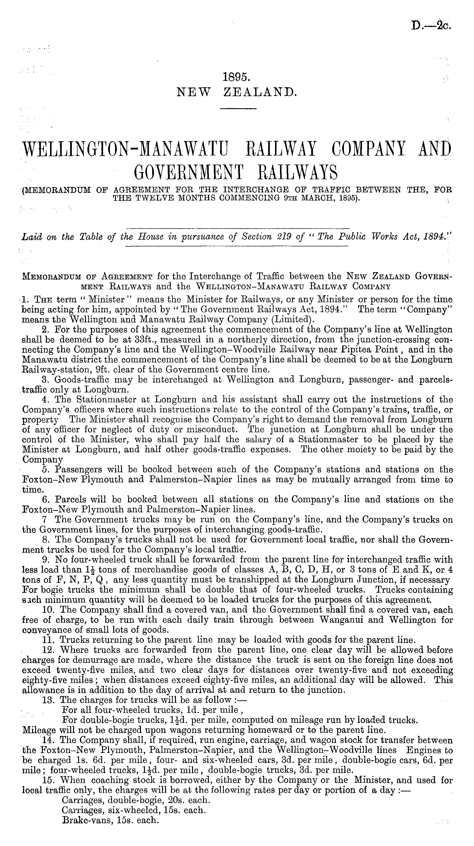 WELLINGTON-MANAWATU RAILWAY COMPANY AND GOVERNMENT RAILWAYS (MEMORANDUM OF AGREEMENT FOR THE INTERCHANGE OF TRAFFIC BETWEEN THE, FOR THE TWELVE MONTHS COMMENCING 9th MARCH, 1895).