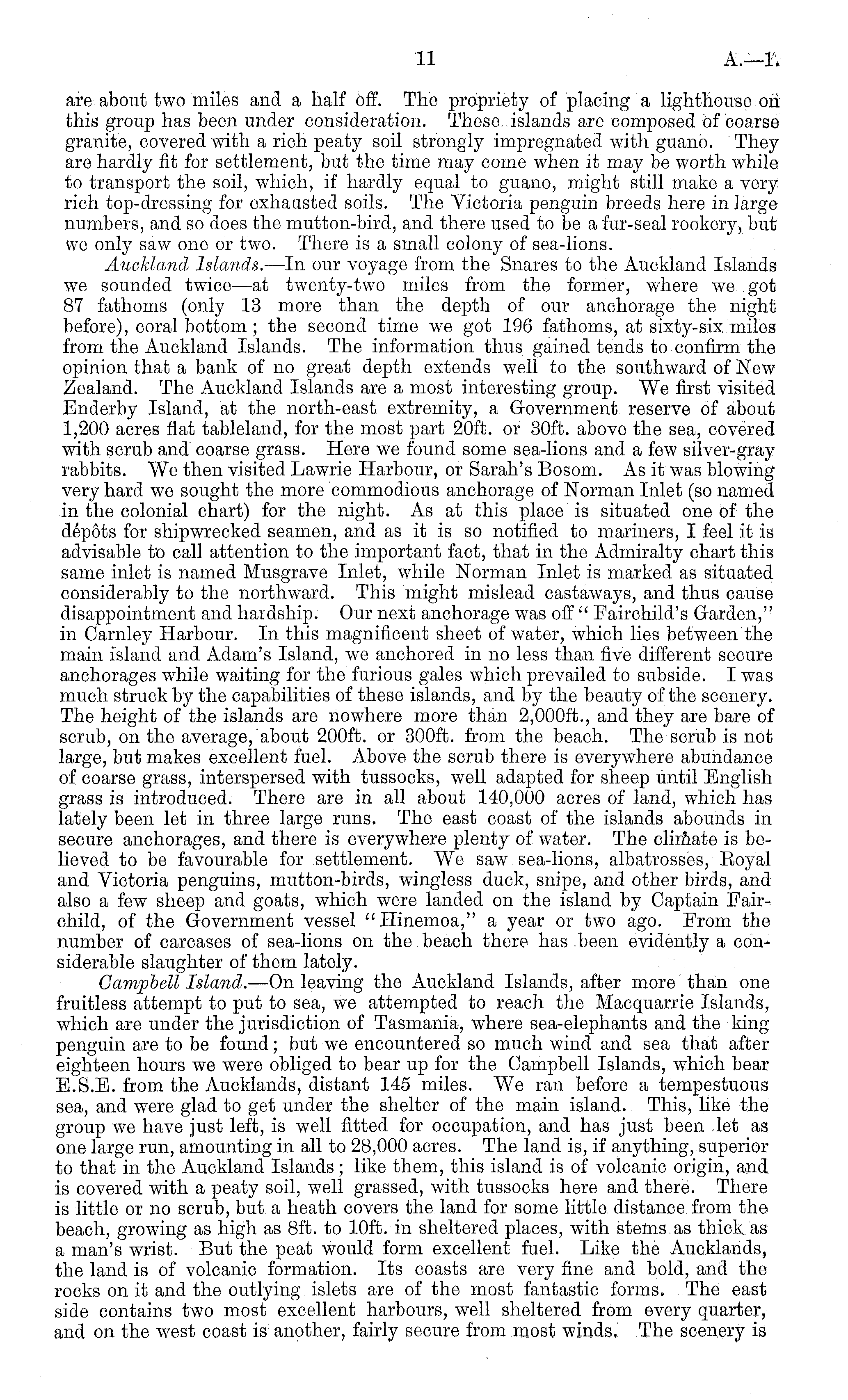 are about two miles and a half off. The propriety of placing a lighthouse oh this group has been under consideration. These islands are composed of coarse granite, covered with a rich peaty soil strongly impregnated with guano. They are hardly fit for settlement, but the time may come when it may be worth while to transport the soil, which, if hardly equal to guano, might still make a very rich top-dressing for exhausted soils. The Victoria penguin breeds here in large numbers, and so does the mutton-bird, and there used to be a fur-seal rookery, but we only saw one or two. There is a small colony of sea-lions. Auckland Islands. —In our voyage from the Snares to the Auckland Islands we sounded twice —at twenty-two miles from the former, where we got 87 fathoms (only 13 more than the depth of our anchorage the night before), coral bottom ; the second time we got 196 fathoms, at sixty-six miles from the Auckland Islands. The information thus gained tends to confirm the opinion that a bank of no great depth extends well to the southward of New Zealand. The Auckland Islands are a most interesting group. We first visited Enderby Island, at the north-east extremity, a Government reserve of about 1,200 acres flat tableland, for the most part 20ft. or 30ft. above the sea, covered with scrub and coarse grass. Here we found some sea-lions and a few silver-gray rabbits. We then visited Lawrie Harbour, or Sarah's Bosom. As it was blowing very hard we sought the more commodious anchorage of Norman Inlet (so named in the colonial chart) for the night. As at this place is situated one of the depots for shipwrecked seamen, and as it is so notified to mariners, I feel it is advisable to call attention to the important fact, that in the Admiralty chart this same inlet is named Musgrave Inlet, while Norman Inlet is marked as situated considerably to the northward. This might mislead castaways, and thus cause disappointment and hardship. Our next anchorage was off " Fairchild's Garden," in Carnley Harbour. In this magnificent sheet of water, which lies between the main island and Adam's Island, we anchored in no less than five different secure anchorages while waiting for the furious gales which prevailed to subside. I was much struck by the capabilities of these islands, and by the beauty of the scenery. The height of the islands are nowhere more than 2,000 ft., and they are bare of scrub, on the average, about 200 ft. or 300 ft. from the beach. The scrub is not large, but makes excellent fuel. Above the scrub there is everywhere abundance of coarse grass, interspersed with tussocks, well adapted for sheep until English grass is introduced. There are in all about 140,000 acres of land, which has lately been let in three large runs. The east coast of the islands abounds in secure anchorages, and there is everywhere plenty of water. The climate is believed to be favourable for settlement. We saw sea-lions, albatrosses, Eoyal and Victoria penguins, mutton-birds, wingless duck, snipe, and other birds, and also a few sheep and goats, which were Landed on the island by Captain Fairchild, of the Government vessel "Hinemoa," a year or two ago. From the number of carcases of sea-lions on the beach there has been evidently a considerable slaughter of them lately. Campbell Island. —On leaving the Auckland Islands, after more than one fruitless attempt to put to sea, we attempted to reach the Macquarrie Islands, which are under the jurisdiction of Tasmania, where sea-elephants and the king penguin are to be found; but we encountered so much wind and sea that after eighteen hours we were obliged to bear up for the Campbell Islands, which bear E.S.E. from the Aucklands, distant 145 miles. We ran before a tempestuous sea, and were glad to get under the shelter of the main island. This, like the group we have just left, is well fitted for occupation, and has just been let as one large run, amounting in all to 28,000 acres. The land is, if anything, superior to that in the Auckland Islands; like them, this island is of volcanic origin, and is covered with a peaty soil, well grassed, with tussocks here and there. There is little or no scrub, but a heath covers the land for some little distance from the beach, growing as high as Bft. to 10ft. in sheltered places, with stems as thick as a man's wrist. But the peat would form excellent fuel. Like the Aucklands, the land is of volcanic formation. Its coasts are very fine and bold, and the rocks on it and the outlying islets are of the most fantastic forms. The east side contains two most excellent harbours, well sheltered from every quarter, and on the west coast is another, fairly secure from most winds. The scenery is