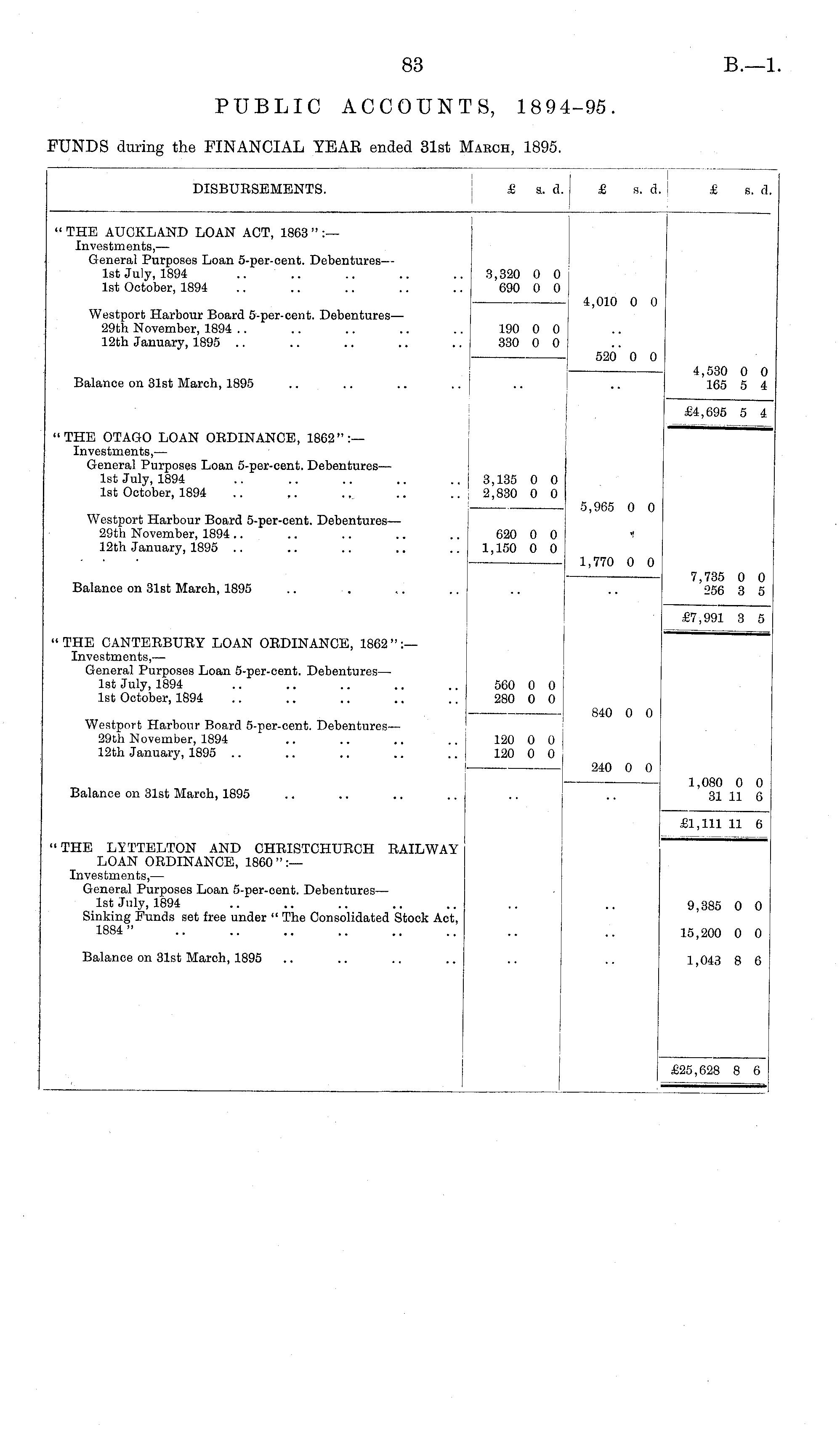 a. s. s. " THE AUCKLAND LOAN ACT, 1863 " :— Investments, — General Purposes Loan 5-per-oent. Debentures— 1st July, 1894 1st October, 1894 3,320 0 0 690 0 0 Westport Harbour Board 5-per-eent. Debentures— 29th November, 1894 12th January, 1895 4,010 0 0 190 0 0 330 0 0 520 0 0 Balance on 31st March, 1895 4,530 0 0 165 5 4 "THE OTAGO LOAN ORDINANCE, 1862":— Investments, — General Purposes Loan 5-per-cent. Debentures— 1st July, 1894 1st October, 1894 £4,695 5 4 3,135 0 0 2,830 0 0 Westport Harbour Board 5-per-cent. Debentures— 29th November, 1894 12th January, 1895 5,965 0 0 620 0 0 1,150 0 0 1,770 0 0 Balance on 31st March, 1895 V,735 0 0 256 3 5 "THE CANTERBURY LOAN ORDINANCE, 1862":— Investments, — General Purposes Loan 5-per-cent. Debentures— 1st July, 1894 1st October, 1894 £7,991 3 5 560 0 0 280 0 0 Westport Harbour Board 5-per-cent. Debentures— 29th November, 1894 12th January, 1895 840 0 0 120 0 0 120 0 0 240 0 0 Balance on 31st March, 1895 1,080 0 0 31 11 6 "THE LYTTELTON AND CHRISTCHURCH RAILWAY LOAN ORDINANCE, I860":— Investments, — General Purposes Loan 5-per-cent. Debentures— 1st July, 1894 Sinking Funds set free under " The Consolidated Stock Act, 1884 " £1,111 11 6 9,385 0 0 15,200 0 0 Balance on 31st March, 1895 1,043 8 6 £25 628 8 6