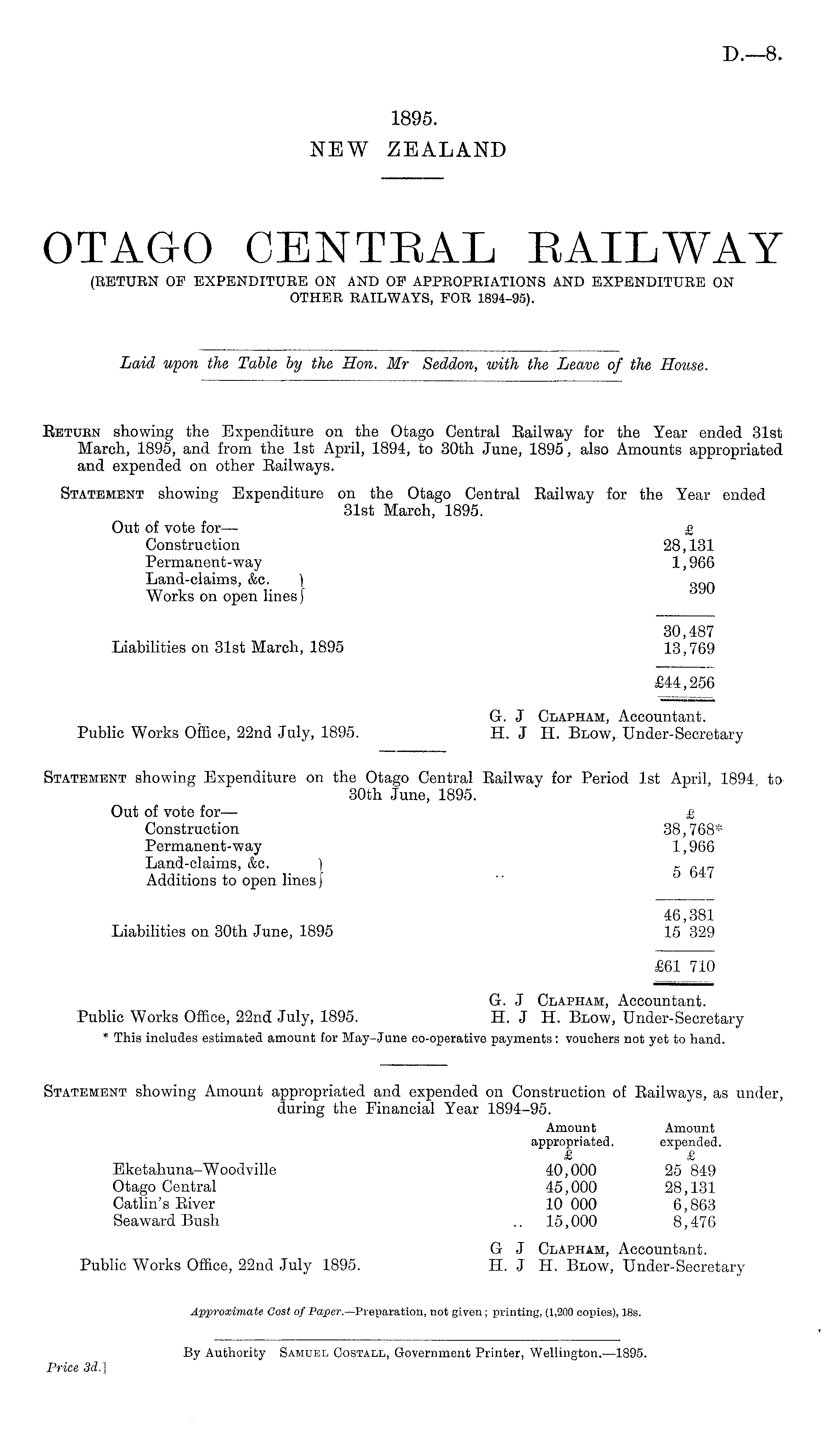 OTAGO CENTRAL RAILWAY (RETURN OF EXPENDITURE ON AND OF APPROPRIATIONS AND EXPENDITURE ON OTHER RAILWAYS, FOR 1894-95).