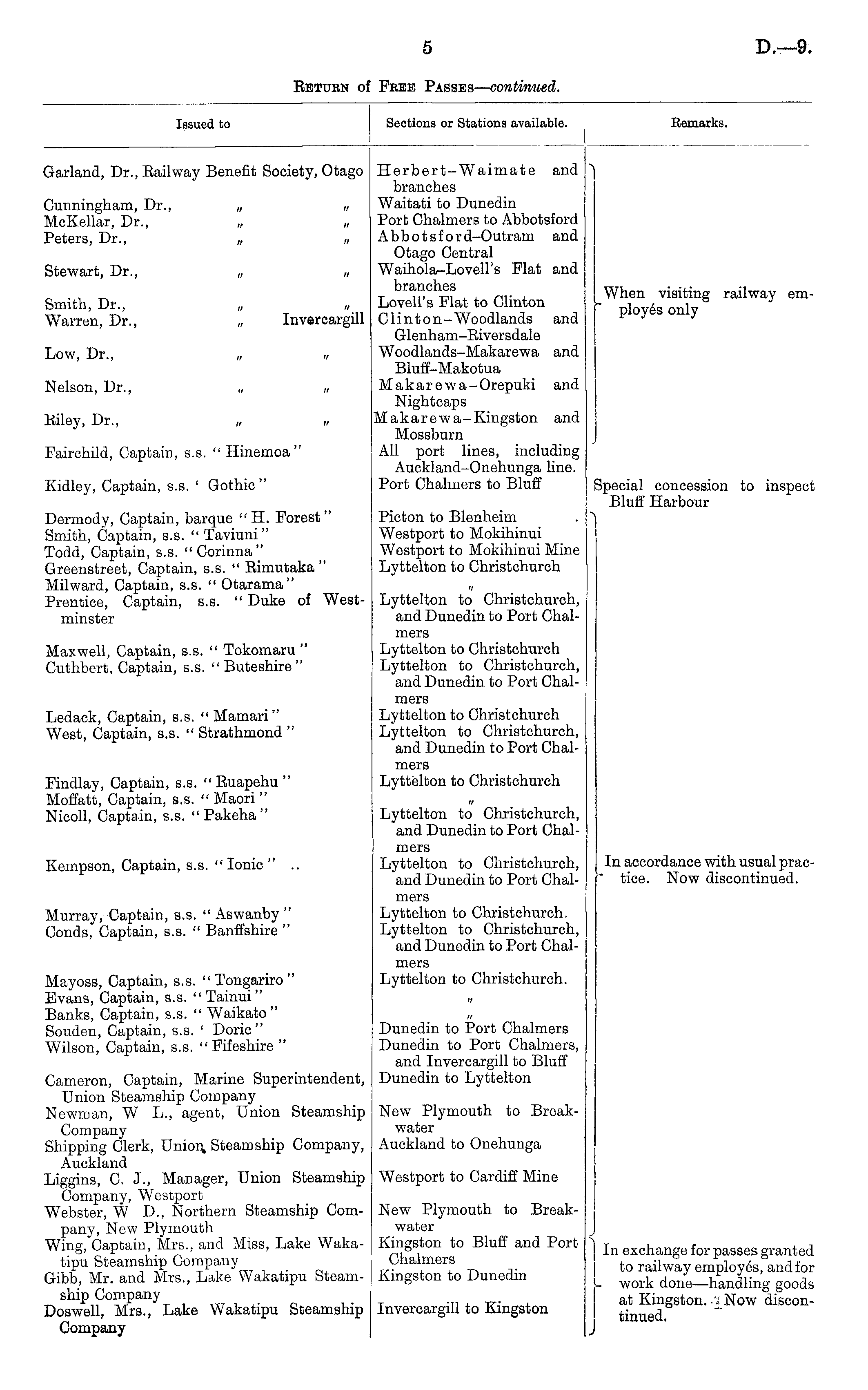 Issued to Sections or Stations available. Remarks. Garland, Dr., Bailway Benefit Society, Otago Cunningham, Dr., „ „ McKellar, Dr., Peters, Dr., „ „ Stewart, Dr., „ „ Smith, Dr., „ „ W T arren, Dr., „ Invercargill Herbert-Waimate and branches Waitati to Dunedin Port Chalmers to Abbotsford Abbotsford-Outram and Otago Central Waihola-LovelFs Flat and branches Lovell's Flat to Clinton Clinton-Woodlands and Glenham-Biversdale Woodlands-Makarewa and Bluff-Makotua Makarewa-Orepuki and Nightcaps Makarewa-Kingston and Mossburn All port lines, including Auckland-Onehunga line. Port Chalmers to Bluff When visiting railway employes only Low, Dr., „ „ Nelson, Dr., „ ,, Biley, Dr., „ » Fairchild, Captain, s.s. " Hinemoa" Kidley, Captain, s.s. ' Gothic " Dermody, Captain, barque " H. Forest" Smith, Captain, s.s. " Taviuni" Todd, Captain, s.s. "Corinna" Greenstreet, Captain, s.s. " Bimutaka " Milward, Captain, s.s. " Otarama" Prentice, Captain, s.s. " Duke of Westminster Picton to Blenheim Westport to Mokihinui Westport to Mokihinui Mine Lyttelton to Christchurch Special concession to inspect Bluff Harbour Lyttelton to Christchurch, and Dunedin to Port ChalMaxwell, Captain, s.s. " Tokomaru " Cuthbert. Captain, s.s. "Buteshire" mers Lyttelton to Christchurch Lyttelton to Christchurch, and Dunedin to Port ChalLedack, Captain, s.s. "Mamari" West, Captain, s.s. " Strathmond " Findlay, Captain, s.s. " Buapehu " Moffatt, Captain, s.s. " Maori " Nicoll, Captain, s.s. "Pakeha" Kempson, Captain, s.s. "Ionic" .. mers Lyttelton to Christchurch Lyttelton to Christchurch, and Dunedin to Port Chalmers Lyttelton to Christchurch Lyttelton to Christchurch, and Dunedin to Port Chalmers Lyttelton to Christchurch, and Dunedin to Port ChalIn accordance with usual practice. Now discontinued. Murray, Captain, s.s. " Aswanby " Conds, Captain, s.s. " Banffshire " mers Lyttelton to Christchurch. Lyttelton to Christchurch, and Dunedin to Port ChalMayoss, Captain, s.s. " Tongariro " Evans, Captain, s.s. "Tainui" Banks, Captain, s.s. " Waikato" Souden, Captain, s.s. ' Doric" Wilson, Captain, s.s. "Fifeshire " mers Lyttelton to Christchurch. » Dunedin to Port Chalmers Dunedin to Port Chalmers, and Invercargill to Bluff Dunedin to Lyttelton Cameron, Captain, Marine Superintendent, Union Steamship Company Newman, W L., agent, Union Steamship Company Shipping Clerk, Union, Steamship Company, Auckland Liggins, C. J., Manager, Union Steamship Company, Westport Webster, W D., Northern Steamship Company, New Plymouth Wing, Captain, Mrs., and Miss, Lake Wakatipu Steamship Company Gibb, Mr. and Mrs., Lake Wakatipu Steamship Company Doswell, Mrs., Lake Wakatipu Steamship Company New Plymouth to Breakwater Auckland to Onehunga Westport to Cardiff Mine In exchange for passes granted to railway employes, and for . work done—handling goods at Kingston. ■'.; Now discontinued. New Plymouth to Breakwater Kingston to Bluff and Port Chalmers Kingston to Dunedin Invercargill to Kingston