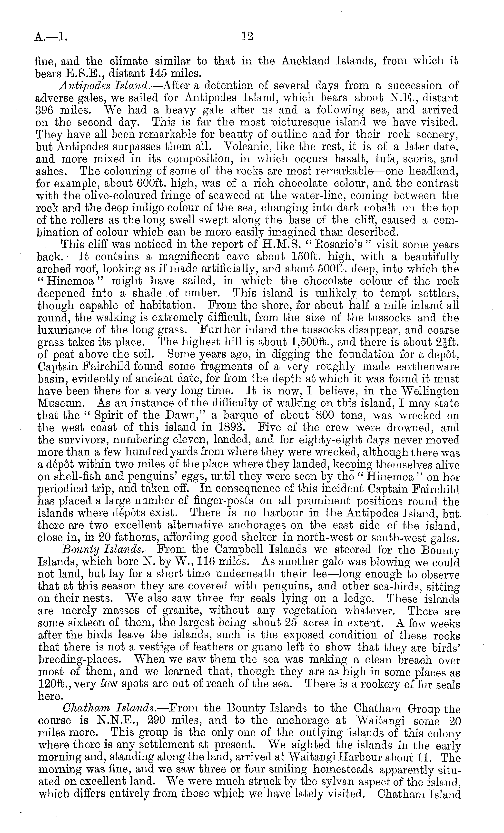 fine, and the climate similar to that in the Auckland Islands, from which it bears E.S.E., distant 145 miles. Antipodes Island. —After a detention of several days from a succession of adverse gales, we sailed for Antipodes Island, which bears about N.E., distant 396 miles. We had a heavy gale after us and a following sea, and arrived on the second day. This is far the most picturesque island we have visited. They have all been remarkable for beauty of outline and for their rock scenery, but Antipodes surpasses them all. Volcanic, like the rest, it is of a later date, and more mixed in its composition, in which occurs basalt, tufa, scoria, and ashes. The colouring of some of the rocks are most remarkable—one headland, for example, about 600 ft. high, was of a rich chocolate colour, and the contrast with the olive-coloured fringe of seaweed at the water-line, coming between the rock and the deep indigo colour of the sea, changing into dark cobalt on the top of the rollers as the long swell swept along the base of the cliff, caused a combination of colour which can be more easily imagined than described. This cliff was noticed in the report of H.M.S. " Eosario's " visit some years back. It contains a magnificent cave about 150 ft. high, with a beautifully arched roof, looking as if made artificially, and about 500 ft. deep, into which the "Hinemoa" might have sailed, in which the chocolate colour ofthe rock deepened into a shade of umber. This island is unlikely to tempt settlers, though capable of habitation. From the shore, for about half a mile inland all round, the walking is extremely difficult, from the size of the tussocks and the luxuriance of the long grass. Further inland the tussocks disappear, and coarse grass takes its place. The highest hill is about 1,500 ft., and there is about 2jft. of peat above the soil. Some years ago, in digging the foundation for a depot, Captain Fairchild found some fragments of a very roughly made earthenware basin, evidently of ancient date, for from the depth at which it was found it must have been there for a very long time. It is now, I believe, in the Wellington Museum. As an instance of the difficulty of walking on this island, I may state that the " Spirit of the Dawn," a barque of about 800 tons, was wrecked on the west coast of this island in 1893. Five of the crew were drowned, and the survivors, numbering eleven, landed, and for eighty-eight days never moved more than a few hundred yards from where they were wrecked, although there was a depot within two miles of the place where they landed, keeping themselves alive on shell-fish and penguins' eggs, until they were seen by the " Hinemoa " on her periodical trip, and taken off. In consequence of this incident Captain Fairchild has placed a large number of finger-posts on all prominent positions round the islands where depots exist. There is no harbour in the Antipodes Island, but there are two excellent alternative anchorages on the east side of the island, close in, in 20 fathoms, affording good shelter in north-west or south-west gales. Bounty Islands. —From the Campbell Islands we steered for the Bounty Islands, which bore N. by W., 116 miles. As another gale was blowing we could not land., but lay for a short time underneath their lee—long enough to observe that at this season they are covered with penguins, and other sea-birds, sitting on their nests. We also saw three fur seals lying on a ledge. These islands are merely masses of granite, without any vegetation whatever. There are some sixteen of them, the largest being about 25 acres in extent. A few weeks after the birds leave the islands, such is the exposed condition of these rocks that there is not a vestige of feathers or guano left to show that they are birds' breeding-places. When we saw them the sea was making a clean breach over most of them, and we learned that, though they are as high in some places as 120 ft., very few spots are out of reach of the sea. There is a rookery of fur seals here. Chatham Islands.— -From the Bounty Islands to the Chatham Group the course is N.N.E., 290 miles, and to the anchorage at Waitangi some 20 miles more. This group is the only one of the outlying islands of this colony where there is any settlement at present. We sighted the islands in the early morning and, standing along the land, arrived at Waitangi Harbour about 11. The morning was fine, and we saw three or four smiling homesteads apparently situated on excellent land. We were much struck by the sylvan aspect of the island, which differs entirely from those which we have lately visited. Chatham Island