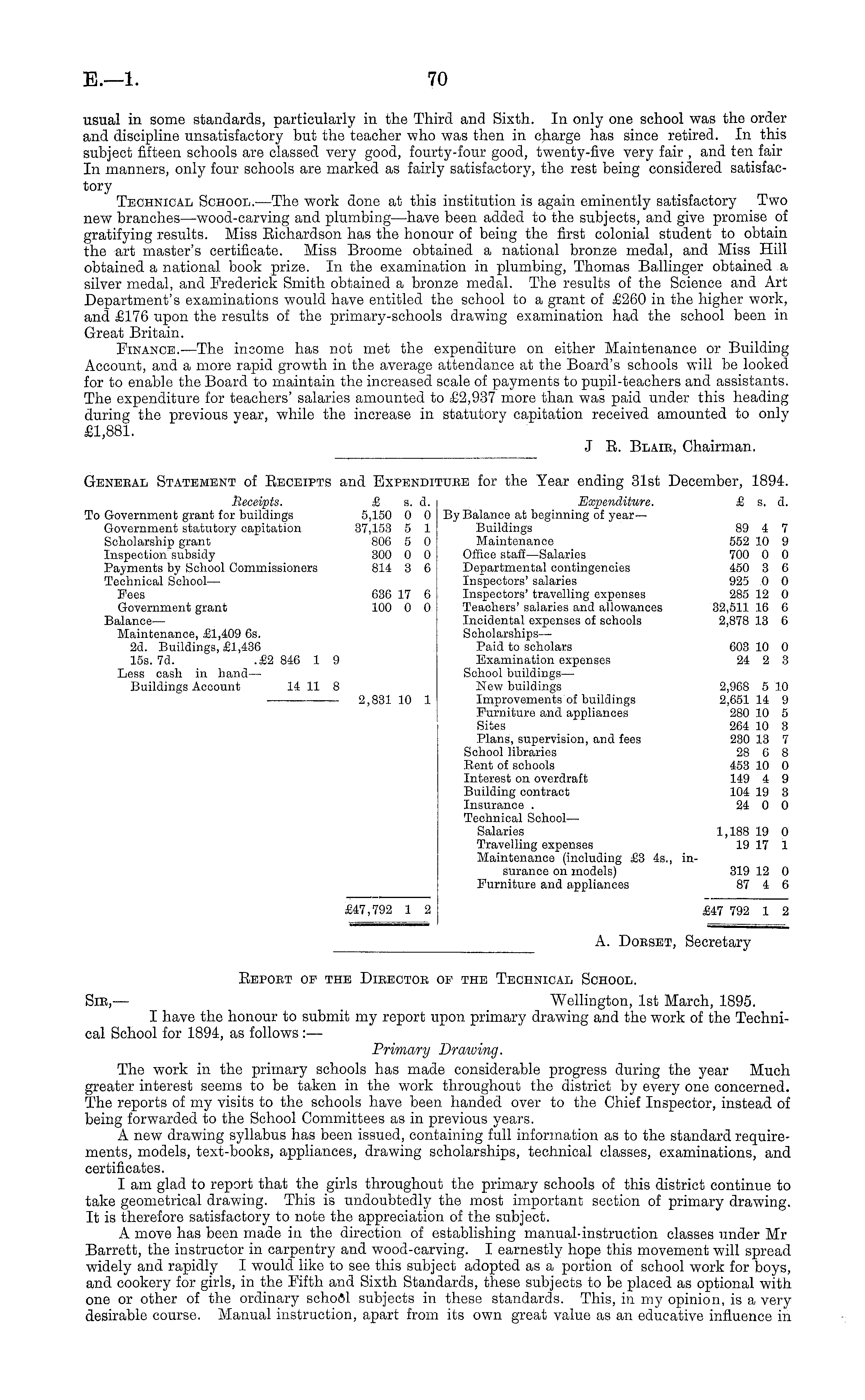 Repobt of the Dieectoe of the Technical School. Sic,— Wellington, Ist March, 1895. I have the honour to submit my report upon primary drawing and the work of the Technical School for 1894, as follows :— Primary Drawing. The work in the primary schools has made considerable progress during the year Much greater interest seems to be taken in the work throughout the district by every one concerned. The reports of my visits to the schools have been handed over to the Chief Inspector, instead of being forwarded to the School Committees as in previous years. A new drawing syllabus has been issued, containing full information as to the standard requirements, models, text-books, appliances, drawing scholarships, technical classes, examinations, and certificates. I am glad to report that the girls throughout the primary schools of this district continue to take geometrical drawing. This is undoubtedly the most important section of primary drawing. It is therefore satisfactory to note the appreciation of the subject. A move has been made in the direction of establishing manual-instruction classes under Mr Barrett, the instructor in carpentry and wood-carving. I earnestly hope this movement will spread widely and rapidly I would like to see this subject adopted as a portion of school work for boys, and cookery for girls, in the Fifth and Sixth Standards, these subjects to be placed as optional with one or other of the ordinary school subjects in these standards. This, in my opinion, is a very desirable course. Manual instruction, apart from its own great value as an educative influence in