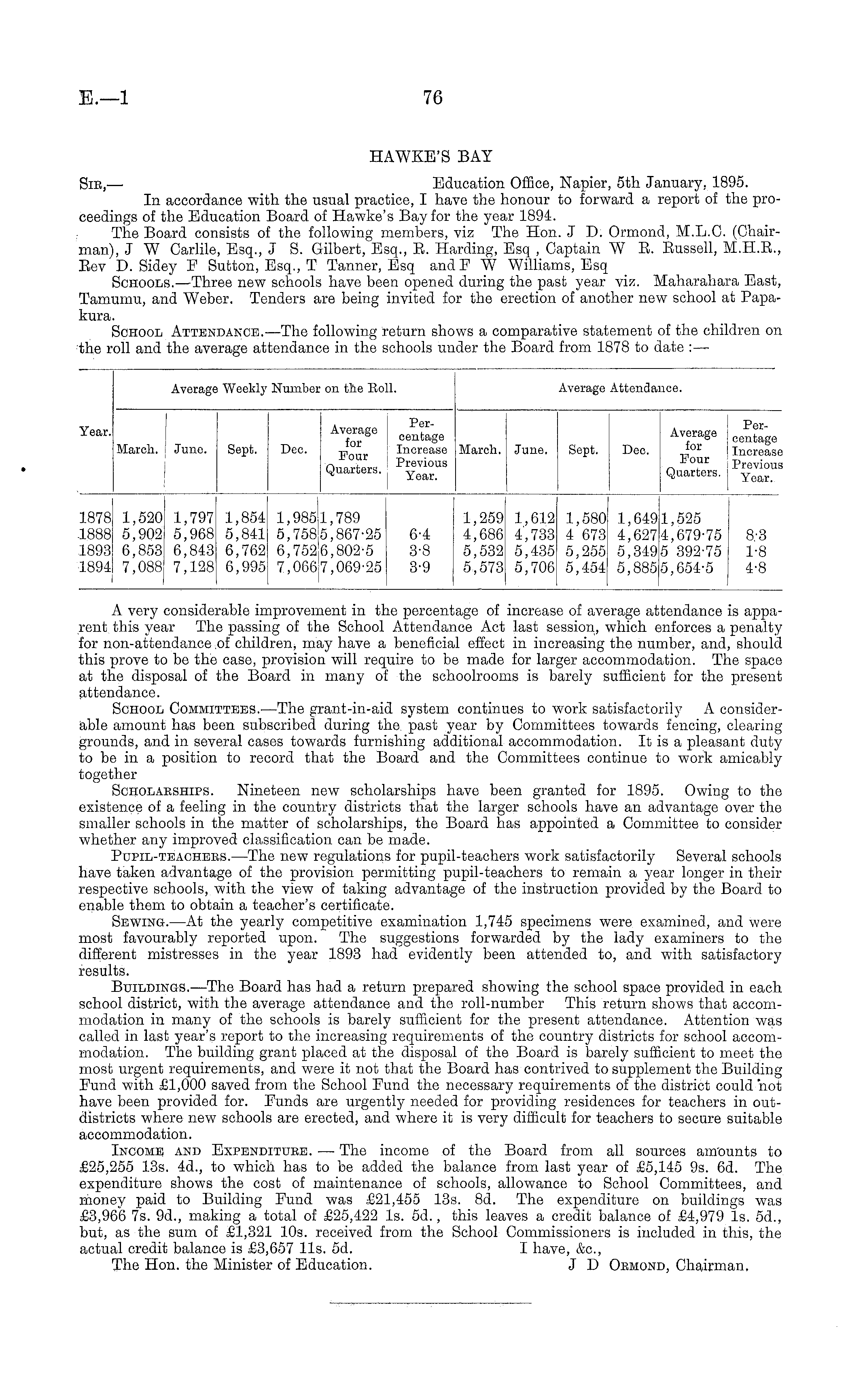HAWKE'S BAY Sic, — Education Office, Napier, sth January, 1895. In accordance with the usual practice, I have the honour to forward a report of the proceedings of the Education Board of Hawke's Bay for the year 1894. The Board consists of the following members, viz The Hon. J D. Ormond, M.L.C. (Chairman), J W Carlile, Esq., J S. Gilbert, Esq., E. Harding, Esq , Captain W E. Eussell, M.H.E., Eev D. Sidey F Sutton, Esq., T Tanner, Esq and F W Williams, Esq Schools.—Three new schools have been opened during the past year viz. Maharahara East, Tamumu, and Weber. Tenders are being invited for the erection of another new school at Papakura. School Attendakce.—The following return shows a comparative statement of the children on the roll and the average attendance in the schools under the Board from 1878 to date :—