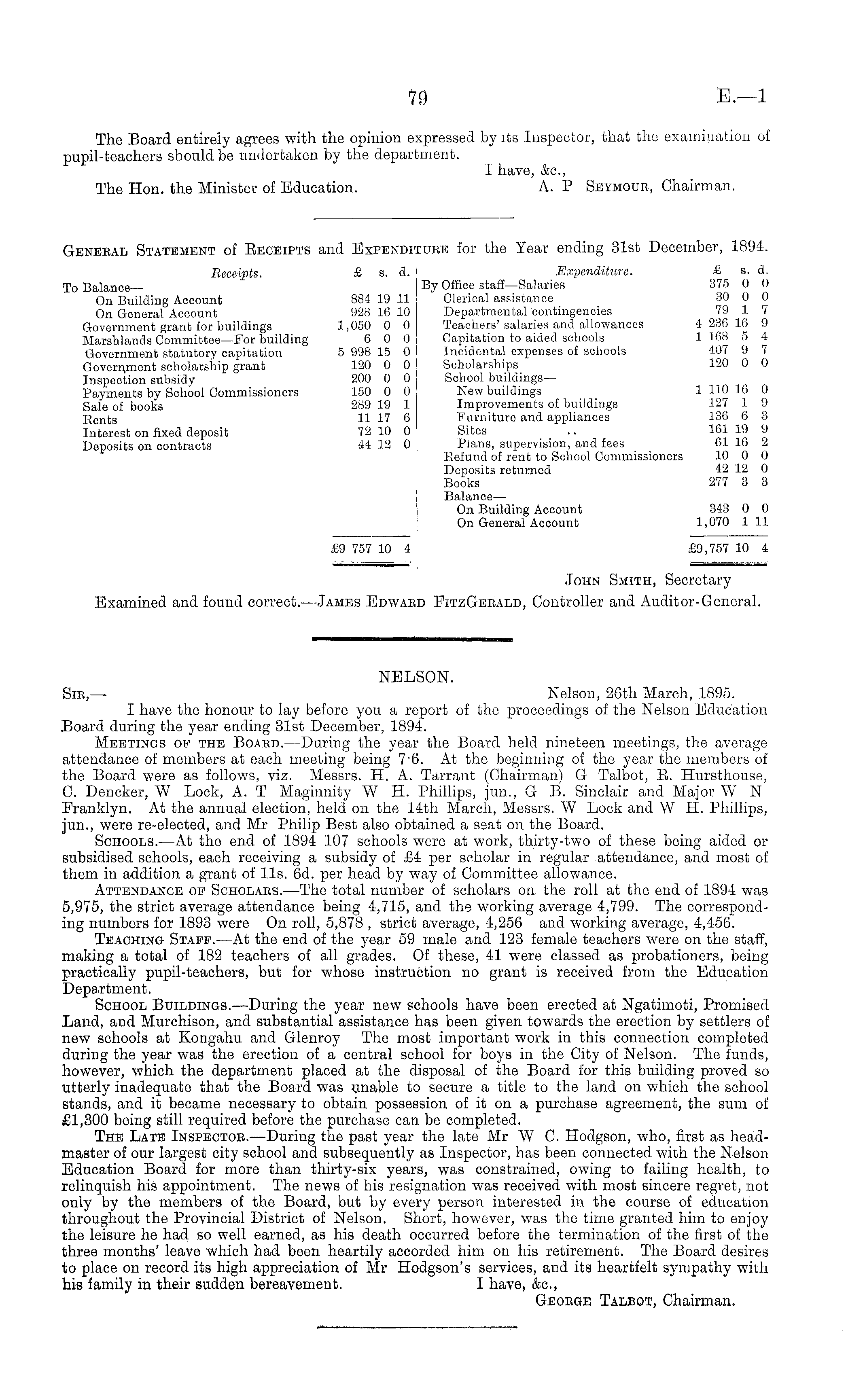 NELSON. Sib,—- Nelson, 26th March, 1895. I have the honour to lay before you a report of the proceedings of the Nelson Education Board during the year ending 31st December, 1894. Meetings of the Board.—During the year the Board held nineteen meetings, the average attendance of members at each meeting being 76. At the beginning of the year the members of the Board were as follows, viz. Messrs. H. A. Tarrant (Chairman) G Talbot, E. Hursthouse, C. Dencker, W Lock, A. T Maginnity W H. Phillips, jun., G B. Sinclair and Major W N Franklyn. At the annual election, held on the 14th March, Messrs. W Lock and W H. Phillips, jun., were re-elected, and Mr Philip Best also obtained a ssat on the Board. Schools.—At the end of 1894 107 schools were at work, thirty-two of these being aided or subsidised schools, each receiving a subsidy of £4 per scholar in regular attendance, and most of them in addition a grant of 11s. 6d. per head by way of Committee allowance. Attendance of Scholars.—The total number of scholars on the roll at the end of 1894 was 5,975, the strict average attendance being 4,715, and the working average 4,799. The corresponding numbers for 1893 were On roll, 5,878 , strict average, 4,256 and working average, 4,456. Teaching Staff.—At the end of the year 59 male and 123 female teachers were on the staff, making a total of 182 teachers of all grades. Of these, 41 were classed as probationers, being practically pupil-teachers, but for whose instruction no grant is received from the Education Department. School Buildings.—During the year new schools have been erected at Ngatimoti, Promised Land, and Murchison, and substantial assistance has been given towards the erection by settlers of new schools at Kongahu and Glenroy The most important work in this connection completed during the year was the erection of a central school for boys in the City of Nelson. The funds, however, which the department placed at the disposal of the Board for this building proved so utterly inadequate that the Board was unable to secure a title to the land on which the school stands, and it became necessary to obtain possession of it on a purchase agreement, the sum of £1,300 being still required before the purchase can be completed. The Late Inspector.—During the past year the late Mr W C. Hodgson, who, first as headmaster of our largest city school and subsequently as Inspector, has been connected with the Nelson Education Board for more than thirty-six years, was constrained, owing to failing health, to relinquish his appointment. The news of his resignation was received with most sincere regret, not only by the members of the Board, but by every person interested in the course of education throughout the Provincial District of Nelson. Short, however, was the time granted him to enjoy the leisure he had so well earned, as his death occurred before the termination of the first of the three months' leave which had been heartily accorded him on his retirement. The Board desires to place on record its high appreciation of Mr Hodgson's services, and its heartfelt sympathy with his family in their sudden bereavement. I have, &c, George Talbot, Chairman,