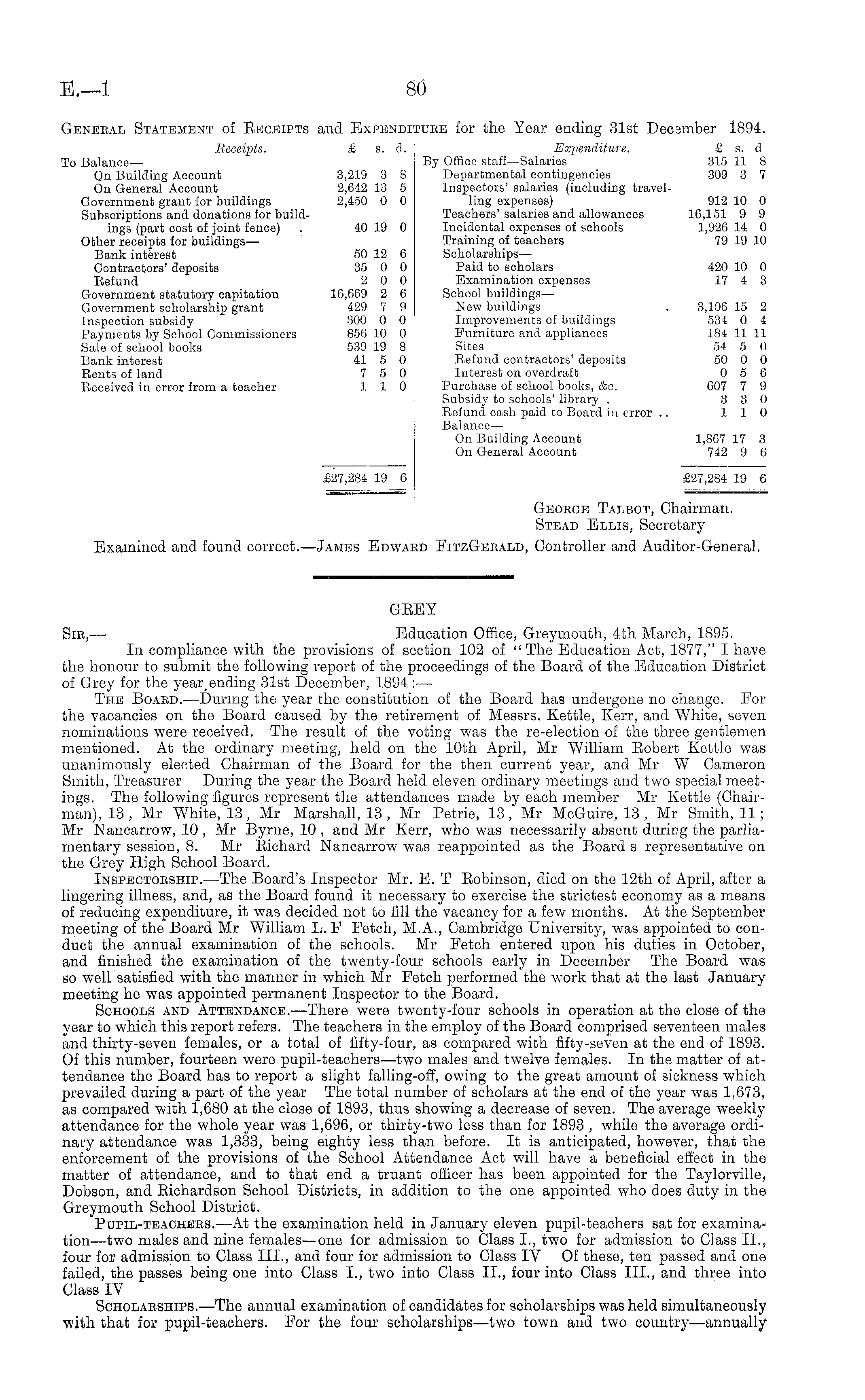 GEEY Sib, — Education Office, Greymouth, 4th March, 1895. In compliance with the provisions of section 102 of " The Education Act, 1877," I have the honour to submit the following report of the proceedings of the Board of the Education District of Grey for the year, ending 31st December, 1894 : — The Boaed. —During the year the constitution of the Board has undergone no change. For the vacancies on the Board caused by the retirement of Messrs. Kettle, Kerr, and White, seven nominations were received. The result of the voting was the re-election of the three gentlemen mentioned. At the ordinary meeting, held on the 10th April, Mr William Eobert Kettle was unanimously elected Chairman of the Board for the then current year, and Mr W Cameron Smith, Treasurer During the year the Board held eleven ordinary meetings and two special meetings. The following figures represent the attendances made by each member Mr Kettle (Chairman), 13, Mr White, 13, Mr Marshall, 13, Mr Petrie, 13, Mr McGuire, 13, Mr Smith, 11; Mr Nancarrow, 10, Mr Byrne, 10 , and Mr Kerr, who was necessarily absent during the parliamentary session, 8. Mr Eichard Nancarrow was reappointed as the Board s representative on the Grey High School Board. Inspectorship.—The Board's Inspector Mr. E. T Bobinson, died on the 12th of April, after a lingering illness, and, as the Board found it necessary to exercise the strictest economy as a means of reducing expenditure, it was decided not to fill the vacancy for a few months. At the September meeting of the Board Mr William L. F Fetch, M.A., Cambridge University, was appointed to conduct the annual examination of the schools. Mr Fetch entered upon his duties in October, and finished the examination of the twenty-four schools early in December The Board was so well satisfied with the manner in which Mr Fetch performed the work that at the last January meeting he was appointed permanent Inspector to the Board. Schools and Attendance.—There were twenty-four schools in operation at the close of the year to which this report refers. The teachers in the employ of the Board comprised seventeen males and thirty-seven females, or a total of fifty-four, as compared with fifty-seven at the end of 1893. Of this number, fourteen were pupil-teachers—two males and twelve females. In the matter of attendance the Board has to report a slight falling-off, owing to the great amount of sickness which prevailed during a part of the year The total number of scholars at the end of the year was 1,673, as compared with 1,680 at the close of 1893, thus showing a decrease of seven. The average weekly attendance for the whole year was 1,696, or thirty-two less than for 1893 , while the average ordinary attendance was 1,333, being eighty less than before. It is anticipated, however, that the enforcement of the provisions of the School Attendance Act will have a beneficial effect in the matter of attendance, and to that end a truant officer has been appointed for the Taylorville, Dobson, and Eichardson School Districts, in addition to the one appointed who does duty in the Greymouth School District, Pupil-teachees.—At the examination held in January eleven pupil-teachers sat for examination—two males and nine females —one for admission to Class 1., two for admission to Class 11., four for admission to Class 111., and four for admission to Class IV Of these, ten passed and one failed, the passes being one into Class 1., two into Class 11., four into Class 111., and three into Class IV Scholabships.—The annual examination of candidates for scholarships was held simultaneously with that for pupil-teachers. For the four scholarships—two town and two country—annually