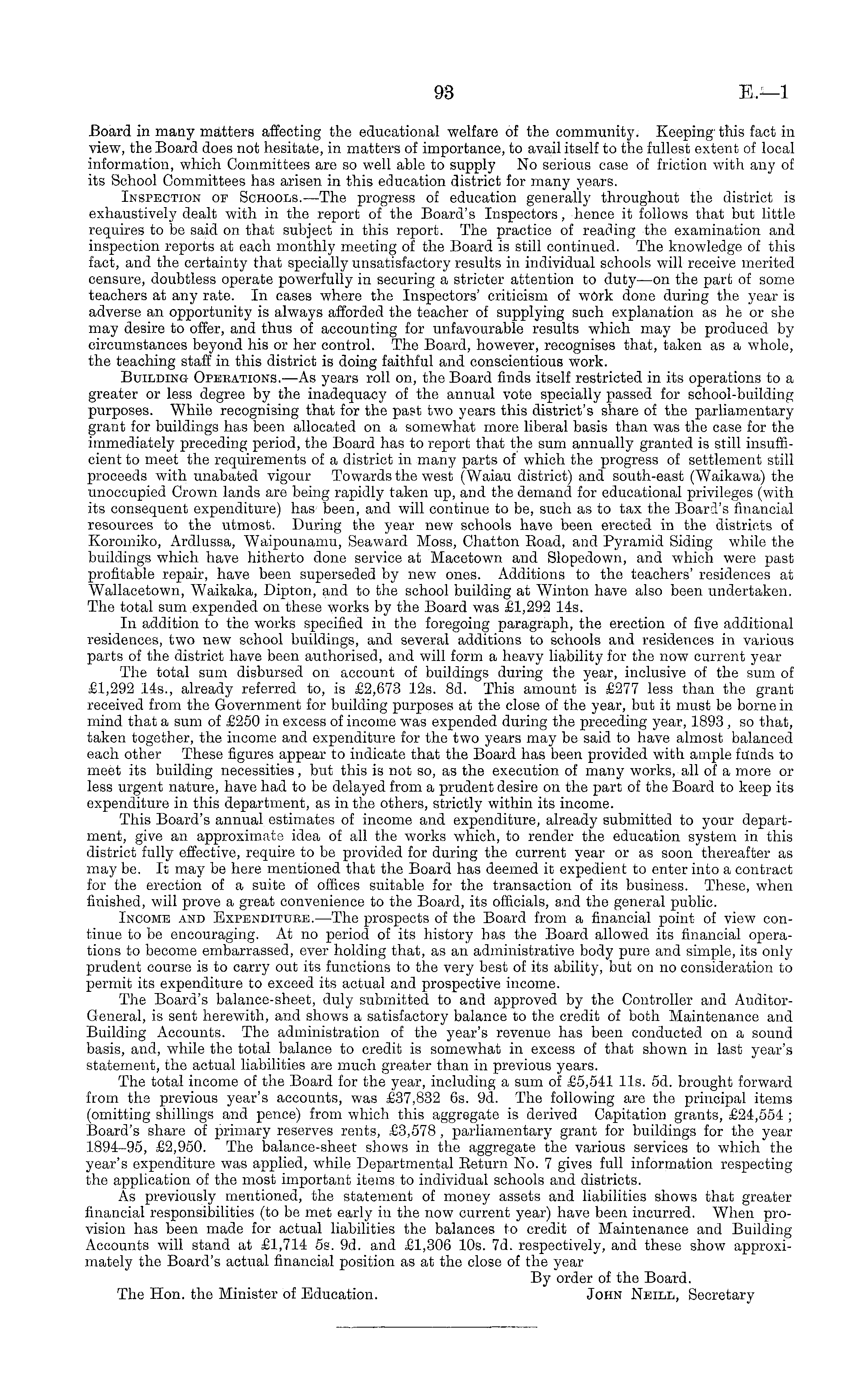 Board in many matters affecting the educational welfare of the community. Keeping'this fact in view, the Board does not hesitate, in matters of importance, to avail itself to the fullest extent of local information, which Committees are so well able to supply No serious case of friction with any of its School Committees has arisen in this education district for many years. Inspection op Schools.—The progress of education generally throughout the district is exhaustively dealt with in the report of the Board's Inspectors, hence it follows that but little requires to be said on that subject in this report. The practice of reading the examination and inspection reports at each monthly meeting of the Board is still continued. The knowledge of this fact, and the certainty that specially unsatisfactory results in individual schools will receive merited censure, doubtless operate powerfully in securing a stricter attention to duty—on the part of some teachers at any rate. In cases where the Inspectors' criticism of wOrk done during the year is adverse an opportunity is always afforded the teacher of supplying such explanation as he or she may desire to offer, and thus of accounting for unfavourable results which may be produced by circumstances beyond his or her control. The Board, however, recognises that, taken as a whole, the teaching staff in this district is doing faithful and conscientious work. Building Operations.—As years roll on, the Board finds itself restricted in its operations to a greater or less degree by the inadequacy of the annual vote specially passed for school-building purposes. While recognising that for the past two years this district's share of the parliamentary grant for buildings has been allocated on a somewhat more liberal basis than was the case for the immediately preceding period, the Board has to report that the sum annually granted is still insufficient to meet the requirements of a district in many parts of which the progress of settlement still proceeds with unabated vigour Towards the west (Waiau district) and south-east (Waikawa) the unoccupied Crown lands are being rapidly taken up, and the demand for educational privileges (with its consequent expenditure) has been, and will continue to be, such as to tax the Board's financial resources to the utmost. During the year new schools have been erected in the districts of Koroiniko, Ardlussa, Waipounamu, Seaward Moss, Chatton Boad, and Pyramid Siding while the buildings which have hitherto done service at Macetown and Slopedown, and which were past profitable repair, have been superseded by new ones. Additions to the teachers' residences at Wallacetown, Waikaka, Dipton, and to the school building at Winton have also been undertaken. The total sum expended on these works by the Board was £1,292 14s. In addition to the works specified in the foregoing paragraph, the erection of five additional residences, two new school buildings, and several additions to schools and residences in various parts of the district have been authorised, and will form a heavy liability for the now current year The total sum disbursed on account of buildings during the year, inclusive of the sum of £1,292 145., already referred to, is £2,673 12s. Bd. This amount is £277 less than the grant received from the Government for building purposes at the close of the year, but it must be borne in mind that a sum of £250 in excess of income was expended during the preceding year, 1893 , so that, taken together, the income and expenditure for the two years may be said to have almost balanced each other These figures appear to indicate that the Board has been provided with ample funds to meet its building necessities, but this is not so, as the execution of many works, all of a more or less urgent nature, have had to be delayed from a prudent desire on the part of the Board to keep its expenditure in this department, as in the others, strictly within its income. This Board's annual estimates of income and expenditure, already submitted to your department, give an approximate idea of all the works which, to render the education system in this district fully effective, require to be provided for during the current year or as soon thereafter as may be. It may be here mentioned that the Board has deemed it expedient to enter into a contract for the erection of a suite of offices suitable for the transaction of its business. These, when finished, will prove a great convenience to the Board, its officials, and the general public. Income and Expenditure.—The prospects of the Board from a financial point of view continue to be encouraging. At no period of its history has the Board allowed its financial operations to become embarrassed, ever holding that, as an administrative body pure and simple, its only prudent course is to carry out its functions to the very best of its ability, but on no consideration to permit its expenditure to exceed its actual and prospective income. The Board's balance-sheet, duly submitted to and approved by the Controller and AuditorGeneral, is sent herewith, and shows a satisfactory balance to the credit of both Maintenance and Building Accounts. The administration of the year's revenue has been conducted on a sound basis, and, while the total balance to credit is somewhat in excess of that shown in last year's statement, the actual liabilities are much greater than in previous years. The total income of the Board for the year, including a sum of £5,541 lis. sd. brought forward from the previous year's accounts, was £37,832 6s. 9d. The following are the principal items (omitting shillings and pence) from which this aggregate is derived Capitation grants, £24,554 ; Board's share of primary reserves rents, £3,578 , parliamentary grant for buildings for the year 1894-95, £2,950. The balance-sheet shows in the aggregate the various services to which the year's expenditure was applied, while Departmental Beturn N