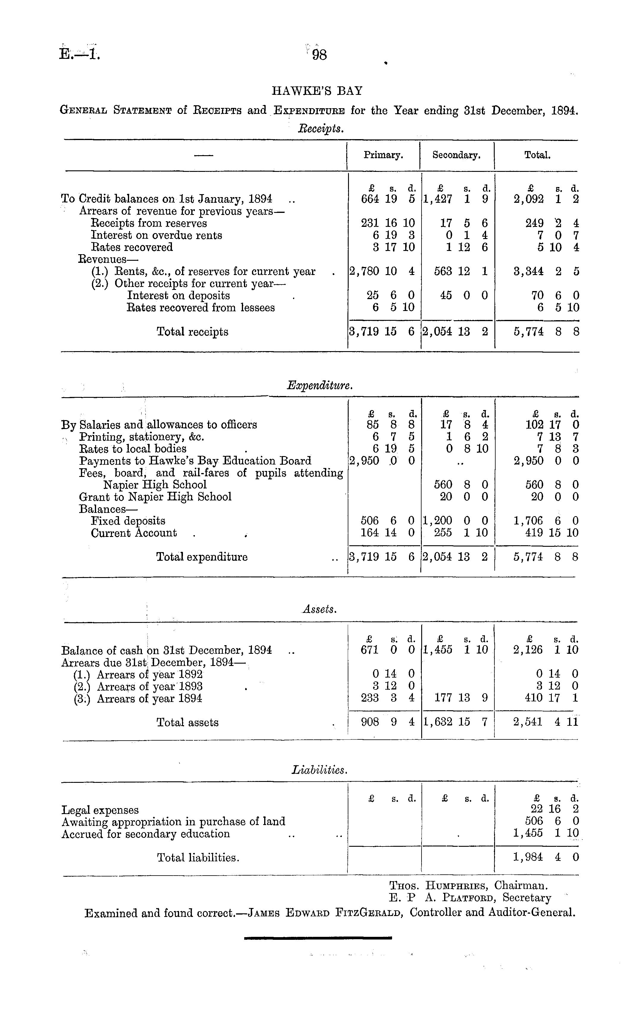 Thos. Humphries, Chairman. E. P A. Platpobd, Secretary Examined and found correct.—James Edwaed FitzGebald, Controller and Auditor-General.