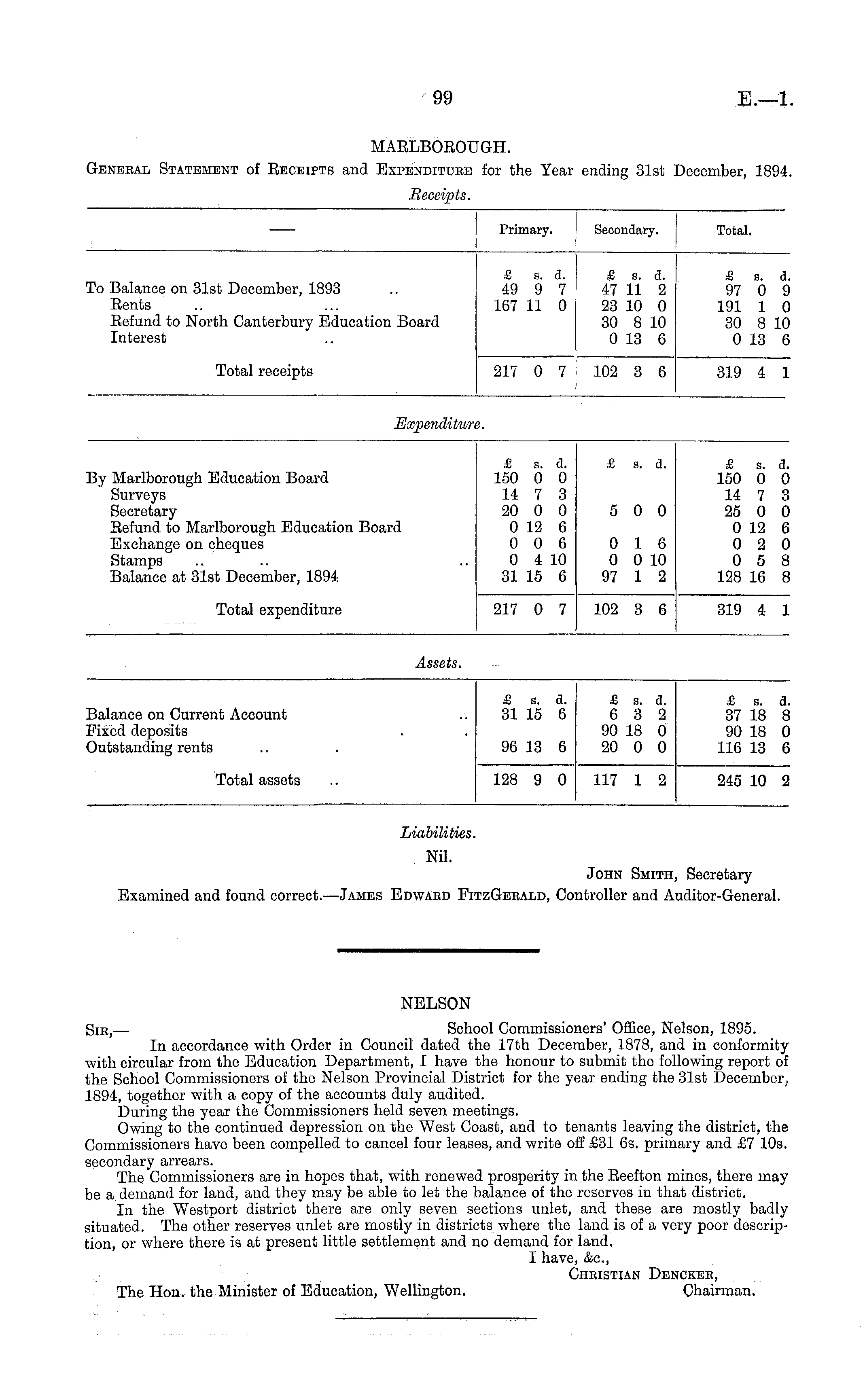 NELSON Sir, — School Commissioners' Office, Nelson, 1895. In accordance with Order in Council dated the 17th December, 1878, and in conformity with circular from the Education Department, I have the honour to submit the following report of the School Commissioners of the Nelson Provincial District for the year ending the 31st December, 1894, together with a copy of the accounts duly audited. During the year the Commissioners held seven meetings. Owing to the continued depression on the West Coast, and to tenants leaving the district, the Commissioners have been compelled to cancel four leases, and write off £31 6s. primary and £7 10s. secondary arrears. The Commissioners are in hopes that, with renewed prosperity in the Eeefton mines, there may be a demand for land, and they may be able to let the balance of the reserves in that district. In the Westport district there are only seven sections unlet, and these are mostly badly situated. The other reserves unlet are mostly in districts where the land is of a very poor description, or where there is at present little settlement and no demand for land. I have, &c, Cheistian Denckee, The Hon. the Minister of Education, Wellington. Chairman.