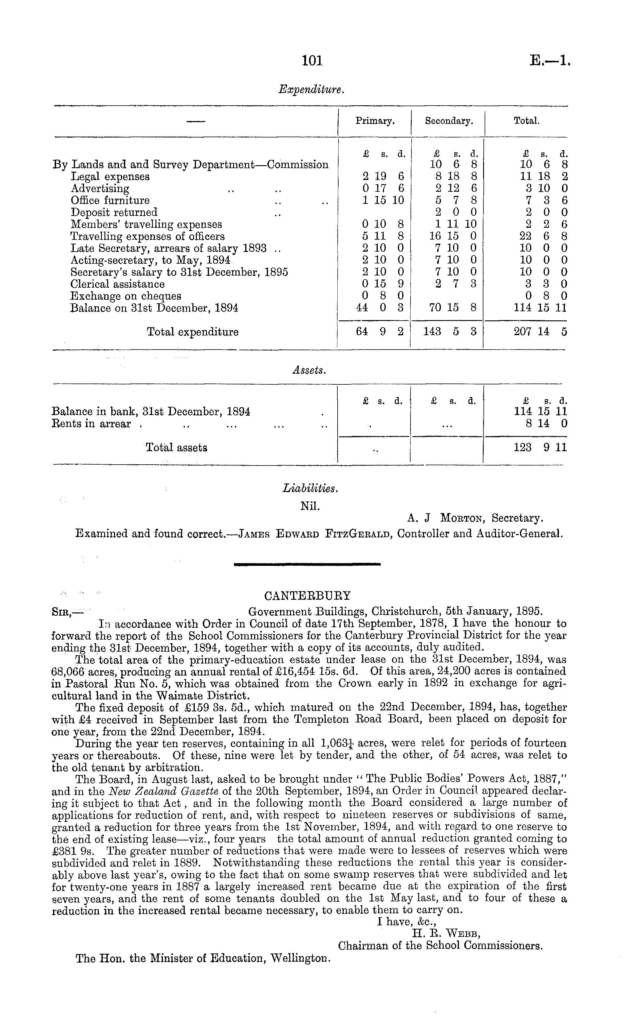 ixpem fare. Primary. Secondary. Total. By Lands and and Survey Department—Commission Legal expenses Advertising Office furniture Deposit returned Members' travelling expenses Travelling expenses of officers Late Secretary, arrears of salary 1893 .. Acting-secretary, to May, 1894 Secretary's salary to 31st December, 1895 Clerical assistance Exchange on cheques Balance on 31st December, 1894 £ s. a. 2 19 6 0 17 6 1 15 10 0 10 8 5 11 8 2 10 0 2 10 0 2 10 0 0 15 9 0 8 0 44 0 3 £ s. a. 10 6 8 8 18 8 2 12 6 5 7 8 2 0 0 1 11 10 16 15 0 7 10 0 7 10 0 7 10 0 2 7 3 £ s. a. 10 6 8 11 18 2 3 10 0 7 3 6 2 0 0 2 2 6 22 6 8 10 0 0 10 0 0 10 0 0 3 3 0 0 8 0 114 15 11 70 15 8 Total expenditure 64 9 2 143 5 3 207 14 5 Assets. £ s. d. £ s. a. £ s. d. 114 15 11 8 14 0 ialance in bank, 31st December, 1894 ients in arrear . Total assets 123 9 11