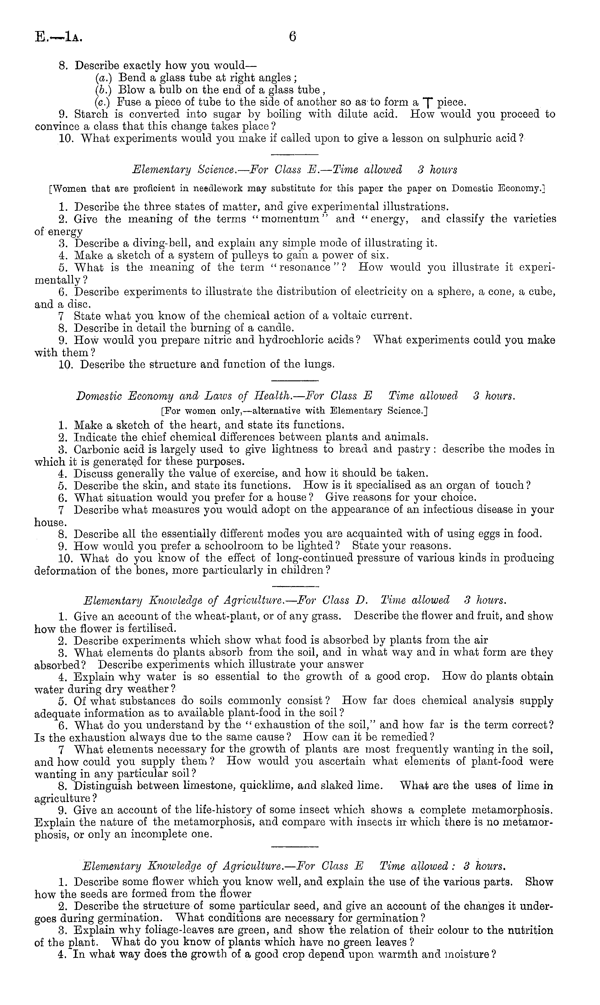 Elementary Science. — For Class E. — Time allowed 3 hours [Women that are proficient in needlework may substitute for this paper the paper on Domestic Economy.] 1. Describe the three states of matter, and give experimental illustrations. 2. Give the meaning of the terms "momentum" and "energy, and classify the varieties of energy 3. Describe a diving-bell, and explain any simple mode of illustrating it. 4. Make a sketch of a system of pulleys to gain a power of six. 5. What is the meaning of the term "resonance"? How would you illustrate it experimentally ? 6. Describe experiments to illustrate the distribution of electricity on a sphere, a cone, a cube, and a disc. 7 State what you know of the chemical action of a voltaic current. 8. Describe in detail the burning of a candle. 9. How would you prepare nitric and hydrochloric acids ? What experiments could you make with them ? 10. Describe the structure and function of the lungs.
