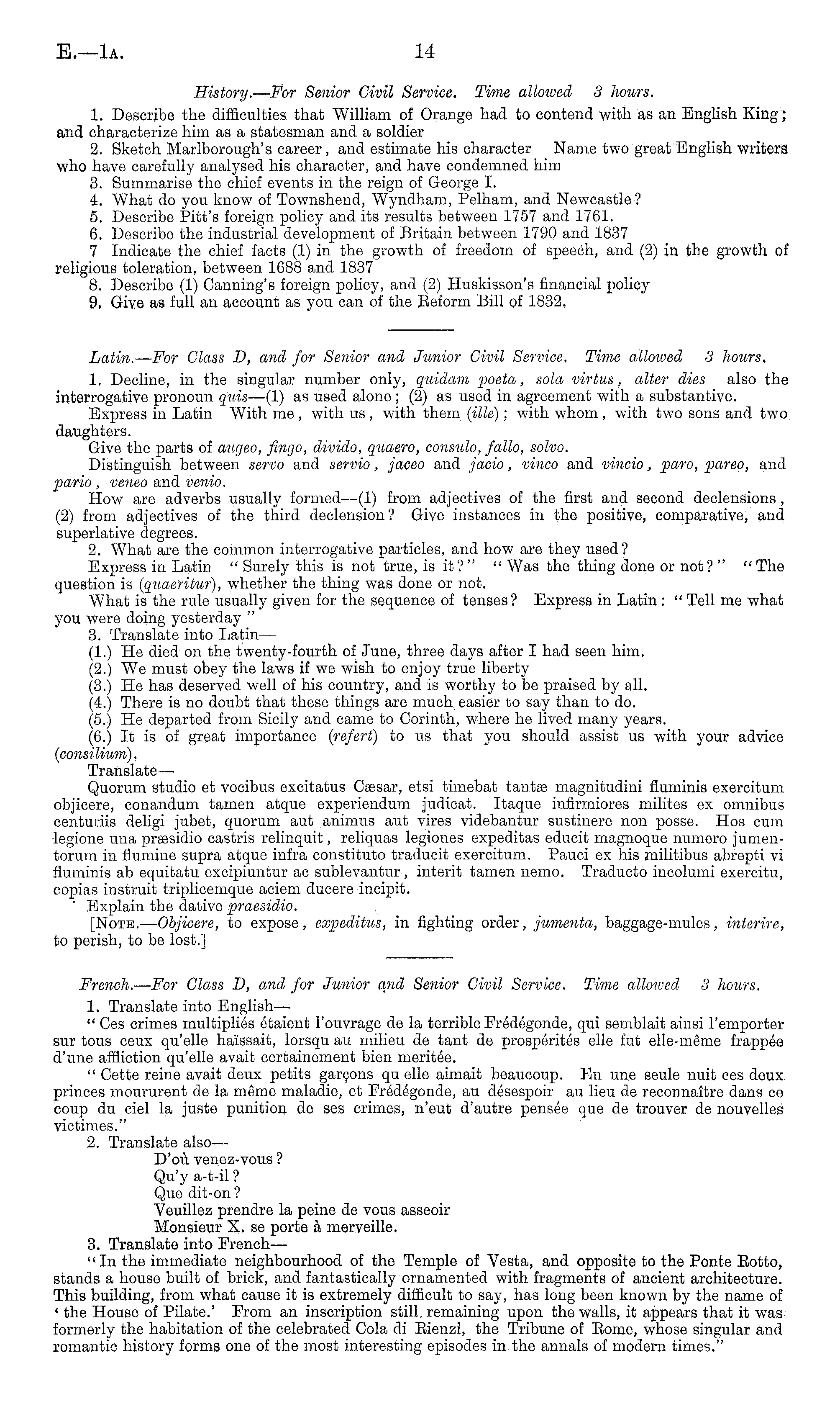 French. — For Class D, and for Junior and Senior Civil Service. Time allowed 3 hours. 1. Translate into English— " Ces crimes multiplies etaient l'ouvrage de la terrible Fredegonde, gui semblait ainsi l'emporter sur tous ceux qu'elle haissait, lorsqu au milieu de tant de prosperites elle fut elle-meme frappee dune affliction qu'elle avait certainement bien meritee. " Cette reine avait deux petits garcons qu elle aimait beaucoup. En une seule nuit ces deux princes moururent de la meme maladie, et Fredegonde, au desespoir au lieu de reconnaitre dans cc coup dv ciel la juste punition de ses crimes, n'eut d'autre pensee que de trouver de nouvelles victimes." 2. Translate also— D'oii venez-vous ? Qu'y a-t-il ? Que dit-on ? Veuillez prendre la peine de vous asseoir Monsieur X. se porte a, merveille. 3. Translate into French— "In the immediate neighbourhood of the Temple of Vesta, and opposite to the Ponte Botto, stands a house built of brick, and fantastically ornamented with fragments of ancient architecture. This building, from what cause it is extremely difficult to say, has long been known by the name of ' the House of Pilate.' From an inscription still remaining upon the walls, it appears that it was formerly the habitation of the celebrated Cola di Bienzi, the Tribune of Borne, whose singular and romantic history forms one of the most interesting episodes in.the annals of modern times,"