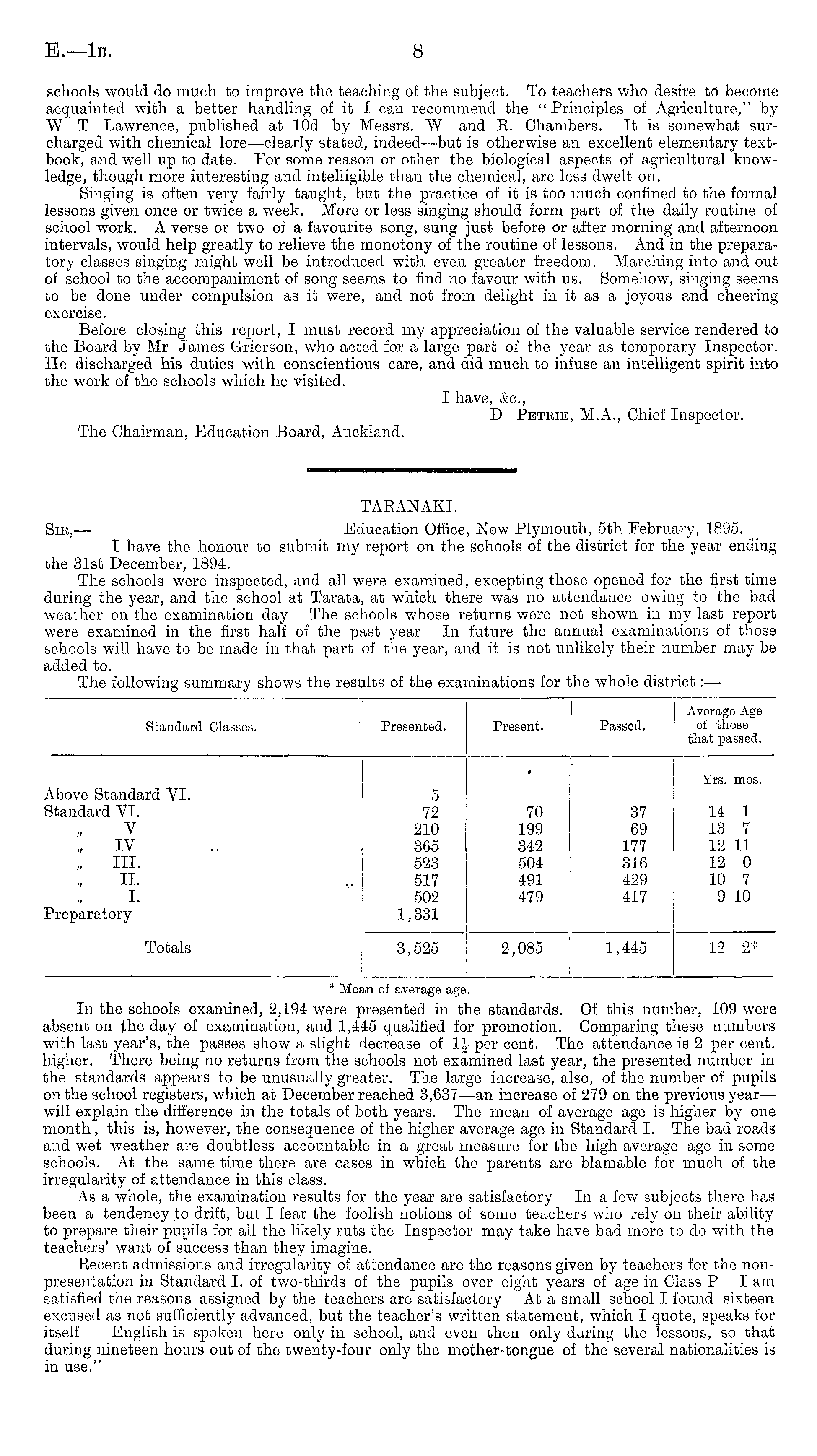 TAEANAKI. Sin, — Education Office, New Plymouth, sth February, 1895. I have the honour to submit my report on the schools of the district for the year ending the 31st December, 1894. The schools were inspected, and all were examined, excepting those opened for the first time during the year, and the school at Tarata, at which there was no attendance owing to the bad weather on the examination day The schools whose returns were not shown in my last report were examined in the first half of the past year In future the annual examinations of those schools will have to be made in that part of the year, and it is not unlikely their number may be added to.