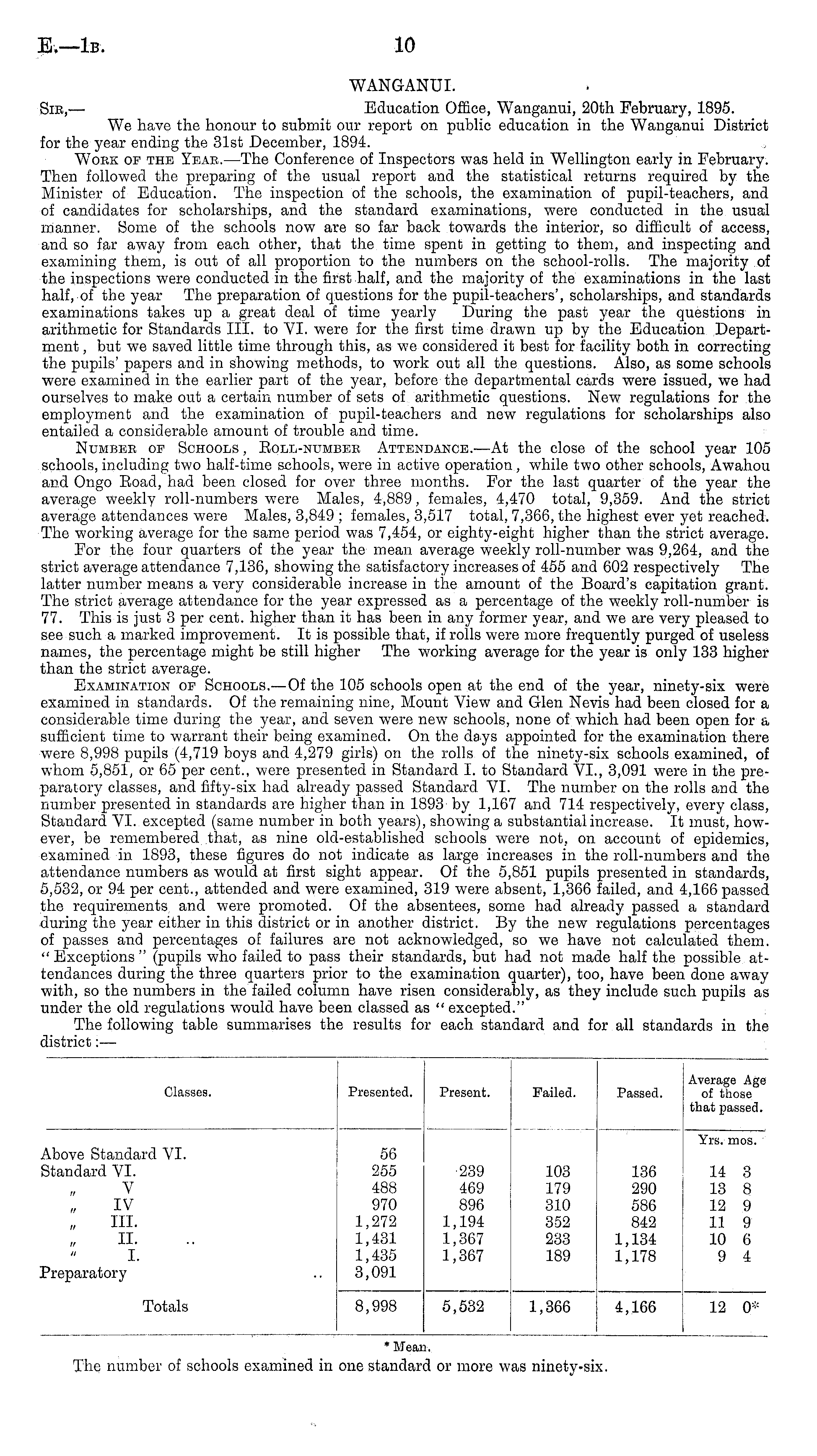 WANGANUI. Sic, — Education Office, Wanganui, 20th February, 1895. We have the honour to submit our report on public education in the Wanganui District for the year ending the 31st December, 1894. Work op the Year.—The Conference of Inspectors was held in Wellington early in February. Then followed the preparing of the usual report and the statistical returns required by the Minister of Education. The inspection of the schools, the examination of pupil-teachers, and of candidates for scholarships, and the standard examinations, were conducted in the usual manner. Some of the schools now are so far back towards the interior, so difficult of access, and so far away from each other, that the time spent in getting to them, and inspecting and examining them, is out of all proportion to the numbers on the school-rolls. The majority of the inspections were conducted in the first half, and the majority of the examinations in the last half, of the year The preparation of questions for the pupil-teachers', scholarships, and standards examinations takes up a great deal of time yearly During the past year the questions in arithmetic for Standards 111. to VI. were for the first time drawn up by the Education Department , but we saved little time through this, as we considered it best for facility both in correcting the pupils' papers and in showing methods, to work out all the questions. Also, as some schools were examined in the earlier part of the year, before the departmental cards were issued, we had ourselves to make out a certain number of sets of arithmetic questions. New regulations for the employment and the examination of pupil-teachers and new regulations for scholarships also entailed a considerable amount of trouble and time. Numbeb of Schools , 8011-number Attendance.—At the close of the school year 105 schools, including two half-time schools, were in active operation, while two other schools, Awahou and Ongo Road, had been closed for over three months. For the last quarter of the year the average weekly roll-numbers were Males, 4,889, females, 4,470 total, 9,359. And the strict average attendances were Males, 3,849 ; females, 3,517 total, 7,366, the highest ever yet reached. The working average for the same period was 7,454, or eighty-eight higher than the strict average. For the four quarters of the year the mean average weekly roll-number was 9,264, and the strict average attendance 7,136, showing the satisfactory increases of 455 and 602 respectively The latter number means a very considerable increase in the amount of the Board's capitation grant. The strict average attendance for the year expressed as a percentage of the weekly roll-number is 77. This is just 3 per cent, higher than it has been in any former year, and we are very pleased to see such a marked improvement. It is possible that, if rolls were more frequently purged of useless names, the percentage might be still higher The working average for the year is only 133 higher than the strict average. Examination of Schools.—Of the 105 schools open at the end of the year, ninety-six were examined in standards. Of the remaining nine, Mount View and Glen Nevis had been closed for a considerable time during the year, and seven were new schools, none of which had been open for a sufficient time to warrant their being examined. On the days appointed for the examination there were 8,998 pupils (4,719 boys and 4,279 girls) on the rolls of the ninety-six schools examined, of whom 5,851, or 65 per cent., were presented in Standard I. to Standard VI., 3,091 were in the preparatory classes, and fifty-six had already passed Standard VI. The number on the rolls and the number presented in standards are higher than in 1893 by 1,167 and 714 respectively, every class, Standard VI. excepted (same number in both years), showing a substantial increase. It must, however, be remembered that, as nine old-established schools were not, on account of epidemics, examined in 1893, these figures do not indicate as large increases in the roll-numbers and the attendance numbers as would at first sight appear. Of the 5,851 pupils presented in standards, 5,532, or 94 per cent., attended and were examined, 319 were absent, 1,366 failed, and 4,166 passed the requirements and were promoted. Of the absentees, some had already passed a standard during the year either in this district or in another district. By the new regulations percentages of passes and percentages of failures are not acknowledged, so we have not calculated them. " Exceptions " (pupils who failed to pass their standards, but had not made half the possible attendances during the three quarters prior to the examination quarter), too, have been done away with, so the numbers in the failed column have risen considerably, as they include such pupils as under the old regulations would have been classed as " excepted."
