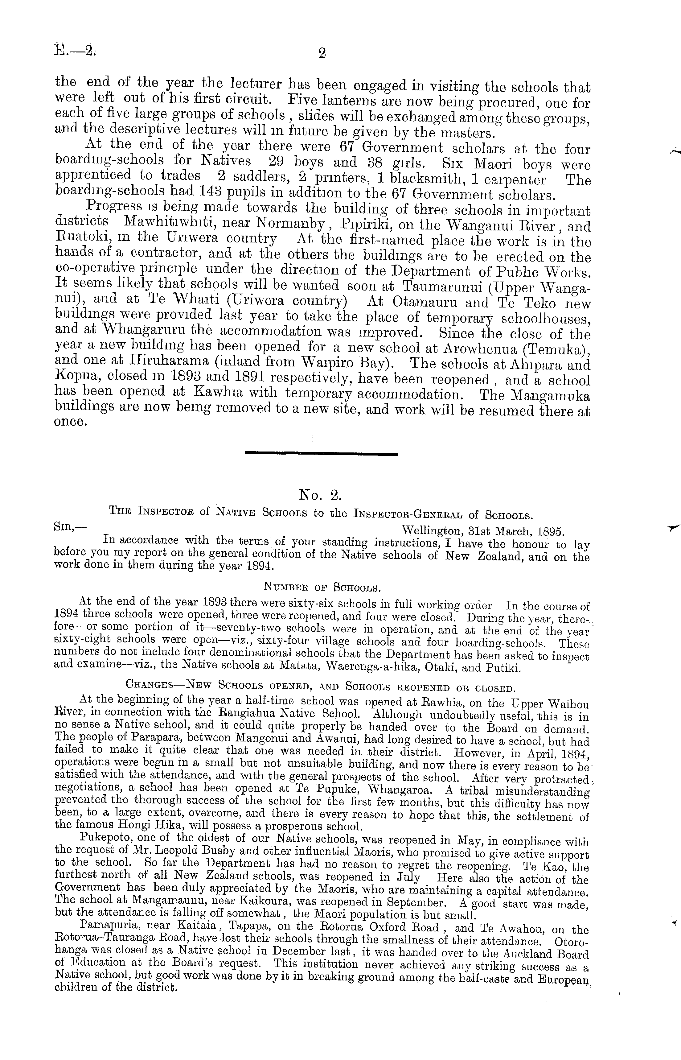 No. 2. The Inspectoe of Native Schools to the Inspectoe-Genebal of Schools. Sik '~ T , . , Wellington, 31st March, 1895. In accordance with the terms of your standing instructions, I have the honour to lay before you my report on the general condition of the Native schools of New Zealand and on the work done m them during the year 1894. Numbee of Schools. At the end of the year 1893 there were sixty-six schools in full working order In the course of 1894 three schools were opened, three were reopened, and four were closed. During the year therefore—or some portion of it—seventy-two schools were in operation, and at of the year sixty-eight schools were open—viz., sixty-four village schools and four boarding-schools These numbers do not include four denominational schools that the Department has been asked to inspect and examine—viz., the Native schools at Matata, Waerenga-a-hika, Otaki, and Putiki. Changes—New Schools opened, and Schools eeopened oe closed. At the beginning of the year a half-time school was opened at Bawhia, on the Upper Waihou Biver, m connection with the Eangiahua Native School. Although undoubtedly useful this is in no sense a Native school, and it could quite properly be handed over to the Board on demand The people of Parapara, between Mangonui and Awanui, had long desired to have a school, but had failed to make it quite clear that one was needed in their district. However, in April 1894 operationswere begun in a small but not unsuitable building, and now there is every reason to be satisfied with the attendance, and with the general prospects of the school. After very protracted negotiations, a school has been opened at Te Pupuke, Whangaroa. A tribal misunderstanding prevented the thorough success of the school for the first few months, but this difficulty has now been, to a large extent, overcome, and there is every reason to hope that this, the settlement of the famous Hongi Hika, will possess a prosperous school. Pukepoto, one of the oldest of our Native schools, was reopened in May, in compliance with the request of Mr. Leopold Busby and other influential Maoris, who promised to give active support to the school. So far the Department has had no reason to regret the reopening. Te Kao the furthest north of all New Zealand schools, was reopened in July Here also the action of the Government has been duly appreciated by the Maoris, who are maintaining a capital attendance. The school at Mangamaunu, near Kaikoura, was reopened in September. A good start was made' but the attendance is falling off somewhat, the Maori population is but small. Pamapuria, near Kaitaia, Tapapa, on the Eotorua-Oxford Eoad , and' Te Awahou, on the Eotorua-Tauranga Eoad, have lost their schools through the smallness of their attendance.' Otorohanga was closed as a Native school in December last, it was handed over to the Auckland Board of Education at the Board's request. This institution never achieved any striking success as a Native school, but good work was done by it in breaking ground among the half-caste and European children of the district. v ■ :