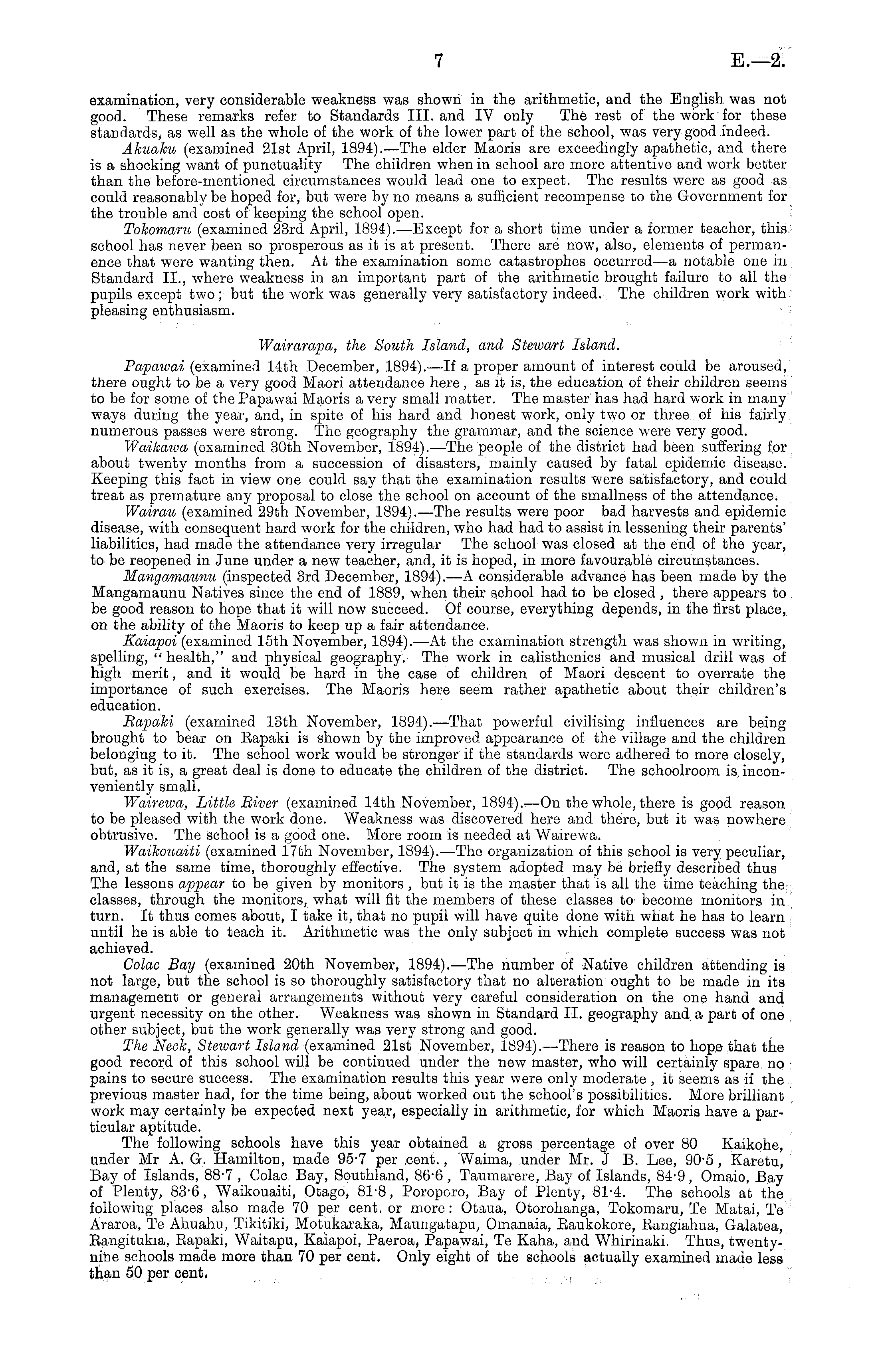 examination, very considerable weakness was shown in the arithmetic, and the English was not good. These remarks refer to Standards 111. and IV only The rest of the work for these standards, as well as the whole of the work of the lower part of the school, was very good indeed. Akiiaku (examined 21st April, 1894). —The elder Maoris are exceedingly apathetic, and there is a shocking want of punctuality The children when in school are more attentive and work better than the before-mentioned circumstances would lead one to expect. The results were as good as could reasonably be hoped for, but were by no means a suiiicient recompense to the Government for the trouble and cost of keeping the school open. Tohomaru (examined 23rd April, 1894). —Except for a short time under a former teacher, this school has never been so prosperous as it is at present. There are now, also, elements of permanence that were wanting then. At the examination some catastrophes occurred—a notable one in Standard 11., where weakness in an important part of the arithmetic brought failure to all the pupils except two; but the work was generally very satisfactory indeed. The children work with pleasing enthusiasm. Wairarapa, the South Island, and Stewart Island. Papawai (examined 14th December, 1894). —If a proper amount of interest could be aroused, there ought to be a very good Maori attendance here, as it is, the education of their children seems to be for some of the Papawai Maoris a very small matter. The master has had hard work in many ways during the year, and, in spite of his hard and honest work, only two or three of his fairly numerous passes were strong. The geography the grammar, and the science were very good. Waikaiva (examined 30th November, 1894). —The people of the district had been suffering for about twenty months from a succession of disasters, mainly caused by fatal epidemic disease. Keeping this fact in view one could say that the examination results were satisfactory, and could treat as premature any proposal to close the school on account of the smallness of the attendancei Wairau (examined 29th November, 1894). —The results were poor bad harvests and epidemic disease, with consequent hard work for the children, who had had to assist in lessening their parents' liabilities, had made the attendance very irregular The school was closed at the end of the year, to be reopened in June under a new teacher, and, it is hoped, in more favourable circumstances. Mangamaunu (inspected 3rd December, 1894). —A considerable advance has been made by the Mangamaunu Natives since the end of 1889, when their school had to be closed , there appears to be good reason to hope that it will now succeed. Of course, everything depends, in the first place, on the ability of the Maoris to keep up a fair attendance. Kaiapoi (examined 15th November, 1894). —At the examination strength was shown in writing, spelling, " health," and physical geography. The work in calisthenics and musical drill was of high merit, and it would be hard in the case of children of Maori descent to overrate the importance of such exercises. The Maoris here seem rather apathetic about their children's education. Bapaki (examined 13th November, 1894). —That powerful civilising influences are being brought to bear on Eapaki is shown by the improved appearance of the village and the children belonging to it. The school work would be stronger if the standards were adhered to more closely, but, as it is, a great deal is done to educate the children of the district. The schoolroom is inconveniently small. Wairewa, Little Biver (examined 14th November, 1894). —On the whole, there is good reason to be pleased with the work done. Weakness was discovered here and there, but it was nowhere obtrusive. The school is a good one. More room is needed at Wairewa. Waikouaiti (examined 17th November, 1894). —The organization of this school is very peculiar, and, at the same time, thoroughly effective. The system adopted may be briefly described thus The lessons appear to be given by monitors , but it is the master that is all the time teaching the classes, through the monitors, what will fit the members of these classes to become monitors in turn. It thus comes about, I take it, that no pupil will have quite done with what he has to learn until he is able to teach it. Arithmetic was the only subject in which complete success was not achieved. Colac Bay (examined 20th November, 1894). —The number of Native children attending is not large, but the school is so thoroughly satisfactory that no alteration ought to be made in its management or general arrangements without very careful consideration on the one hand and urgent necessity on the other. Weakness was shown in Standard 11. geography and a part of one other subject, but the work generally was very strong and good. The Neck, Stewart Island (examined 21st November, 1894). —There is reason to hope that the good record of this school will be continued under the new master, who will certainly spare no pains to secure success. The examination results this year were only moderate , it seems as if the previous master had, for the time being, about worked out the school's possibilities. More brilliant work may certainly be expected next year, especially in arithmetic, for which Maoris have a particular aptitude. The following schools have this year obtained a gross percentage of over 80 Kaikohe, under Mr A. G. Hamilton, made 95-7 per cent., Waima, under Mr. J B. Lee, 90-5, Karetu, Bay of Islands, 88-7 , Colac Bay, Southland, 866 , Taumarere, Bay of Islands, 84-9, Omaio, Bay of Plenty, 83-6, Waikouaiti, Otago, 81-8, Poroporo, Bay of Plenty, 81-4. The schools at the following places also made 70 per cent, or more: Otaua, Otorohanga, Tokomaru, Te Matai, Te Araroa, Te Ahuahu, Tikitiki, Motukaraka, Maungatapu, Omanaia, Eaukokore, Eangiahua, Galatea, Eangitukia, Eapaki, Waitapu, Kaiapoi, Paeroa, Papawai, 