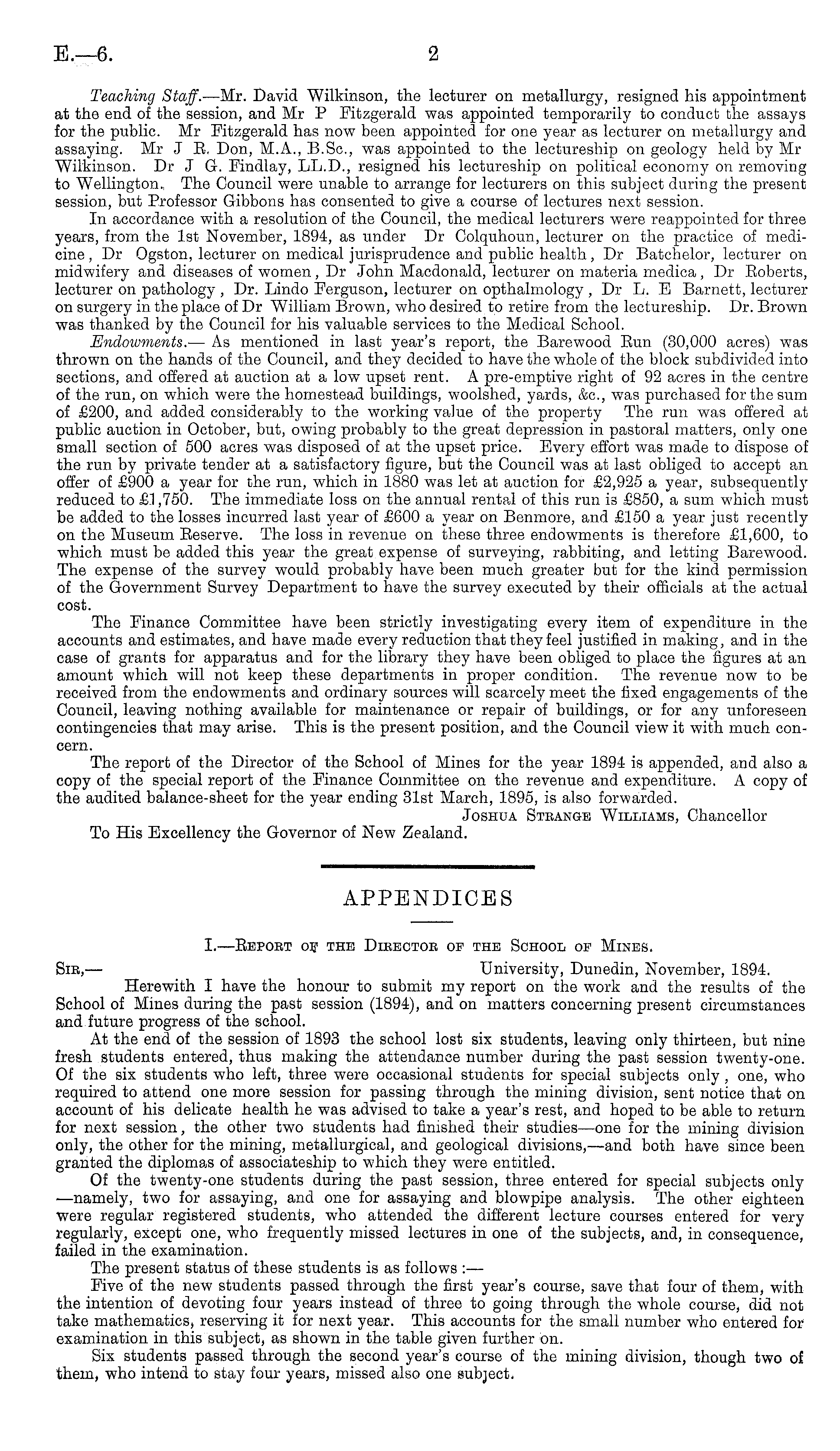 Teaching Staff. —Mr. David Wilkinson, the lecturer on metallurgy, resigned his appointment at the end of the session, and Mr P Fitzgerald was appointed temporarily to conduct the assays for the public. Mr Fitzgerald has now been appointed for one year as lecturer on metallurgy and assaying. Mr J B, Don, M.A., B.Sc, was appointed to the lectureship on geology held by Mr Wilkinson. Dr J G. Findlay, LL.D., resigned his lectureship on political economy on removing to Wellington., The Council were unable to arrange for lecturers on this subject during the present session, but Professor Gibbons has consented to give a course of lectures next session. In accordance with a resolution of the Council, the medical lecturers were reappointed for three years, from the Ist November, 1894, as under Dr Colquhoun, lecturer on the practice of medicine , Dr Ogston, lecturer on medical jurisprudence and public health, Dr Batchelor, lecturer on midwifery and diseases of women, Dr John Macdonald, lecturer on materia medica, Dr Eoberts, lecturer on pathology , Dr. Lindo Ferguson, lecturer on opthalmology , Dr L. B Barnett, lecturer on surgery in the place of Dr William Brown, who desired to retire from the lectureship. Dr. Brown was thanked by the Council for his valuable services to the Medical School. Endowments. — As mentioned in last year's report, the Barewood Eun (30,000 acres) was thrown on the hands of the Council, and they decided to have the whole of the block subdivided into sections, and offered at auction at a low upset rent. A pre-emptive right of 92 acres in the centre of the run, on which were the homestead buildings, woolshed, yards, &c, was purchased for the sum of £200, and added considerably to the working value of the property The run was offered at public auction in October, but, owing probably to the great depression in pastoral matters, only one small section of 500 acres was disposed of at the upset price. Every effort was made to dispose of the run by private tender at a satisfactory figure, but the Council was at last obliged to accept an offer of £900 a year for the run, which in 1880 was let at auction for £2,925 a year, subsequently reduced to £.1,750. The immediate loss on the annual rental of this run is £850, a sum which must be added to the losses incurred last year of £600 a year on Benmore, and £150 a year just recently on the Museum Eeserve. The loss in revenue on these three endowments is therefore £1,600, to which must be added this year the great expense of surveying, rabbiting, and letting Barewood. The expense of the survey would probably have been much greater but for the kind permission of the Government Survey Department to have the survey executed by their officials at the actual cost. The Finance Committee have been strictly investigating every item of expenditure in the accounts and estimates, and have made every reduction that they feel justified in making, and in the case of grants for apparatus and for the library they have been obliged to place the figures at an amount which will not keep these departments in proper condition. The revenue now to be received from the endowments and ordinary sources will scarcely meet the fixed engagements of the Council, leaving nothing available for maintenance or repair of buildings, or for any unforeseen contingencies that may arise. This is the present position, and the Council view it with much concern. The report of the Director of the School of Mines for the year 1894 is appended, and also a copy of the special report of the Finance Committee on the revenue and expenditure. A copy of the audited balance-sheet for the year ending 31st March, 1895, is also forwarded. Joshua Stbange Williams, Chancellor To His Excellency the Governor of New Zealand.