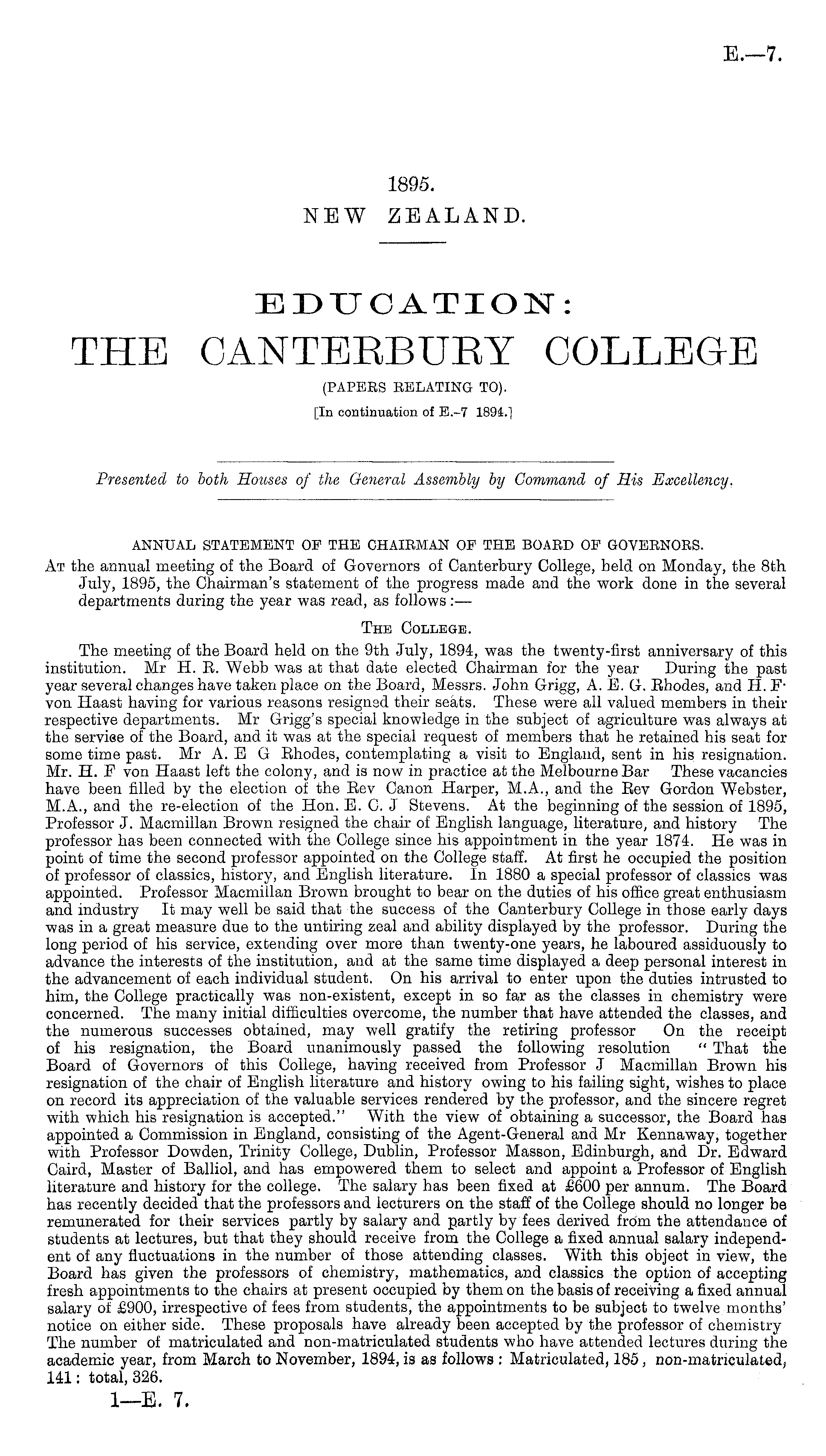 EDUCATION: THE CANTERBURY COLLEGE (PAPERS RELATING TO). [In continuation of E.-7 1894.]