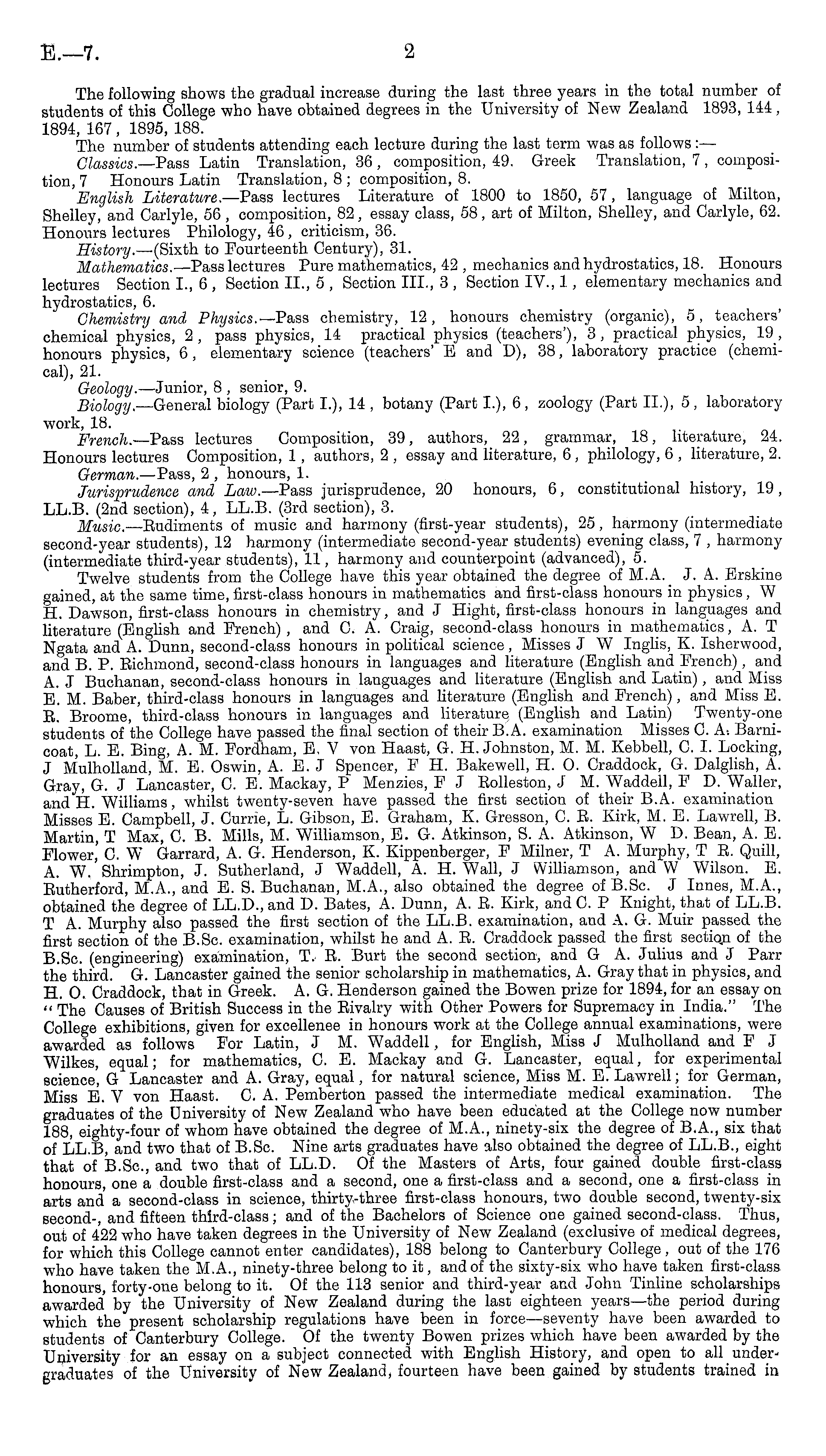 The following shows the gradual increase during the last three years in the total number of students of this College who have obtained degrees in the University of New Zealand 1893, 144, 1894, 167, 1895, 188. The number of students attending each lecture during the last term was as follows : — Classics.— Pass Latin Translation, 36 , composition, 49. Greek Translation, 7 , composition, 7 Honours Latin Translation, 8 ; composition, 8. English Literature. —Pass lectures Literature of 1800 to 1850, 57, language of Milton, Shelley, and Carlyle, 56 , composition, 82, essay class, 58, art of Milton, Shelley, and Carlyle, 62. Honours lectures Philology, 46, criticism, 36. History.—(Sixth to Fourteenth Century), 31. Mathematics. —Pass lectures Pure mathematics, 42 , mechanics and hydrostatics, 18. Honours lectures Section 1., 6 , Section 11., 5 , Section 111., 3 , Section IV., 1, elementary mechanics and hydrostatics, 6. Chemistry and Physios.— Pass chemistry, 12, honours chemistry (organic), 5, teachers' chemical physics, 2 , pass physics, 14 practical physics (teachers'), 3, practical physics, 19 , honours physics, 6, elementary science (teachers' E and D), 38, laboratory practice (chemical), 21. Geology. —Junior, 8 , senior, 9. Biology.—General biology (Part I.), 14 , botany (Part I.), 6, zoology (Part II.), 5 , laboratory work, 18. French.— Pass lectures Composition, 39, authors, 22, grammar, 18, literature, 24. Honours lectures Composition, 1, authors, 2 , essay and literature, 6, philology, 6 , literature, 2. German. —Pass, 2 , honours, 1. Jurisprudence and Lazy.—Pass jurisprudence, 20 honours, 6, constitutional history, 19, LL.B. (2nd section), 4, LL.B. (3rd section), 3. Music— Eudiments of music and harmony (first-year students), 25, harmony (intermediate second-year students), 12 harmony (intermediate second-year students) evening class, 7 , harmony (intermediate third-year students), 11, harmony and counterpoint (advanced), 5. Twelve students from the College have this year obtained the degree of M.A. J. A. Erskine gained, at the same time, first-class honours in mathematics and first-class honours in physics, W H. Dawson, first-class honours in chemistry, and J Hight, first-class honours in languages and literature (English and French) , and C. A. Craig, second-class honours in mathematics, A. T Ngata and A. Dunn, second-class honours in political science, Misses J W Inglis, K. Isherwood, and B. P. Kichmond, second-class honours in languages and literature (English and French), and A. J Buchanan, second-class honours in languages and literature (English and Latin), and Miss E. M. Baber, third-class honours in languages and literature (English and French), and Miss E. E. Broome, third-class honours in languages and literature (English and Latin) Twenty-one students of the College have passed the final section of their B.A. examination Misses C. A. Barnicoat, L. E. Bing, A. M. Fordham, E, V yon Haast, G. H.Johnston, M. M. Kebbell, C. I. Locking, J Mulholland, M. E. Oswin, A. E. J Spencer, F H. Bakewell, H. 0. Craddock, G. Dalglish, A. Gray, G. J Lancaster, C. E. Mackay, P Menzies, F J Eolleston, J M. Waddell, F D. Waller, and H. Williams, whilst twenty-seven have passed the first section of their B.A. examination Misses E. Campbell, J. Cnrrie, L. Gibson, E. Graham, K. Gresson, C. E. Kirk, M. E. Lawrell, B. Martin, T Max, C. B. Mills, M. Williamson, E. G. Atkinson, S. A. Atkinson, W D. Bean, A. E. Flower,' C. W Garrard, A. G. Henderson, K. Kippenberger, F Milner, T A. Murphy, T E. Quill, A. W. Shrimpton, J. Sutherland, J Waddell, A. H. Wall, J Williamson, and W Wilson. E. Eutherford, M.A., and E. S. Buchanan, M.A., also obtained the degree of B.Sc. J Innes, M.A., obtained the degree of LL.D., and D. Bates, A. Dunn, A. R. Kirk, and C. P Knight, that of LL.B. T A. Murphy also passed the first section of the LL.B. examination, and A. G. Muir passed the first section of the B.Sc. examination, whilst he and A. E. Craddock passed the first section of the B.Sc. (engineering) examination, T. R. Burt the second section, and G A. Julius and J Parr the third. G. Lancaster gained the senior scholarship in mathematics, A. Gray that in physics, and H. O. Craddock, that in Greek. A. G. Henderson gained the Bowen prize for 1894, for an essay on " The Causes of British Success in the Eivalry with Other Powers for Supremacy in India." The College exhibitions, given for excellence in honours work at the College annual examinations, were awarded as follows For Latin, J M. Waddell, for English, Miss J Mulholland and F J Wilkes, equal; for mathematics, C. E. Mackay and G. Lancaster, equal, for experimental science', G Lancaster and A. Gray, equal, for natural science, Miss M. E. Lawrell; for German, Miss E. V yon Haast. C. A. Pemberton passed the intermediate medical examination. The graduates of the University of New Zealand who have been educated at the College now number 188, eighty-four of whom have obtained the degree of M.A., ninety-six the degree of 8.A., six that of LL.B, and two that of B.Sc. Nine arts graduates have also obtained the degree of LL.B., eight that of B.Sc, and two that of LL.D. Of the Masters of Arts, four gained double first-class honours, one a double first-class and a second, one a first-class and a second, one a first-class in arts and a second-class in science, thirty-three first-class honours, two double second, twenty-six second-, and fifteen third-class; and of the Bachelors of Science one gained second-class. Thus, out of 422 who have taken degrees in the University of New Zealand (exclusive of medical degrees, for which this College cannot enter candidates), 188 belong to Canterbury College, out of the 176 who have taken the M.A., ninety-three belong to it, and of the sixty-six who have taken first-class honours, forty-one belong to it. Of the 113 senior and third-year and John Tinline scholarships awarded by the University of New Zealand during the las