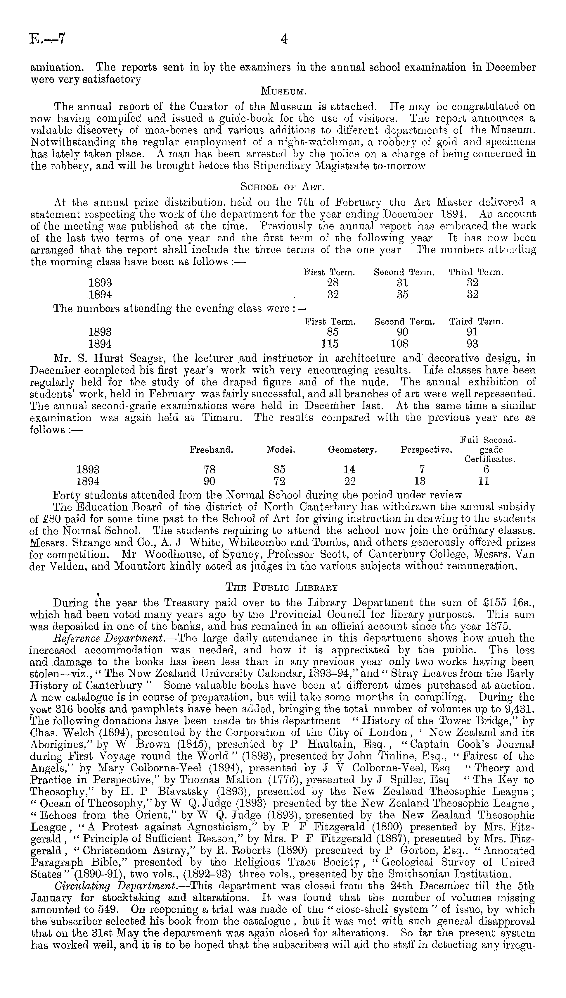 animation. The reports sent in by the examiners in the annual school examination in December were very satisfactory Museum. The annual report of the Curator of the Museum is attached. He may be congratulated on now having compiled and issued a guide-book for the use of visitors. The report announces a valuable discovery of moa-bones and various additions to different departments of the Museum. Notwithstanding the regular employment of a night-watchman, a robbery of gold and specimens has lately taken place. A man has been arrested by the police on a charge of being concerned in the robbery, and will be brought before the Stipendiary Magistrate to-morrow School of Abt. At the annual prize distribution, held on the 7th of February the Art Master delivered a statement respecting the work of the department for the year ending December 1894. An account of the meeting was published at the time. Previously the annual report has embraced the work of the last two terms of one year and the first term of the following year It has now been arranged that the report shall include the three terms of the one year The numbers attending the morning class have been as follows : — First Term. Second Term. Third Term. 1893 28 81 32 1894 . 32 35 32 The numbers attending the evening class were : — First Term. Second Term. Third Term. 1893 85 90 91 1894 115 108 93 Mr. S. Hurst Seager, the lecturer and instructor in architecture and decorative design, in December completed his first year's work with very encouraging results. Life classes have been regularly held for the study of the draped figure and of the nude. The annual exhibition of students' work, held in February was fairly successful, and all branches of art were well represented. The annual second-grade examinations were held in December last. At the same time a similar examination was again held at Tiinaru. The results compared with the previous year are as follows :— Full SecondFreehand. Model. Geometery. Perspective. grade Certificates. 1893 78 85 14 7 6 1894 90 72 22 13 11 Forty students attended from the Normal School during the period under review The Education Board of the district of North Canterbury has withdrawn the annual subsidy of £80 paid for some time past to the School of Art for giving instruction in drawing to the students of the Normal School. The students requiring to attend the school now join the ordinary classes. Messrs. Strange and Co., A. J White, Whitcombe and Tombs, and others generously offered prizes for competition. Mr Woodhouse, of Sydney, Professor Scott, of Canterbury College, Messrs. Van der Velden, and Mountfort kindly acted as judges in the various subjects without remuneration. The Public Libeaby During the year the Treasury paid over to the Library Department the sum of £155 165., which had been voted many years ago by the Provincial Council for library purposes. This sum was deposited in one of the banks, and has remained in an official account since the year 1875. Reference Department. —The large daily attendance in this department shows how much the increased accommodation was needed, and how it is appreciated by the public. The loss and damage to the books has been less than in any previous year only two works having been stolen—viz., " The New Zealand University Calendar, 1893-94," and " Stray Leaves from the Early History of Canterbury " Some valuable books have been at different times purchased at auction. A new catalogue is in course of preparation, but will take some months in compiling. During the year 316 books and pamphlets have been added, bringing the total number of volumes up to 9,431. The following donations have been made to this department " History of the Tower Bridge," by Chas. Welch (1894), presented by the Corporation of the City of London, ' New Zealand and its Aborigines," by W Brown (1845), presented by P Haultain, Esq., "Captain Cook's Journal during First Voyage round the World " (1893), presented by John Tinline, Esq., " Fairest of the Angels," by Mary Colborne-Veel (1894), presented by J V Colborne-Veel, Esq "Theory and Practice in Perspective," by Thomas Malton (1776), presented by J Spiller, Esq " The Key to Theosophy," by H. P Blavatsky (1893), presented by the New Zealand Theosophic League ; " Ocean of Theosophy," by W Q. Judge (1893) presented by the New Zealand Theosophic League , "Echoes from the Orient," by W Q. Judge (1893), presented by the New Zealand Theosophic League, "A Protest against Agnosticism," by P F Fitzgerald (1890) presented by Mrs. Fitzgerald , " Principle of Sufficient Eeason," by Mrs. P F Fitzgerald (1887), presented by Mrs. Fitzgerald , " Christendom Astray," by R. Eoberts (1890) presented by P Gorton, Esq., " Annotated Paragraph Bible," presented by the Eeligious Tract Society, " Geological Survey of United States" (1890-91), two vols., (1892-93) three vols., presented by the Smithsonian Institution. Circulating Department. —This department was closed from the 24th December till the sth January for stocktaking and alterations. It was found that the number of volumes missing amounted to 549. On reopening a trial was made of the " close-shelf system "of issue, by which the subscriber selected his book from the catalogue , but it was met with such general disapproval that on the 31st May the department was again closed for alterations. So far the present system has worked well, and it is to be hoped that the subscribers will aid the staff in detecting any irregu-
