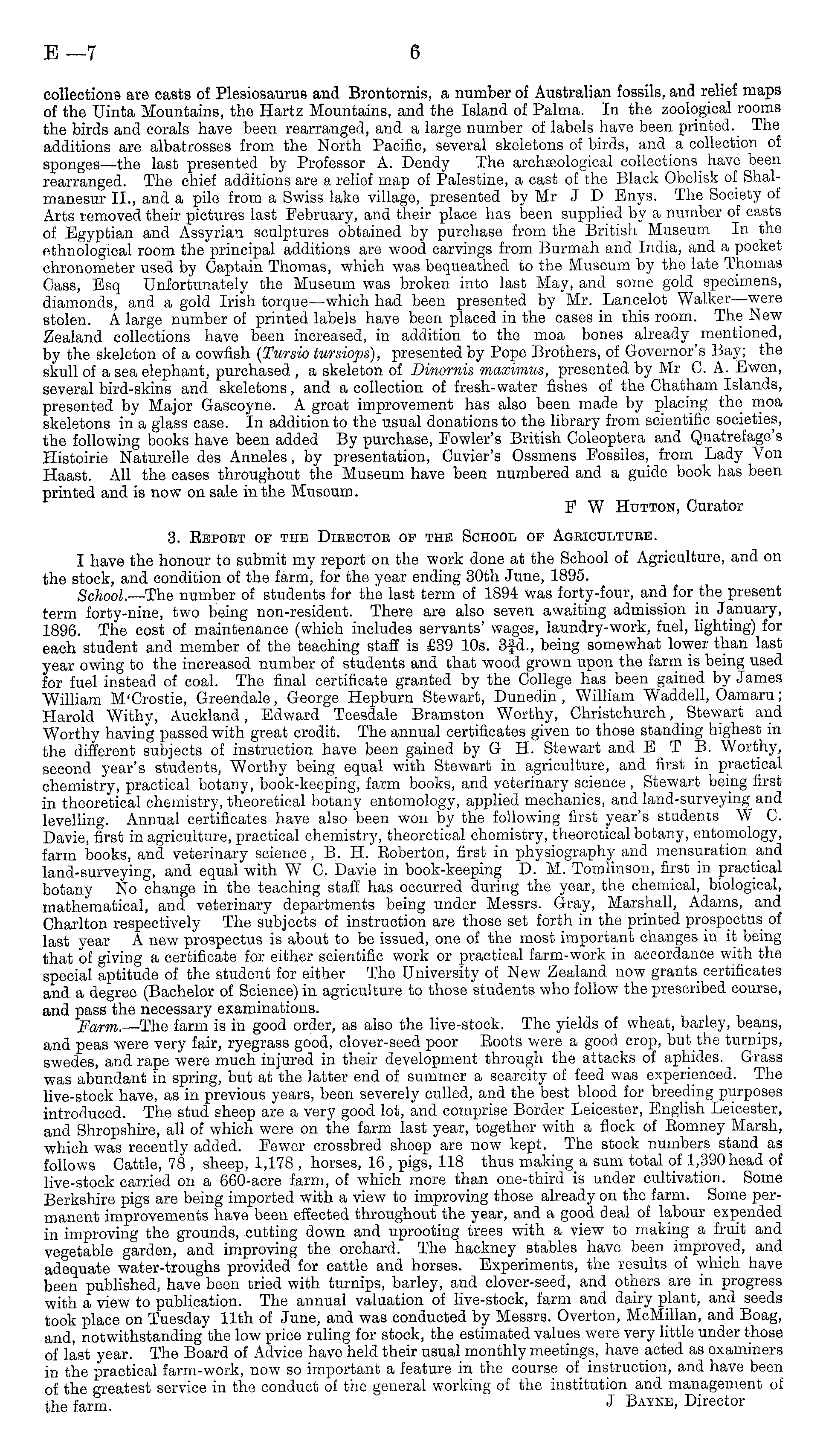 collections are easts of Plesiosaurus and Brontornis, a number of Australian fossils, and relief maps of the Uinta Mountains, the Hartz Mountains, and the Island of Palma. In the zoological rooms the birds and corals have been rearranged, and a large number of labels have been printed. _ The additions are albatrosses from the North Pacific, several skeletons of birds, and a collection of sponges—the last presented by Professor A. Dendy The archaeological collections_ have been rearranged. The chief additions are a relief map of Palestine, a cast of the Black Obelisk of Shalmanesur 11., and a pile from a Swiss lake village, presented by Mr J D Bays. The Society of Arts removed their pictures last February, and their place has been supplied by a number of casts of Egyptian and Assyrian sculptures obtained by purchase from the British Museum In the ethnological room the principal additions are wood carvings from Burmah and India, and a pocket chronometer used by Captain Thomas, which was bequeathed to the Museum by the late Thomas Cass, Esq Unfortunately the Museum was broken into last May, and some gold specimens, diamonds, and a gold Irish torque —which had been presented by Mr. Lancelot Walker —were stolen. A large number of printed labels have been placed in the cases in this room. The New Zealand collections have been increased, in addition to the moa bones already mentioned, by the skeleton of a cowfish (Tursio tursiops), presented by Pope Brothers, of Governor's Bay; the skull of a sea elephant, purchased , a skeleton of Dinornis maximus, presented by Mr C. A. Ewen, several bird-skins and skeletons, and a collection of fresh-water fishes of the Chatham Islands, presented by Major Gascoyne. A great improvement has also been made by placing the moa skeletons in a glass case. In addition to the usual donations to the library from scientific societies, the following books have been added By purchase, Fowler's British Coleoptera and Quatrefage's Histoirie Naturelle dcs Anneles, by presentation, Cuvier's Ossmens Fossiles, from Lady Yon Haast. All the cases throughout the Museum have been numbered and a guide book has been printed and is now on sale in the Museum. F W Hutton, Curator 3. Beport of the Director of the School of Agriculture. I have the honour to submit my report on the work done at the School of Agriculture, and on the stock, and condition of the farm, for the year ending 30th June, 1895. School. —The number of students for the last term of 1894 was forty-four, and for the present term forty-nine, two being non-resident. There are also seven awaiting admission in January, 1896. The cost of maintenance (which includes servants' wages, laundry-work, fuel, lighting) for each student and member of the teaching staff is £39 10s. 3fd., being somewhat lower than last year owing to the increased number of students and that wood grown upon the farm is being used for fuel instead of coal. The final certificate granted by the College has been gained by James William M'Crostie, Greendale, George Hepburn Stewart, Dunedin, William Waddell, Oamaru; Harold Withy, Auckland, Edward Teesdale Bramston Worthy, Ohristchurch ,_ Stewart and Worthy having passed with great credit. The annual certificates given to those standing highest in the different subjects of instruction have been gained by GH. Stewart and TB. Worthy, second year's students, Worthy being equal with Stewart in agriculture, and first in practical chemistry, practical botany, book-keeping, farm books, and veterinary science, Stewart being first in theoretical chemistry, theoretical botany entomology, applied mechanics, and land-surveying_ and levelling. Annual certificates have also been won by the following first year's students W C. Davie, first in agriculture, practical chemistry, theoretical chemistry, theoretical botany, entomology, farm books, and veterinary science, B. H.'Boberton, first in physiography and mensuration and land-surveying, and equal with W C. Davie in book-keeping D. M. Tomlinson, first in practical botany No change in the teaching staff has occurred during the year, the chemical, biological, mathematical, and veterinary departments being under Messrs. Gray, Marshall, Adams, and Charlton respectively The subjects of instruction are those set forth in the printed prospectus of last year A new prospectus is about to be issued, one of the most important changes in it being that of giving a certificate for either scientific work or practical farm-work in accordance with the special aptitude of the student for either The University of New Zealand now grants certificates and a degree (Bachelor of Science) in agriculture to those students who follow the prescribed course, and pass the necessary examinations. Farm. —The farm is in good order, as also the live-stock. The yields of wheat, barley, beans, and peas were very fair, ryegrass good, clover-seed poor Boots were a good crop, but the turnips, swedes, and rape were much injured in their development through the attacks of aphides. Grass was abundant in spring, but at the Jatter end of summer a scarcity of feed was experienced. The live-stock have, as in previous years, been severely culled, and the best blood for breeding purposes introduced. The stud sheep are a very good lot, and comprise Border Leicester, English Leicester, and Shropshire, all of which were on the farm last year, together with a flock of Somney Marsh, which was recently added. Fewer crossbred sheep are now kept. The stock numbers stand as follows Cattle, 78 , sheep, 1,178 , horses, 16, pigs, 118 thus making a sum total of 1,390 head of live-stock carried on a 660-acre farm, of which more than one-third is under cultivation. Some Berkshire pigs are being imported with a view to improving those already on the farm. Some permanent improvements have been effected throughout the year, and a good deal of labour expended in improving the grounds, cutting down and uprooting trees with a view 