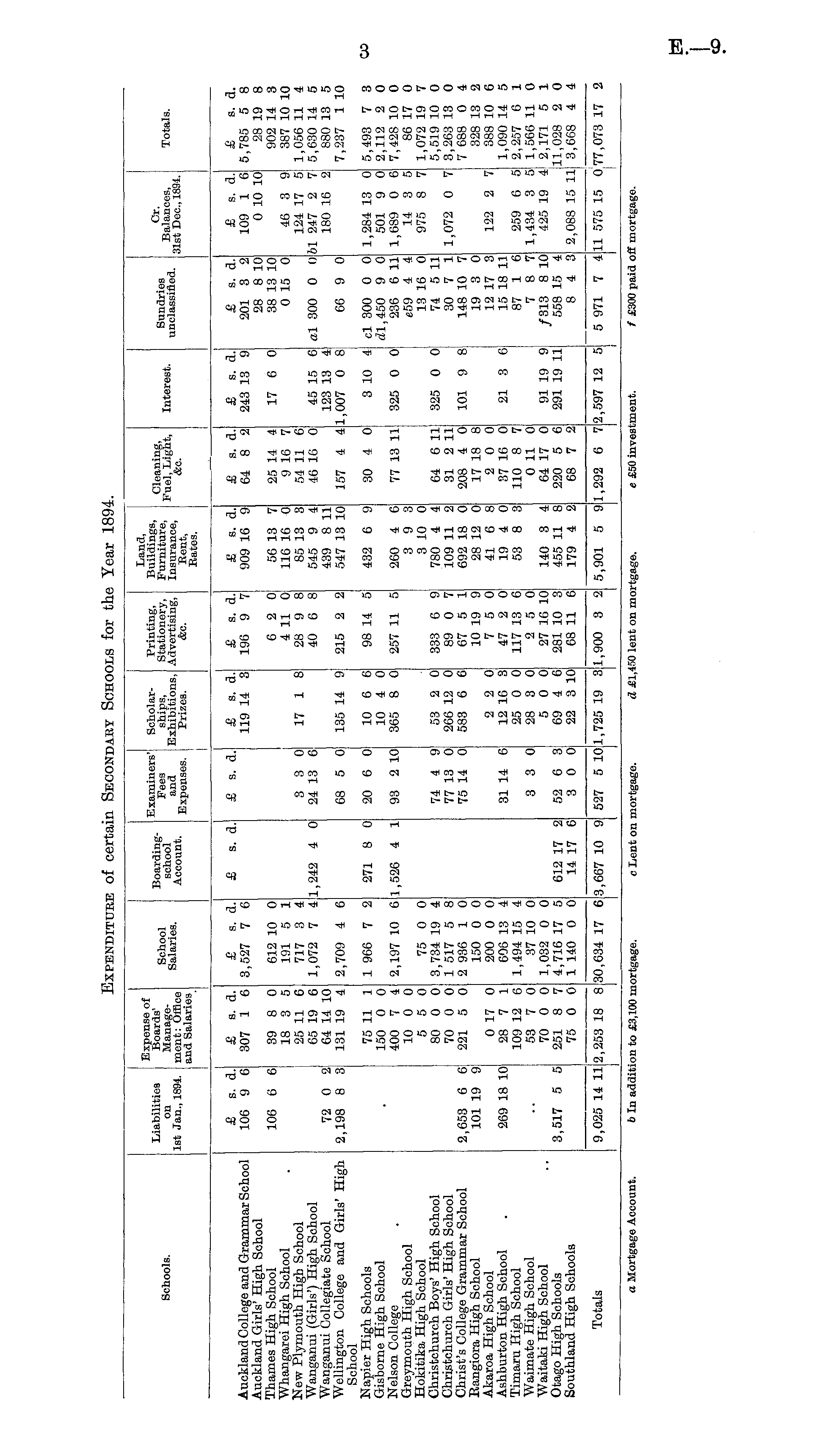 Schools. Liabilities on 1st Jan., 1894. Expense of Boards' Management: Office and Salaries School Salaries. Boardingschool Account. ExaminersFees and Expenses. Scholarships, Exhibitions, Prizes. Printing, Stationery, Advertising, &c. Land, Buildings, Furniture, Insurance, Eent, Eates. Cleaning, Fuel, Light, &c. Interest. Sundries unclassified. Cr. Balances, 31st Dec, 1894. Totals. £ s. d. 106 9 6 £ s. a. 307 1 6 £ s. a. 3,527 7 6 £ s. a. £ s. a. £ s. d. 119 14 3 £ s. a. 196 9 7 £ s. a. 909 16 9 £ s. a. 64 8 2 £ s. a. 243 13 9 £ s. a. 201 3 2 28 8 10 38 13 10 0 15 0 £ s. a. 109 1 6 0 10 10 £ s. a. 5,785 5 8 28 19 8 902 14 3 387 10 10 1,056 11 4 5,630 14 5 880 13 5 7,237 1 10 Auckland College and Grammar School Auckland Girls' High School Thames High School Whangarei High School New Plymouth High School Wanganui (Girls') High School Wanganui Collegiate School Wellington College and Girls' High School Napier High Schools Gisborne High School Nelson College Greymouth High School Hokitika High School Christchurch Boys' High School Christchurch Girls' High School Christ's College Grammar School Rangiora High School Akaroa High School Ashburton High School Timaru High School Waimate High School Waitaki High School Otago High Schools Southland High Schools 106 6 6 72 0 2 2,198 8 3 39 8 0 18 3 5 25 11 6 65 19 6 64 14 10 131 19 4 75 11 1 150 0 0 400 7 4 10 0 0 5 5 0 80 0 0 70 0 0 221 5 0 612 10 0 191 5 1 717 3 4 1,072 7 4 2,709 4 6 1 966 7 2 2,197 10 6 75 0 0 3,734 19 4 1 517 5 8 2 936 1 0 150 0 0 200 0 0 606 13 4 1,494 15 4 37 10 0 1,032 0 0 4,716 17 5 1 140 0 0 1,242 4 0 271 8 0 1,526 4 1 3 3 0 24 13 6 68 5 0 20 6 0 93 2 10 17 1 8 135 14 9 10 6 6 10 4 0 365 8 0 6 2 0 4 11 0 28 9 8 40 6 8 215 2 2 98 14 5 257 11 5 56 13 7 116 16 0 85 13 3 545 9 4 439 8 11 547 13 10 432 6 9 260 4 6 3 9 3 3 10 0 780 4 4 109 11 2 692 18 0 28 12 0 41 6 8 19 4 0 53 8 3 25 14 4 9 16 7 54 11 6 46 16 0 157 4 4 30 4 0 77 13 11 17 6 0 45 15 6 123 13 4 1,007 0 8 3 10 4 325 0 Oj al 300 0 Oi 66 9 0 cl 300 0 0 dl,450 9 0 236 6 11 e59 4 4 13 16 0 74 5 11 30 7 1 148 10 7 19 3 0 12 17 3 15 18 11 87 1 6 7 8 7 /313 8 10 558 15 4 8 4 3 46 3 9 124 17 5 61 247 2 7 180 16 2 1,284 13 0 501 9 0 1,689 0 6 14 3 5 975 8 7 5,493 7 3 2,112 2 0 7,428 10 0 86 17 0 1,072 19 7 5,519 10 0 3,263 13 0 7 688 0 4 328 13 2 388 10 6 1,090 14 5 2,257 6 1 1,566 11 0 2,171 5 1 11,028 2 0 3,668 4 4 2,653 6 6 101 19 9 74 4 9 77 13 0 75 14 0 53 2 0 266 12 0 583 6 6 333 6 9 89 0 7 67 5 1 10 19 9 7 5 0 47 2 0 117 13 6 2 5 0 27 16 10 281 10 3 68 11 6 64 6 11 31 2 11 208 4 0 17 18 8 2 0 0 37 16 0 110 8 7 0 11 0 64 17 0 220 5 6 68 7 2 325 0 Oj 101 9 8 1,072 0 7 0 17 0 28 7 1 109 12 6 53 7 0 70 0 0 251 8 7 75 0 0 31 14 6 2 2 0 12 16 3 25 0 0 28 3 0 5 0 0 69 4 6 22 3 10 21 3 6 122 2 7 269 18 10 259 6 5 1,434 3 5 i 425 19 4 3 3 0 91 19 9 291 19 11 3,517 5 5 612 17 2 14 17 6 52 6 3 3 0 0 140 3 4 455 11 8 179 4 2 i 2,088 15 11 Totals 9,025 14 11 2,253 18 8 30,634 17 6 3,667 10 9 527 5 10 1,725 19 3 1,900 3 2 5,901 5 9 1,292 6 7 2,597 12 5j 5 971 7 4 11 575 15 077,073 17 a Mortgage Account. b In addition to £3,100 irtgai !e. e Lent on mortgage. d £1,450 lent on mortgage. e £50 investment. f £300 paid off mortgage.