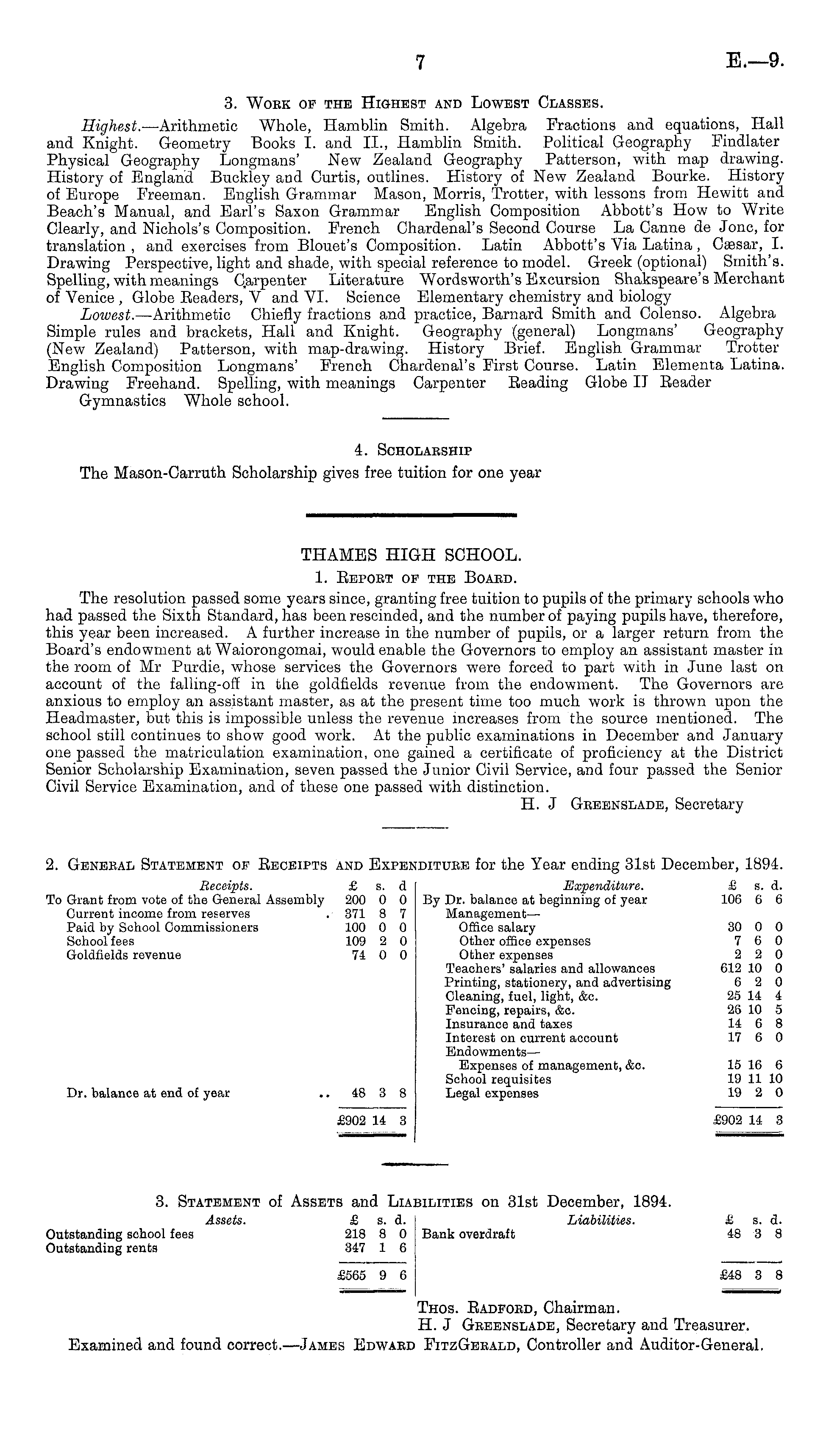 2. General Statement of Beceipts and Expenditure for the Year ending 31st December, 1894. Receipts. £ s. d Expenditure. £ s. d. To Grant from vote of the General Assembly 200 0 0 By Dr. balance at beginning of year 106 6 6 Current income from reserves . 371 8 7 Management— Paid by School Commissioners 100 0 0 Office salary 30 0 0 School fees 109 2 0 Other office expenses 7 6 0 Goldfields revenue 74 0 0 Other expenses 2 2 0 Teachers' salaries and allowances 612 10 0 Printing, stationery, and advertising 6 2 0 Cleaning, fuel, light, &c. 25 14 4 Fencing, repairs, &c. 28 10 5 Insurance and taxes 14 6 8 Interest on current account 17 6 0 Endowments — Expenses of management, &c. 15 16 6 School requisites 19 11 10 Dr. balance at end of year .. 48 3 8 Legal expenses 19 2 0 £902 14 3 £902 14 3 3. Statement of Assets and Liabilities on 31st December, 1894. Assets. £ s. d. Liabilities. £ s. d. Outstanding school fees 218 8 0 Bank overdraft 48 3 8 Outstanding rents 347 1 6 £565 9 6 £48 3 8 Thos. Badfoed, Chairman. H. J Geeenslade, Secretary and Treasurer. Examined and found correct.—James Edward FitzGeeald, Controller and Auditor-General.