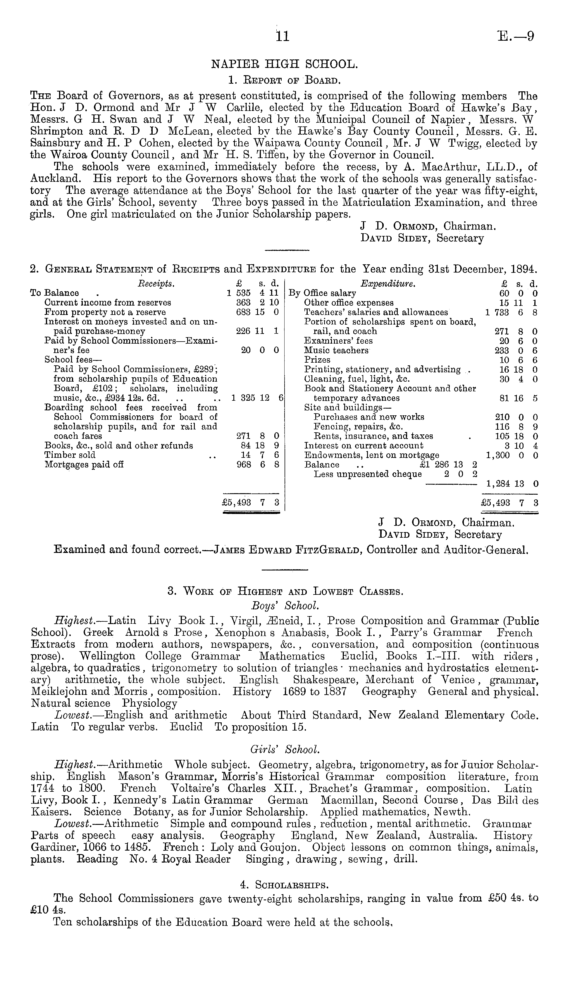 NAPIEB HIGH SCHOOL. 1. Bepoet of Boaed. The Board of Governors, as at present constituted, is comprised of the following members The Hon. J D. Ormond and Mr J W Carlile, elected by the Education Board of Hawke's Bay, Messrs. G H. Swan and J W Neal, elected by the Municipal Council of Napier, Messrs. W Shrimpton and B. D D McLean, elected by the Hawke's Bay County Council, Messrs. G. E. Sainsbury and H. P Cohen, elected by the Waipawa County Council, Mr. J W Twigg, elected by the Wairoa County Council, and Mr H. S. Tiffen, by the Governor in Council. The schools were examined, immediately before the recess, by A. Mac Arthur, LL.D., of Auckland. His report to the Governors shows that the work of the schools was generally satisfactory The average attendance at the Boys' School for the last quarter of the year was fifty-eight, and at the Girls' School, seventy Three boys passed in the Matriculation Examination, and three girls. One girl matriculated on the Junior Scholarship papers. J D. Oemond, Chairman. David Sidey, Secretary