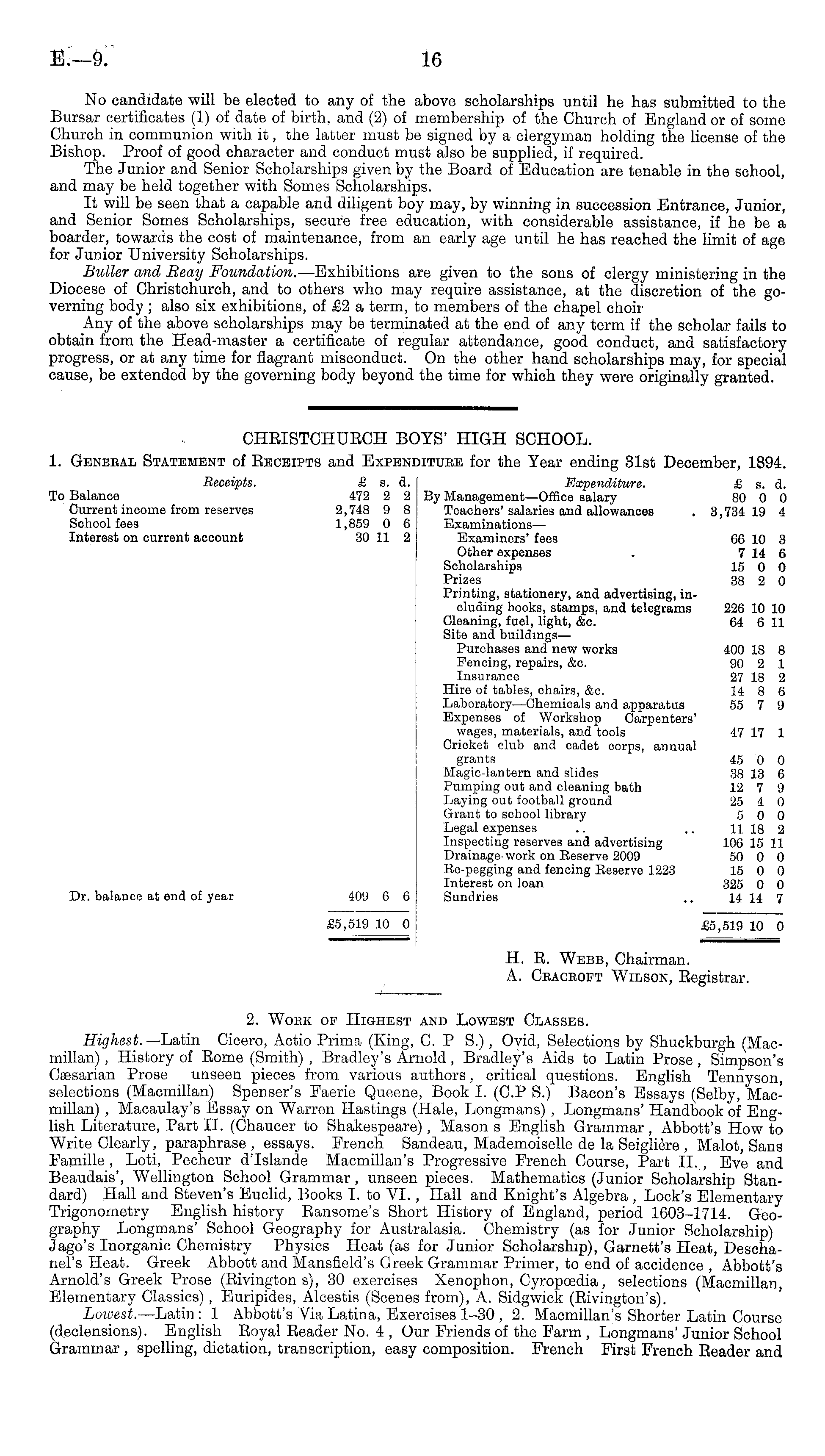 CHRISTCHURCH BOYS' HIGH SCHOOL. 1. General Statement of Beceipts and Expenditure for the Year ending 31st December, 1894. Receipts. £ s. d. Expenditure. £ s. d. To Balance 472 2 2 By Management—Office salary 80 0 0 Current income from reserves 2,748 9 8 Teachers'salaries and allowances . 3,734 19 4 School fees 1,859 0 6 Examinations— Interest on current account 30 11 2 Examiners' fees 66 10 3 Other expenses . 7 14 6 Scholarships 15 0 0 •' Prizes 38 2 0 Printing, stationery, and advertising, including books, stamps, and telegrams 226 10 10 Cleaning, fuel, light, &c. 64 6 11 Site and buildings— Purchases and new works 400 18 8 Fencing, repairs, &c. 90 2 1 Insurance 27 18 2 Hire of tables, chairs, &o. 14 8 6 Laboratory—Chemicals and apparatus 55 7 9 Expenses of Workshop Carpenters' wages, materials, and tools 47 17 1 Cricket club and cadet corps, annual grants 45 0 0 Magic-lantern and slides 38 13 6 Pumping out and cleaning bath 12 7 9 Laying out football ground 25 4 0 Grant to school library 5 0 0 Legal expenses .. .. 11 18 2 Inspecting reserves and advertising 106 15 11 Drainage-work on Reserve 2009 50 0 0 Re-pegging and fencing Reserve 1223 15 0 0 Interest on loan 325 0 0 Dr. balance at end of year 409 6 6 Sundries .. 14 14 7 £5,519 10 0 £5,519 10 0 H. B. Webb, Chairman. A. Ceaceoft Wilson, Begistrar.