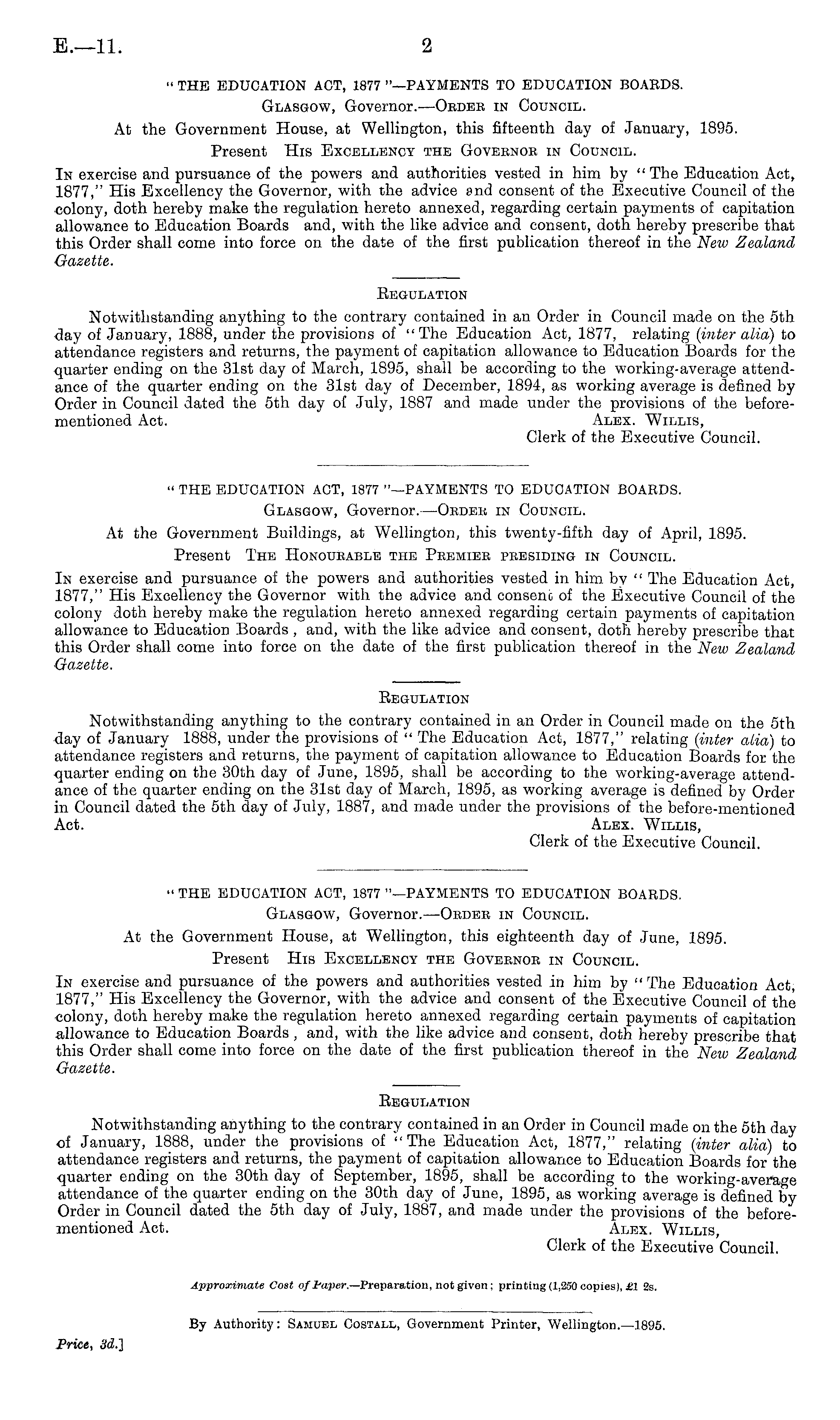 Regulation Notwithstanding anything to the contrary contained in an Order in Council made on the sth day of January, 1888, under the provisions of "The Education Act, 1877," relating (inter alia) to attendance registers and returns, the payment of capitation allowance to Education Boards for the quarter ending on the 30th day of September, 1895, shall be according to the working-average attendance of the quarter ending on the 30th day of June, 1895, as working average is defined by Order in Council dated the sth day of July, 1887, and made under the provisions of the beforementioned Act. Alex. Willis, Clerk of the Executive Council. Approximate Cost of Paper. —Preparation, not given ; printing (1,250 copies), £1 2s.