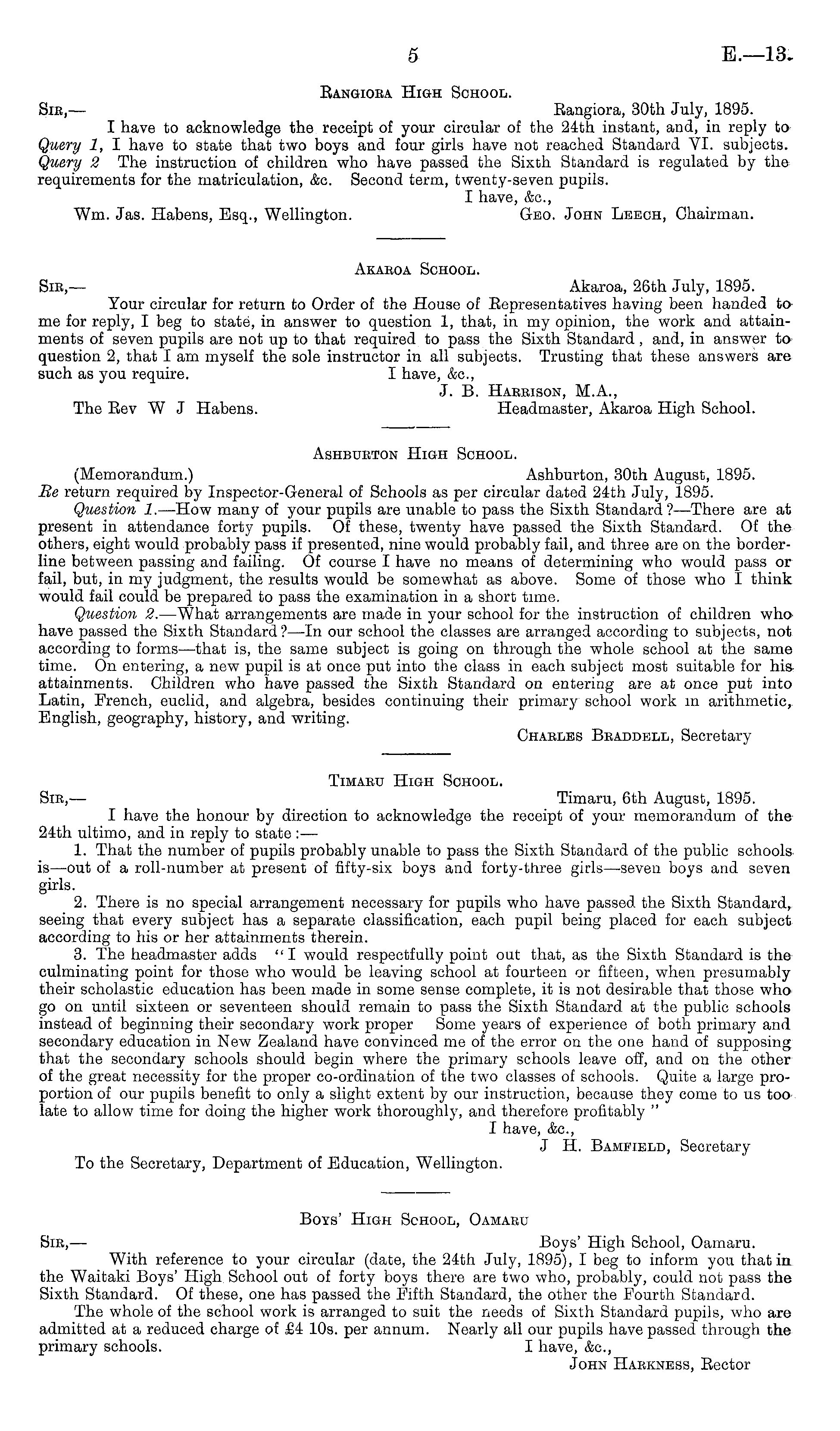 Ashburton High School. (Memorandum.) Ashburton, 30th August, 1895. Re return required by Inspector-General of Schools as per circular dated 24th July, 1895. Question I. —How many of your pupils are unable to pass the Sixth Standard?— There are at present in attendance forty pupils. Of these, twenty have passed the Sixth Standard. Of the others, eight would probably pass if presented, nine would probably fail, and three are on the borderline between passing and failing. Of course I have no means of determining who would pass or fail, but, in my judgment, the results would be somewhat as above. Some of those who I think would fail could be prepared to pass the examination in a short time. Question 2. —What arrangements are made in your school for the instruction of children who have passed the Sixth Standard ? —ln our school the classes are arranged according to subjects, not according to forms—that is, the same subject is going on through the whole school at the same time. On entering, a new pupil is at once put into the class in each subject most suitable for his attainments. Children who have passed the Sixth Standard on entering are at once put into Latin, French, euclid, and algebra, besides continuing their primary school work m arithmetic,, English, geography, history, and writing. Charles Braddell, Secretary
