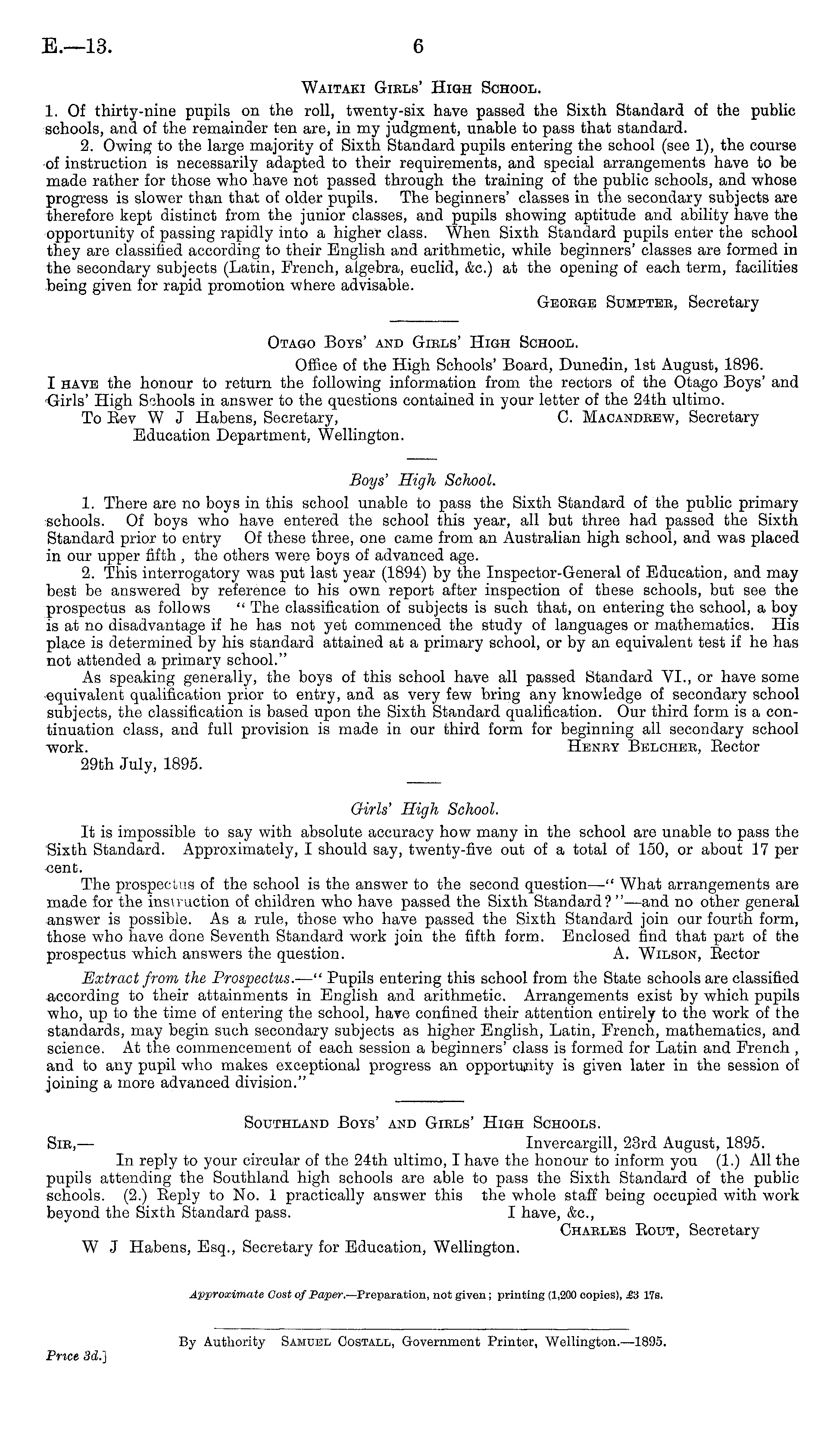 Southland Boys' and Girls' High Schools. Sir, — Invercargill, 23rd August, 1895. In reply to your circular of the 24th ultimo, I have the honour to inform you (1.) All the pupils attending the Southland high schools are able to pass the Sixth Standard of the public schools. (2.) Reply to No. 1 practically answer this the whole staff being occupied with work beyond the Sixth Standard pass. I have, &c, Charles Rout, Secretary W J Habens, Esq., Secretary for Education, Wellington. Approximate Cost of Paper—Preparation, not given; printing (1,200 copies), £3 17s.