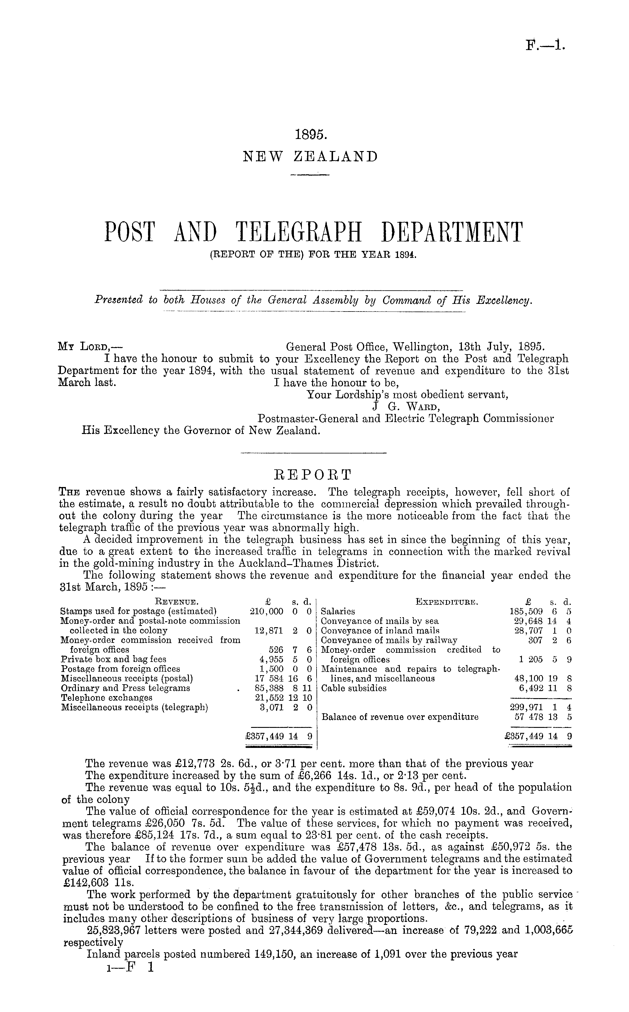 My Lord,—- General Post Office, Wellington, 13th July, 1895. I have the honour to submit to your Excellency the Eeport on the Post and Telegraph Department for the year 1894, with the usual statement of revenue and expenditure to the 31st March last. I have the honour to be, Your Lordship's most obedient servant, J G. Ward, Postmaster-General and Electric Telegraph Commissioner His Excellency the Governor of New Zealand.