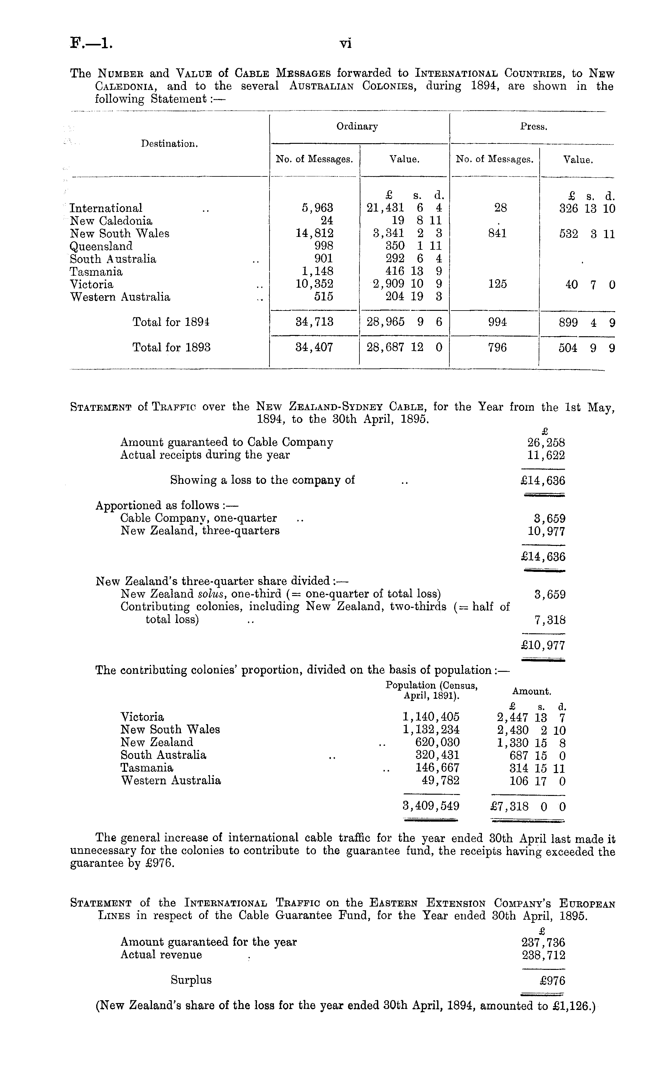 Statement of Traffic over the New Zealand-Sydney Cable, for the Year from the Ist May, 1894, to the 30th April, 1895. £ Amount guaranteed to Cable Company 26,258 Actual receipts during the year 11,622 Showing a loss to the company of .. £14,636 Apportioned as follows : — Cable Company, one-quarter .. 3,659 New Zealand, three-quarters 10,977 £14,636 New Zealand's three-quarter share divided :— New Zealand solus, one-third (= one-quarter of total loss) 3,659 Contributing colonies, including New Zealand, two-thirds (= half of total loss) .. 7,318 £10,977 The contributing colonies' proportion, divided on the basis of population:— Population (Census, . April, 1891). Amount. £ s. d. Victoria 1,140,405 2,447 13 7 New South Wales 1,132,234 2,430 2 10 New Zealand .. 620,030 1,330 15 8 South Australia .. 320,431 687 15 0 Tasmania .. 146,667 314 15 11 Western Australia 49,782 106 17 0 3,409,549 £7,318 0 0 The general increase of international cable traffic for the year ended 30th April last made it unnecessary for the colonies to contribute to the guarantee fund, the receipts having exceeded the guarantee by £976. Statement of the International Traffic on the Eastern Extension Company's European Lines in respect of the Cable Guarantee Fund, for the Year ended 30th April, 1895. £ Amount guaranteed for the year 237,736 Actual revenue . 238,712 Surplus £976 (New Zealand's share of the loss for the year ended 30th April, 1894, amounted to £1,126.)