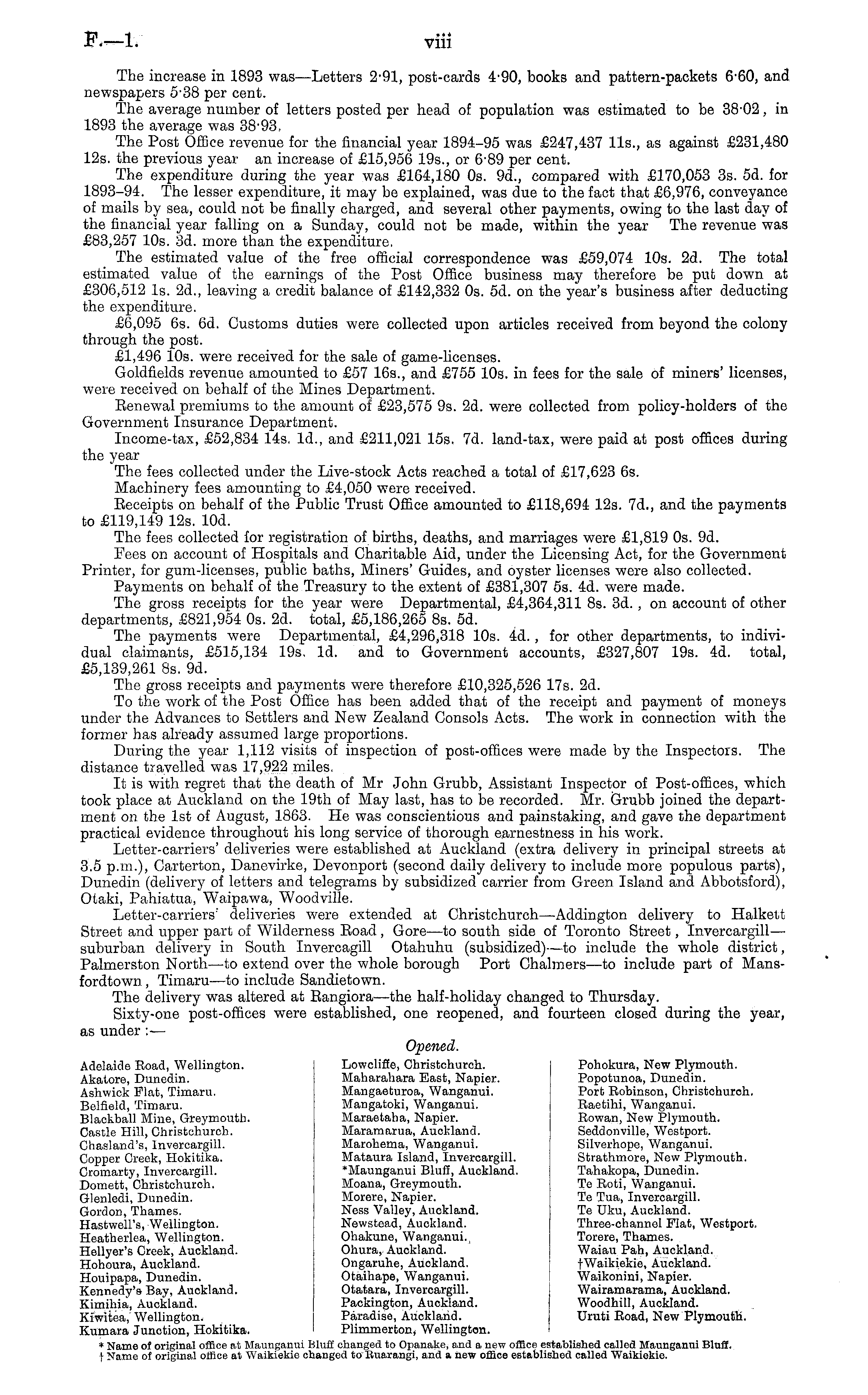 The increase in 1893 was—Letters 2-91, post-cards 490, books and pattern-packets 6-60, and newspapers 538 per cent. The average number of letters posted per head of population was estimated to be 38-02, in 1893 the average was 3893, The Post Office revenue for the financial year 1894-95 was £247,437 lis., as against £231,480 12s. the previous year an increase of £15,956 195., or 6-89 per cent. The expenditure during the year was £164,180 os. 9d., compared with £170,053 3s. sd. for 1893-94. The lesser expenditure, it may be explained, was due to the fact that £6,976, conveyance of mails by sea, could not be finally charged, and several other payments, owing to the last day of the financial year falling on a Sunday, could not be made, within the year The revenue was £83,257 10s. 3d. more than the expenditure. The estimated value of the free official correspondence was £59,074 10s. 2d. The total estimated value of the earnings of the Post Office business may therefore be put down at £306,512 Is. 2d., leaving a credit balance of £142,332 os. sd. on the year's business after deducting the expenditure. £6,095 6s. 6d. Customs duties were collected upon articles received from beyond the colony through the post. £1,496 10s. were received for the sale of game-licenses. Goldfields revenue amounted to £57 165., and £755 10s. in fees for the sale of miners' licenses, were received on behalf of the Mines Department. Renewal premiums to the amount of £23,575 9s. 2d. were collected from policy-holders of the Government Insurance Department. Income-tax, £52,834 14s. Id., and £211,021 15s. 7d. land-tax, were paid at post offices during the year The fees collected under the Live-stock Acts reached a total of £17,623 6s. Machinery fees amounting to £4,050 were received. Receipts on behalf of the Public Trust Office amounted to £118,694 12s. 7d., and the payments to £119,149 12s. lOd. The fees collected for registration of births, deaths, and marriages were £1,819 os. 9d. Fees on account of Hospitals and Charitable Aid, under the Licensing Act, for the Government Printer, for gum-licenses, public baths, Miners' Guides, and oyster licenses were also collected. Payments on behalf of the Treasury to the extent of £381,307 ss. 4d. were made. The gross receipts for the year were Departmental, £4,364,311 Bs. 3d. ,on account of other departments, £821,954 os. 2d. total, £5,186,265 Bs. sd. The payments were Departmental, £4,296,318 10s. 4d. , for other departments, to individual claimants, £515,134 19s, Id. and to Government accounts, £327,807 19s. 4d. total, £5,139,261 Bs. 9d. The gross receipts and payments were therefore £10,325,526 17s. 2d. To the work of the Post Office has been added that of the receipt and payment of moneys under the Advances to Settlers and New Zealand Consols Acts. The work in connection with the former has already assumed large proportions. During the year 1,112 visits of inspection of post-offices were made by the Inspectors. The distance travelled was 17,922 miles. It is with regret that the death of Mr John Grubb, Assistant Inspector of Post-offices, which took place at Auckland on the 19th of May last, has to be recorded. Mr. Grubb joined the department on the Ist of August, 1863. He was conscientious and painstaking, and gave the department practical evidence throughout his long service of thorough earnestness in his work. Letter-carriers' deliveries were established at Auckland (extra delivery in principal streets at 3.5 p.m.), Carterton, Danevirke, Devonport (second daily delivery to include more populous parts), Dunedin (delivery of letters and telegrams by subsidized carrier from Green Island and Abbotsford), Otaki, Pahiatua, Waipawa, Woodville. Letter-carriers' deliveries were extended at Christchurch—Addington delivery to Halkelt Street and upper part of Wilderness Road, Gore—to south side of Toronto Street, Invercargill— suburban delivery in South Invercagill Otahuhu (subsidized) —to include the whole district, Palmerston North —to extend over the whole borough Port Chalmers —to include part of Mansfordtown , Timaru —to include Sandietown. The delivery was altered at Rangiora—the half-holiday changed to Thursday. Sixty-one post-offices were established, one reopened, and fourteen closed during the year, as under :■ — Opened. Adelaide Road, Wellington. Lowclifie, Christchurch. Pohokura, New Plymouth. Akatore, Dunedin. Maharahara East, Napier. Popotunoa, Dunedin. Ashwick Plat, Timaru. Mangaeturoa, Wanganui. Port Robinson, Christchurch. Belfield, Timaru. Mangatoki, Wanganui. Raetihi, Wanganui. Blackball Mine, Greymouth. Maraetaha, Napier. Rowan, New Plymouth. Castle Hill, Christchurch. Maramarua, Auckland. Seddonville, Westport. Chasland's, Invercargill. Marohema, Wanganui. Silverhope, Wanganui. Copper Creek, Hokitika. Mataura Island, Invercargill. Strathmore, New Plymouth. Cromarty, Invercargill. *Maunganui Bluff, Auckland. Tahakopa, Dunedin. Domett, Christchurch. Moana, Greymouth. Te Roti, Wanganui. Glenledi, Dunedin. Morere, Napier. Te Tua, Invercargill. Gordon, Thames. Ness Valley, Auckland. Te Uku, Auckland. Hastwell's, Wellington. Newstead, Auckland. Three-channel Plat, Westport. Heatherlea, Wellington. Ohakune, Wanganui., Torere, Thames. Hellyer's Creek, Auckland. Ohura, Auckland. Waiau Pah, Auckland. Hohoura, Auckland. Ongaruhe, Auckland. fWaikiekie, Auckland. Houipapa, Dunedin. Otaihape, Wanganui. Waikonini, Napier. Kennedy's Bay, Auckland. Otatara, Invercargill. Wairamarama, Auckland. Kimihia, Auckland. Packington, Auckland. Woodhill, Auckland. Kiwitea, Wellington. Paradise, Auckland. Uruti Road, New Plymouth. Kumara Junction, Hokitika. Plimmerton, Wellington.