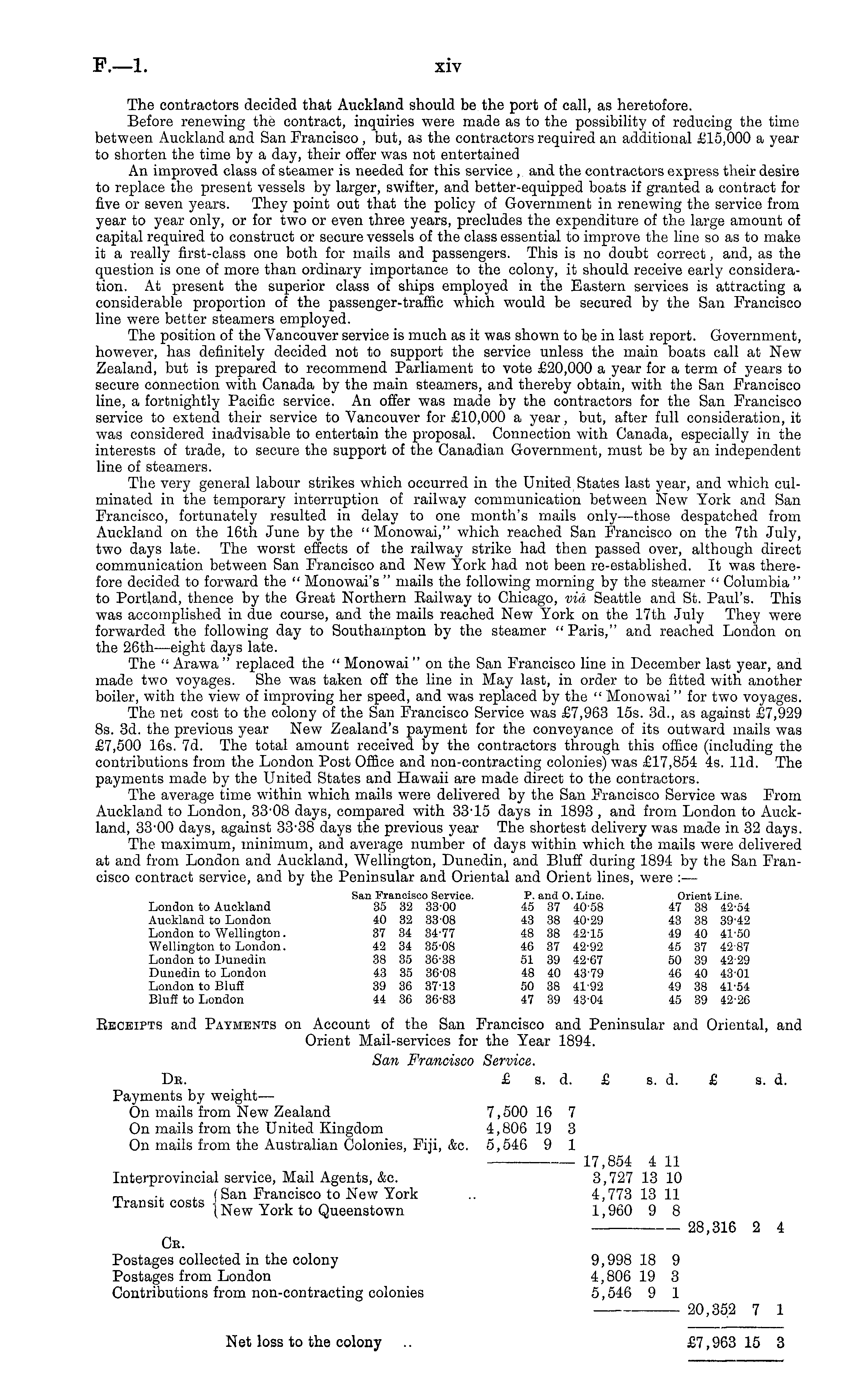 The contractors decided that Auckland should be the port of call, as heretofore. Before renewing the contract, inquiries were made as to the possibility of reducing the time between Auckland and San Francisco, but, as the contractors required an additional £15,000 a year to shorten the time by a day, their offer was not entertained An improved class of steamer is needed for this service , and the contractors express their desire to replace the present vessels by larger, swifter, and better-equipped boats if granted a contract for five or seven years. They point out that the policy of Government in renewing the service from year to year only, or for two or even three years, precludes the expenditure of the large amount of capital required to construct or secure vessels of the class essential to improve the line so as to make it a really first-class one both for mails and passengers. This is no doubt correct, and, as the question is one of more than ordinary importance to the colony, it should receive early consideration. At present the superior class of ships employed in the Eastern services is attracting a considerable proportion of the passenger-traffic which would be secured by the San Francisco line were better steamers employed. The position of the Vancouver service is much as it was shown to be in last report. Government, however, has definitely decided not to support the service unless the main boats call at New Zealand, but is prepared to recommend Parliament to vote £20,000 a year for a term of years to secure connection with Canada by the main steamers, and thereby obtain, with the San Francisco line, a fortnightly Pacific service. An offer was made by the contractors for the San Francisco service to extend their service to Vancouver for £10,000 a year, but, after full consideration, it was considered inadvisable to entertain the proposal. Connection with Canada, especially in the interests of trade, to secure the support of the Canadian Government, must be by an independent line of steamers. The very general labour strikes which occurred in the United States last year, and which culminated in the temporary interruption of railway communication between New York and San Francisco, fortunately resulted in delay to one month's mails only—those despatched from Auckland on the 16th June by the " Monowai," which reached San Francisco on the 7th July, two days late. The worst effects of the railway strike had then passed over, although direct communication between San Francisco and New York had not been re-established. It was therefore decided to forward the " Monowai's " mails the following morning by the steamer " Columbia" to Portland, thence by the Great Northern Eailway to Chicago, via Seattle and St. Paul's. This was accomplished in due course, and the mails reached New York on the 17th July They were forwarded the following day to Southampton by the steamer " Paris," and reached London on the 26th—eight days late. The " Arawa " replaced the " Monowai " on the San Francisco line in December last year, and made two voyages. She was taken off the line in May last, in order to be fitted with another boiler, with the view of improving her speed, and was replaced by the " Monowai" for two voyages. The net cost to the colony of the San Francisco Service was £7,963 15s. 3d., as against £7,929 Bs. 3d. the previous year New Zealand's payment for the conveyance of its outward mails was £7,500 16s. 7d. The total amount received by the contractors through this office (including the contributions from the London Post Office and non-contracting colonies) was £17,854 4s. lid. The payments made by the United States and Hawaii are made direct to the contractors. The average time within which mails were delivered by the San Francisco Service was From Auckland to London, 33-08 days, compared with 33-15 days in 1893 , and from London to Auckland, 33-00 days, against 33-38 days the previous year The shortest delivery was made in 32 days. The maximum, minimum, and average number of days within which the mails were delivered at and from London and Auckland, Wellington, Dunedin, and Bluff during 1894 by the San Francisco contract service, and by the Peninsular and Oriental and Orient lines, were :— San Francisco Service. P. and O, Line. Orient Line. London to Auckland 35 32 33-00 45 37 4058 47 38 42-54 Auckland to London 40 32 3308 43 38 40-29 43 38 39-42 London to Wellington. 37 34 34-77 48 38 42-15 49 40 41-50 Wellington to London. 42 34 35-08 46 37 42-92 45 37 4287 London to Dunedin 38 35 36-38 51 39 42-67 50 39 4229 Dunedin to London 43 35 36-08 48 40 4379 46 40 43-01 London to Bluff 39 36 37-13 50 38 41-92 49 38 41-54 Bluff to London 44 36 36-83 47 39 43-04 45 39 42-26 Receipts and Payments on Account of the San Francisco and Peninsular and Oriental, and Orient Mail-services for the Year 1894. San Francisco Service. Dr. £ s. d. £ s. d. £ s. d. Payments by weight — On mails from New Zealand 7,500 16 7 On mails from the United Kingdom 4,806 19 3 On mails from the Australian Colonies, Fiji, &c. 5,546 9 1 17,854 4 11 Interprovincial service, Mail Agents, &c. 3,727 13 10 „ ~ , jSan Francisco to New York .. 4,773 13 11 iranslt coses {New York to Queenstown 1,960 9 8 — 28,316 2 4 Cr. Postages collected in the colony 9,998 18 9 Postages from London 4,806 19 3 Contributions from non-contracting colonies 5,546 9 1 20,352 7 1 Net loss to the colony .. £7,963 15 3