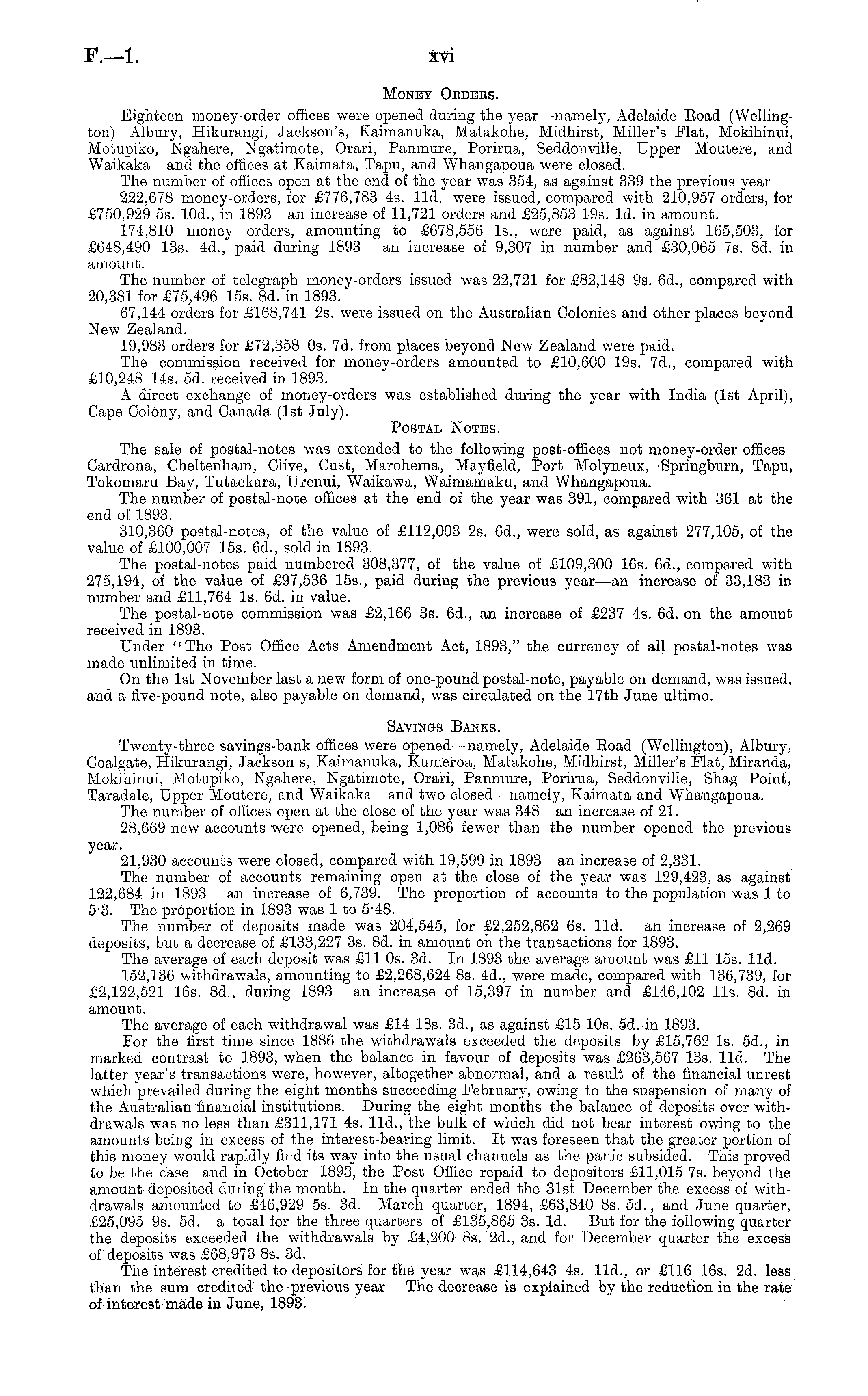 Money Orders. Eighteen money-order offices were opened during the year—namely, Adelaide Road (Wellington) Albury, Hikurangi, Jackson's, Kaimanuka, Matakohe, Midhirst, Miller's Flat, Mokihinui, Motupiko, Ngahere, Ngatimote, Orari, Panmure, Porirua, Seddonville, Upper Moutere, and Waikaka and the offices at Kaimata, Tapu, and Whangapoua were closed. The number of offices open at the end of the year was 354, as against 339 the previous year 222,678 money-orders, for £776,783 4s. lid. were issued, compared with 210,957 orders, for £750,929 ss. 10d., in 1893 an increase of 11,721 orders and £25,853 19s. Id. in amount. 174,810 money orders, amounting to £678,556 Is., were paid, as against 165,503, for £648,490 13s. 4d., paid during 1893 an increase of 9,307 in number and £30,065 7s. Bd. in amount. The number of telegraph money-orders issued was 22,721 for £82,148 9s. 6d., compared with 20,381 for £75,496 15s. Bd. in 1893. 67,144 orders for £168,741 2s. were issued on the Australian Colonies and other places beyond New Zealand. 19,983 orders for £72,358 os. 7d. from places beyond New Zealand were paid. The commission received for money-orders amounted to £10,600 19s. 7d., compared with £10,248 14s. sd. received in 1893. A direct exchange of money-orders was established during the year with India (Ist April), Cape Colony, and Canada (Ist July). Postal Notes. The sale of postal-notes was extended to the following post-offices not money-order offices Cardrona, Cheltenham, Clive, Cust, Marohema, Mayfield, Port Molyneux, Springburn, Tapu, Tokomaru Bay, Tutaekara, Urenui, Waikawa, Waimamaku, and Whangapoua. The number of postal-note offices at the end of the year was 391, compared with 361 at the end of 1893. 310,360 postal-notes, of the value of £112,003 2s. 6d., were sold, as against 277,105, of the value of £100,007 15s. 6d., sold in 1893. The postal-notes paid numbered 308,377, of the value of £109,300 16s. 6d., compared with 275,194, of the value of £97,536 155., paid during the previous year—an increase of 33,183 in number and £11,764 Is. 6d. in value. The postal-note commission was £2,166 3s. 6d., an increase of £237 4s. 6d. on the amount received in 1893. Under "The Post Office Acts Amendment Act, 1893," the currency of all postal-notes was made unlimited in time. On the Ist November last a new form of one-pound postal-note, payable on demand, was issued, and a five-pound note, also payable on demand, was circulated on the 17th June ultimo. Savings Banks. Twenty-three savings-bank offices were opened—namely, Adelaide Road (Wellington), Albury, Coalgate, Hikurangi, Jackson s, Kaimanuka, Kumeroa, Matakohe, Midhirst, Miller's Flat, Miranda, Mokihinui, Motupiko, Ngahere, Ngatimote, Orari, Panmure, Porirua, Seddonville, Shag Point, Taradale, Upper Moutere, and Waikaka and two closed—namely, Kaimata and Whangapoua. The number of offices open at the close of the year was 348 an increase of 21. 28,669 new accounts were opened, being 1,086 fewer than the number opened the previous year. 21,930 accounts were closed, compared with 19,599 in 1893 an increase of 2,331. The number of accounts remaining open at the close of the year was 129,423, as against 122,684 in 1893 an increase of 6,739. The proportion of accounts to the population was Ito 5-3. The proportion in 1893 was Ito 5-48. The number of deposits made was 204,545, for £2,252,862 6s. lid. an increase of 2,269 deposits, but a decrease of £133,227 3s. Bd. in amount oh the transactions for 1893. The average of each deposit was £11 os. 3d. In 1893 the average amount was £11 15s. lid. 152,136 withdrawals, amounting to £2,268,624 Bs. 4d., were made, compared with 136,739, for £2,122,521 16s. Bd., during 1893 an increase of 15,397 in number and £146,102 lis. Bd. in amount. The average of each withdrawal was £14 18s. 3d., as against £15 10s. sd. in 1893. For the first time since 1886 the withdrawals exceeded the deposits by £15,762 Is. 5d., in marked contrast to 1893, when the balance in favour of deposits was £263,567 13s. lid. The latter year's transactions were, however, altogether abnormal, and a result of the financial unrest which prevailed during the eight months succeeding February, owing to the suspension of many of the Australian financial institutions. During the eight months the balance of deposits over withdrawals was no less than £311,171 4s. lid., the bulk of which did not bear interest owing to the amounts being in excess of the interest-bearing limit. It was foreseen that the greater portion of this money would rapidly find its way into the usual channels as the panic subsided. This proved to be the case and in October 1893, the Post Office repaid to depositors £11,015 7s. beyond the amount deposited during the month. In the quarter ended the 31st December the excess of withdrawals amounted to £46,929 ss. 3d. March quarter, 1894, £63,840 Bs. 5d., and June quarter, £25,095 9s. sd. a total for the three quarters of £135,865 3s. Id. But for the following quarter the deposits exceeded the withdrawals by £4,200 Bs. 2d., and for December quarter the excess of deposits was £68,973 Bs. 3d. The interest credited to depositors for the year was £114,643 4s. lid., or £116 16s. 2d. less than the sum credited the previous year The decrease is explained by the reduction in the rate of interest made in June, 1893.