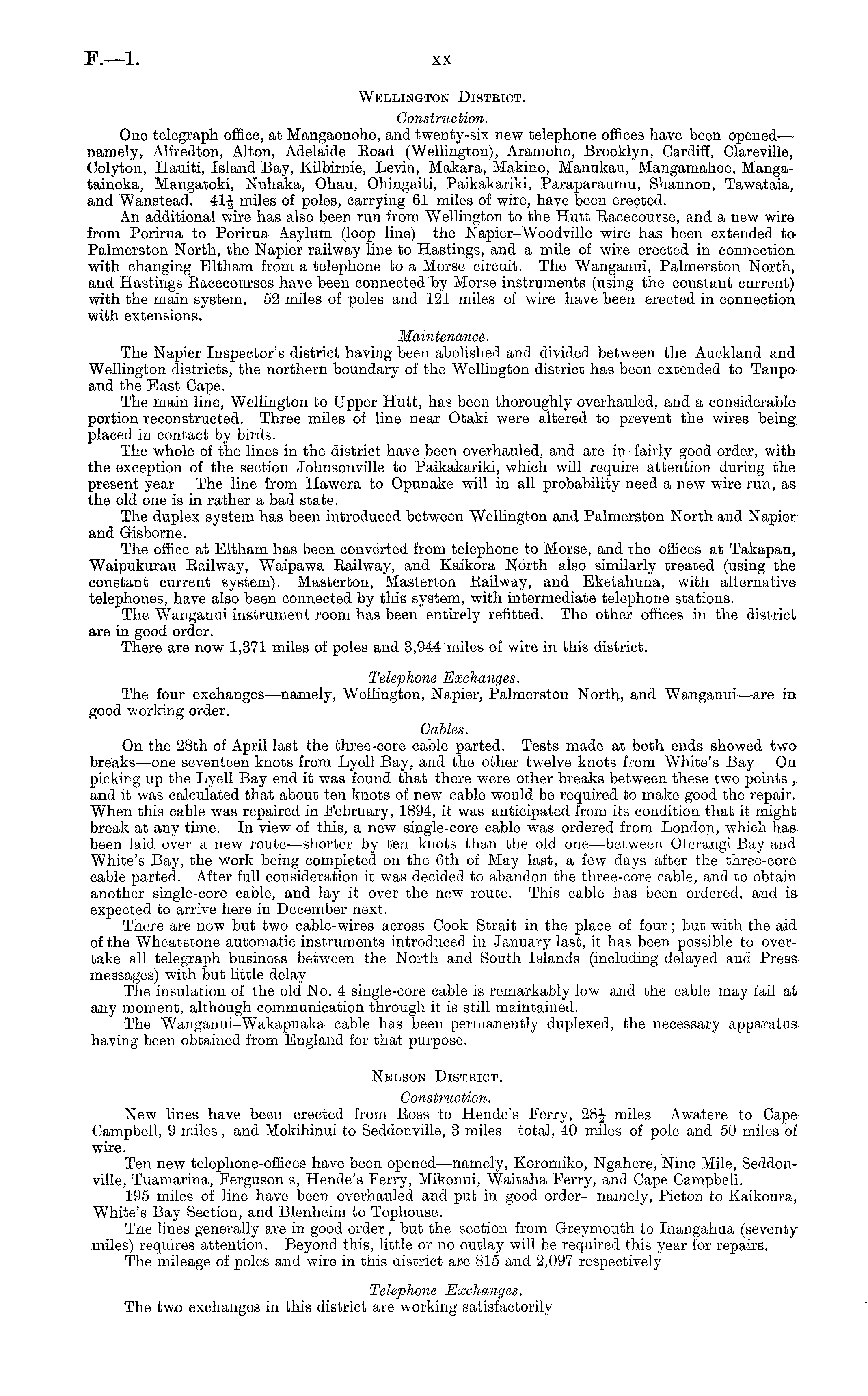 Wellington District. Construction. One telegraph office, at Mangaonoho, and twenty-six new telephone offices have been opened— namely, Alfredton, Alton, Adelaide Road (Wellington), Aramoho, Brooklyn, Cardiff, Clareville, Colyton, Hauiti, Island Bay, Kilbirnie, Levin, Makara, Makino, Manukau, Mangamahoe, Mangatainoka, Mangatoki, Nuhaka, Ohau, Ohingaiti, Paikakariki, Paraparaumu, Shannon, Tawataia, and Wanstead. 41-| miles of poles, carrying 61 miles of wire, have been erected. An additional wire has also been run from Wellington to the Hutt Racecourse, and a new wire from Porirua to Porirua Asylum (loop line) the Napier-Woodville wire has been extended toPalmerston North, the Napier railway line to Hastings, and a mile of wire erected in connection with changing Eltham from a telephone to a Morse circuit. The Wanganui, Palmerston North, and Hastings Eacecourses have been connected by Morse instruments (using the constant current) with the main system. 52 miles of poles and 121 miles of wire have been erected in connection with extensions. Maintenance. The Napier Inspector's district having been abolished and divided between the Auckland and Wellington districts, the northern boundary of the Wellington district has been extended to Taupo and the East Cape, The main line, Wellington to Upper Hutt, has been thoroughly overhauled, and a considerable portion reconstructed. Three miles of line near Otaki were altered to prevent the wires being placed in contact by birds. The whole of the lines in the district have been overhauled, and are in fairly good order, with the exception of the section Johnsonville to Paikakariki, which will require attention during the present year The line from Hawera to Opunake will in all probability need a new wire run, as the old one is in rather a bad state. The duplex system has been introduced between Wellington and Palmerston North and Napier and Gisborne. The office at Eltham has been converted from telephone to Morse, and the offices at Takapau, Waipukurau Railway, Waipawa Railway, and Kaikora North also similarly treated (using the constant current system). Masterton, Masterton Railway, and Eketahuna, with alternative telephones, have also been connected by this system, with intermediate telephone stations. The Wanganui instrument room has been entirely refitted. The other offices in the district are in good order. There are now 1,371 miles of poles and 3,944 miles of wire in this district. Telephone Exchanges. The four exchanges—namely, Wellington, Napier, Palmerston North, and Wanganui—are in good working order. Cables. On the 28th of April last the three-core cable parted. Tests made at both ends showed twobreaks —one seventeen knots from Lyell Bay, and the other twelve knots from White's Bay On picking up the Lyell Bay end it was found that there were other breaks between these two points , and it was calculated that about ten knots of new cable would be required to make good the repair. When this cable was repaired in February, 1894, it was anticipated from its condition that it might break at any time. In view of this, a new single-core cable was ordered from London, which has been laid over a new route—shorter by ten knots than the old one—between Oterangi Bay and White's Bay, the work being completed on the 6th of May last, a few days after the three-core cable parted. After full consideration it was decided to abandon the three-core cable, and to obtain another single-core cable, and lay it over the new route. This cable has been ordered, and is expected to arrive here in December next. There are now but two cable-wires across Cook Strait in the place of four; but with the aid of the Wheatstone automatic instruments introduced in January last, it has been possible to overtake all telegraph business between the North and South Islands (including delayed and Press messages) with but little delay The insulation of the old No. 4 single-core cable is remarkably low and the cable may fail at any moment, although communication through it is still maintained. The Wanganui-Wakapuaka cable has been permanently duplexed, the necessary apparatus having been obtained from England for that purpose. Nelson District. Construction. New lines have been erected from Ross to Hende's Ferry, 28c| miles Awatere to Cape Campbell, 9 miles, and Mokihinui to Seddonville, 3 miles total, 40 miles of pole and 50 miles of wire. Ten new telephone-offices have been opened—namely, Koromiko, Ngahere, Nine Mile, Seddonville, Tuamarina, Ferguson s, Hende's Ferry, Mikonui, Waitaha Ferry, and Cape Campbell. 195 miles of line have been overhauled and put in good order—namely, Picton to Kaikoura, White's Bay Section, and Blenheim to Tophouse. The lines generally are in good order, but the section from Greymouth to Inangahua (seventy miles) requires attention. Beyond this, little or no outlay will be required this year for repairs. The mileage of poles and wire in this district are 815 and 2,097 respectively Telephone Exchanges. The two exchanges in this district are working satisfactorily