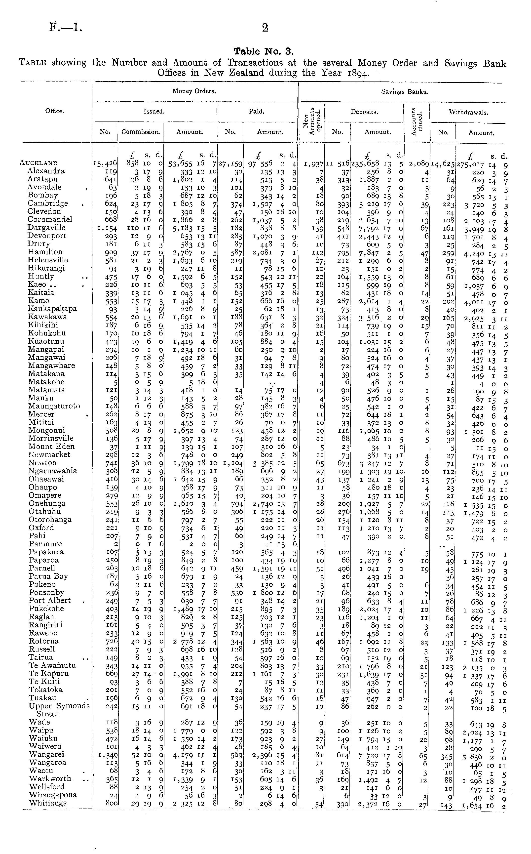 Table No. 3. Table showing the Number and Amount of Transactions at the several Money Order and Savings Bank Offices in New Zealand during the Year 1894.