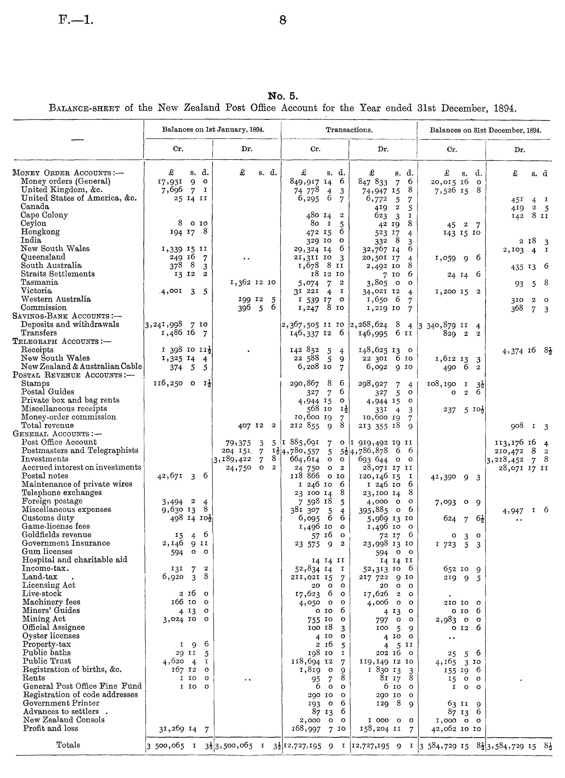 Balances on 1st January, 1894. Transactions. Balances on 31st December, 1894. Or. Dr. Or. Dr. Or. Dr. iIonby Oedeb Accounts :— Money orders (General) United Kingdom, &o. United States of America, &c. Canada Cape Colony Ceylon Hongkong India New South Wales Queensland South Australia Straits Settlements Tasmania Victoria Western Australia Commission Savings-Bank: Accounts :— Deposits and withdrawals Transfers Delegeaph Accounts :— Receipts New South Wales New Zealand & Australian Cable Postal Eevenub Accounts: — Stamps Postal Guides Private box and bag rents Miscellaneous receipts Money-order commission Total revenue 3-ENEBAL Accounts :— Post Office Account Postmasters and Telegraphists Investments Accrued interest on investments Postal notes Maintenance of private wires Telephone exchanges Foreign postage Miscellaneous expenses Customs duty Game-license fees Goldfields revenue Government Insurance Gum licenses Hospital and charitable aid Income-tax. Land-tax Licensing Act Live-stock Machinery fees Miners' Guides Mining Act Official Assignee Oyster licenses Property-tax Public baths Public Trust Registration of births, &c. Bents General Post Office Fine Fund Registration of code addresses Government Printer Advances to settlers . New Zealand Consols Profit and loss £ s. d. 17.931 9 ° 7,696 7 1 25 14 11 8 o 10 194 17 8 £ s. d. £ s. d. £ s. d. 849,917 14 6 847 833 7 6 74 778 4 3 74.947 IS 8 6,295 6 7 6,772 5 7 2 5 480 14 2 623 3 1 80 1 5 42 19 8 472 15 6 523 17 4 329 10 o 332 8 3 29,324 14 6 32i767 H 6 21,311 10 3 20,501 17 4 1,678 8 11 2,492 10 8 18 12 10 7 10 6 5.074 7 2 3.805 o o 31 221 4 1 34,021 12 4 I 539 17 o 1,650 6 7 1,247 8 10 1,219 Io 7 £ s. d. 20,015 16 o 7.526 15 8 45 2 7 143 15 10 £ s. d 451 4 1 419 2 5 142 8 11 2 18 3 2,103 4 1 i>339 15 11 249 16 7 378 8 3 13 12 2 1,059 9 6 435 13 6 1,362 3 2 10 24 14 6 93 5 8 4,001 3 5 199 12 5 396 5 6 1,200 15 2 310 2 o 368 7 3 3,241,998 7 10 1,486 16 7 2.367,505 11 10 2,268,624 8 4 146,337 12 6 146,995 6 11 3 34O.879 11 4 829 2 2 1 1 398 10 11J 1.325 14 4 374 5 5 142 852 5 4 148,625 13 o 22 588 59 22 301 6 10 6,208 10 7 6,092 9 10 1,612 13 3 490 6 2 4.374 16 8J 116,250 o ij 290,867 8 6 298,927 7 4 327 7 6 327 5 o 4.944 I3 o 4.944 I 5 ° 568 10 ij 331 4 3 10,600 19 7 10,600 19 7 212 855 9 8 213 355 18 9 108,190 1 026 237 5 io* 908 1 3 407 12 2 42,671 3 6 3>494 2 4 9,630 13 8 498 14 10J 15 4 6 2,146 9 11 594 o o 131 7 2 6,920 3 8 79.375 3 5 204 151 7 ij 3,189,422 7 8 24,750 o 2 1 885,691 701 919,492 19 11 4.78o,557 5 5*4.786,878 6 6 664,614 o o 693 644 o o 24 750 O 2 28,071 17 II 118 866 o 10 120,146 15 1 1 246 10 6 1 246 10 6 23 100 14 8 23,100 14 8 7 598 18 5 4,000 o o 381 307 5 4 395,885 o 6 6,095 6 6 5,969 13 10 1,496 10 o 1,496 10 o 57 16 o 72 17 6 23 575 9 2 23,998 13 10 594 ° ° 14 14 11 14 14 11 52,-834 14 1 52,313 10 6 211,021 15 7 217 722 9 10 20 o o 20 o o 17,623 6 o 17,626 2 o 4,050 o o 4,006 o o o 10 6 4 13 o 755 Io ° 797 o o 100 18 3 100 5 9 4 10 o 4 10 o 2 16 5 4 5 11 198 10 1 202 16 o 118,694 12 7 119,149 12 10 1,819 09 1 830 13 3 95 7 8 81 17 8 600 6 10 o 41.390 9 3 7.093 o 9 624 7 6J 030 1 723 5 3 652 10 9 219 9 5 113,176 16 4 210,472 8 2 3,218,452 7 8 28,071 17 11 4.947 1 6 2 16 o 166 10 o 4 13 o 3,024 10 o 210 10 o o 10 6 2,983 o o o 12 6 196 29 11 5 4,620 4 1 167 12 o I IO O I IO O 25 5 6 4,165 3 10 155 19 6 15 o o 100 31,269 14 7 290 10 o 290 10 o 193 o 6 129 8 9 87 13 6 2,000 OO I OOO O O 168,997 7 Io 158,204 11 7 63 11 9 87 13 6 1,000 o 0 42,062 10 10 Totals 3 500,065 1 3 i [3,500,065 1 3$ 12,727,195 9 1 12,727,195 9 1 3 584.729 15 Si 3,584,729 15 8J