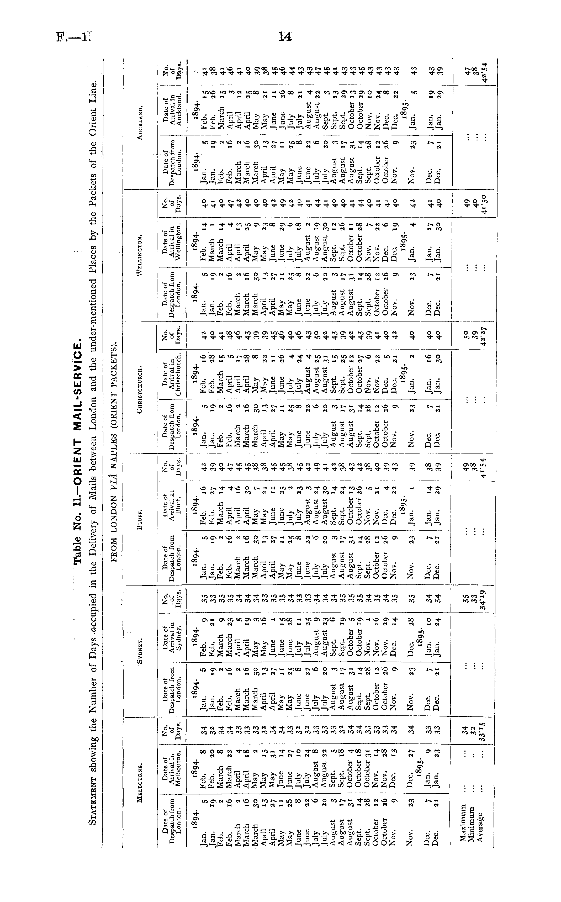 FROM LONDON VlA N. •LES (ORIENT PACKETS). Sydney. Bluff. Christchurch. Wellington. Melbourne. Auckland. Date of Despatch from London. Date of Arrival in Melbourne. No. of Days. Date of Despatch from London. Date of Arrival in Sydney. No. -of Days. Date of Despatch from London. Date of Arrival at Bluff. No. of Days. Date of Despatch from London. Date of Arrival in Christchurch. No. of Days. Date of Despatch from London. Date of Arrival in Wellington. No. of Days. Date of Despatch from London. Date of Arrival in Auckland. No. of Days. I8 94 . Jan. s Jan. 19 Feb. 2 Feb. 16 March 2 March 16 March 30 April 13 April 27 May 11 May 25 June 8 June 22 July 6 J uly 20 August 3 August 17 August 31 Sept. 14 Sept. 28 October 12 October 26 Nov. 9 1894. Feb. 8 Feb. 20 March 8 March 22 April 4 April 18 May 2 May 15 May 31 June 14 June 27 July 10 July 24 August 8 August 22 Sept. s Sept. 18 October 4 October 18 October 3 1 Nov. 14 Nov. 28 Dec. 13 34 34 34 33 33 33 32 34 34 33 32 32 33 33 33 32 34 34 33 33 33 34 1894. Jan. 5 Jan. 19 Feb. 2 Feb. 16 March 2 March 16 March 30 April 13 April 27 May 11 May 25 June 8 June 22 July 6 July 20 August 3 August 17 August 3 1 Sept. 14 Sept. 28 October 12 October 26 Nov. 9 1894. Feb. 9 Feb. 2 1 March 9 March 23 April 5 April 19 May 3 May 16 June 1 June 15 June 28 July 11 July 25 August 9 August 23 Sept. 6 Sept. 19 October 5 October 19 Nov. 1 Nov. 16 Nov. 29 Dec. 14 35 33 35 35 34 34 34 33 35 35 34 33 33 34 34 34 33 35 35 34 35 34 35 1894. Jan. 5 Jan. 19 I Feb. 2 ! Feb. 16 March 2 March 16 March 30 April 13 April 27 May 11 May 25 June 8 June 22 July 6 July 20 August 3 August 17 August 31 Sept. 14 Sept. 28 October 12 October 26 | Nov. 9 I 1894. Feb. 16 Feb. 27 March 14 April 4 April 16 April 30 May 7 May 2 1 June 11 June 25 July 2 July 23 August 3 August 24 August 30 Sept. 14 Sept. 24 October 13 October 26 Nov. 5 Nov. 2 1 Dec. 4 Dec. 22 1895. 42 39 40 47 45 45 38 38 45 45 38 45 42 49 4' 42 38 43 42 38 40 39 43 1894. Jan. 5 Jan. 19 Feb. 2 Feb. 16 March 2 March 16 March 30 April 13 April 27 May 11 May 25 June 8 June 22 July 6 July 20 August 3 August 17 August 31 Sept. 14 Sept. 28 October 12 October 26 Nov. 9 1894. Feb. 16 Feb. 28 March 15 April 5 April 17 April 28 May 8 May 22 June 11 June 26 July 4 July 24 August 4 August 25 August 31 Sept. 15 Sept. 25 October 12 October 27 Nov. 6 Nov. 22 Dec. 5 Dec. 2 1 1895. 42 40 41 48 46 43 39 39 46 40 46 43 5° 42 43 39 42 43 39 4i 40 42 1894. Jan. 5 Jan. 19 Feb. 2 Feb. 16 March 2 March 16 March 30 April 13 April 27 May 11 May 25 June 8 June 22 July 6 July 20 August 3 August 17 August 31 Sept. 14 Sept. 28 October 12 October 26 Nov. 9 1894. Feb. 14 March 1 March 14 April 4 April 13 April 25 May 9 May 23 June 8 June 29 July 6 July 18 August 2 August 19 August 30 Sept. 12 Sept. 26 October 11 October 28 Nov. 7 Nov. 22 Dec. 6 Dec. 19 1895. 40 4' 40 47 42 40 40 40 42 49 42 4° 4' 44 41 40 40 41 44 40 41 4 r 40 1894. Jan. 5 Jan. 19 Feb. 2 Feb. 16 March 2 March 16 March 30 April 13 April 27 May 11 May 25 June 8 June 22 July 6 July 20 August 3 August 17 August 31 Sept. 14 Sept. 28 October 12 October 26 Nov. 9 1894. Feb. 15 Feb. 26 March 15 April 3 April 12 April 25 May 8 May 21 June 11 June 26 July 8 July 21 August 4 August 22 Sept. 3 Sept. 13 Sept. 29 October 13 October 29 Nov. 1 o Nov. 24 Dec. 8 Dec. 22 1895. 4 1 4> 46 41 40 39 38 45 46 44 43 43 47 45 41 43 43 45 43 43 43 43 Nov. 23 Dec. 27 1895. 34 Nov. 23 Dec. 28 1895. 35 Nov. 23 I Jan. 1 39 Nov. 23 Jan. 2 40 Nov. 23 Jan. 4 42 Nov. 23 Jan. s 43 Dec. 7 Dec. 2 1 Jan. 9 Jan. 23 33 33 Dec. 7 Dec. 2 1 Jan. 10 Jan. 24 34 34 Dec. 7 I Dec. 21 Jan. 14 Jan. 29 38 39 Dec. 7 Dec. 2 1 Jan. 16 Jan. 30 40 40 Dec. 7 Dec. 2 1 Jan. 17 Jan. 30 4' 40 Dec. 7 Dec. 2 1 Jan. 19 Jan. 29 43 39 Maximum Minimum Average 34 32 33''S 35 33 34">9 49 38 4''54 5° 39 42-27 49 40 4''5° 47 38 42'54
