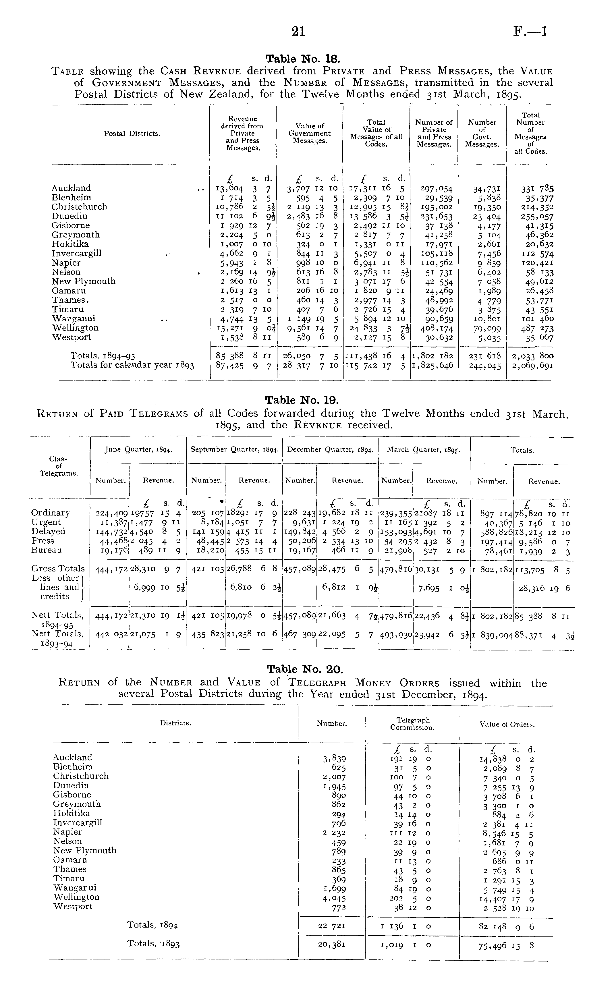 Number. Telegraph Commission. Districts. Value of Orders. Auckland Blenheim Christchurch Dunedin Gisborne Greymouth Hokitika Invercargill Napier Nelson New Plymouth Oamaru Thames Timaru Wanganui Wellington Westport 3,839 625 2,007 1,945 890 862 294 796 2 232 459 789 233 865 369 1,699 4>°45 772 £ e. , d. 191 19 o 31 5 o 100 7 o 97 5 o 44 10 o 43 2 o 14 14 o 39 16 o in 12 o 22 19 O 39 9 o 11 13 o 43 5 o 18 9 o 84 19 o 202 5 o 38 12 o "~ £ s. d. ~ 14,838 o 2 2,089 8 7 7 34° ° 5 7 255 13 9 3 708 6 1 3 300 1 o 884 4 6 2 381 4 II 8,546 15 5 1,681 7 9 2 695 9 9 686 on 2 763 8 1 1 291 15 3 5 749 15 4 14,407 17 9 2 528 19 10 Totals, 1894 22 721 1 136 1 o 82 148 9 6 Totals, 1893 20,381 1,019 I O 75,496 15 8